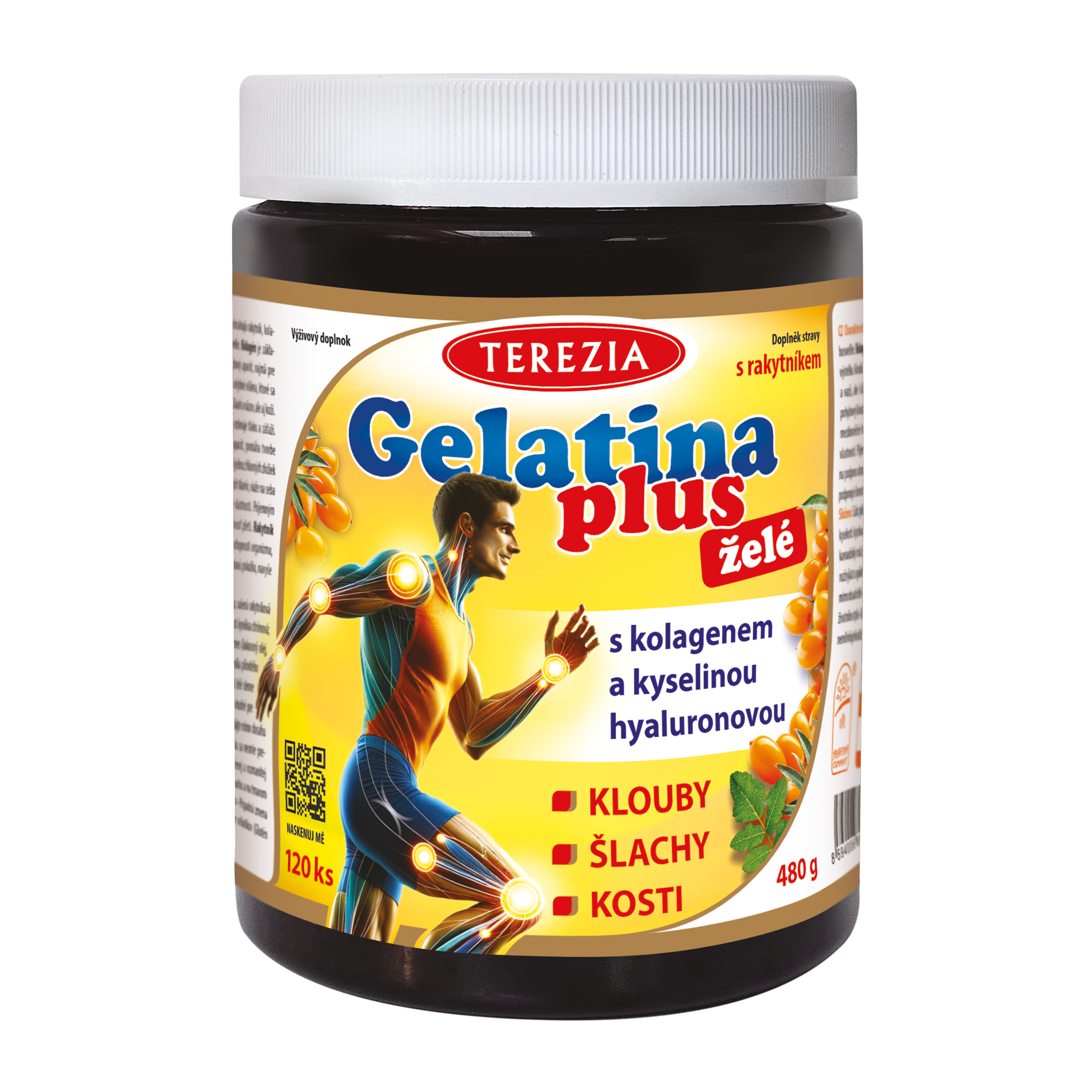 Terezia Gelatina plus želé je novinkou ve formě želé pro podporu pohybového aparátu díky jedinečné kombinaci rakytníku, kolagenu, kyseliny hyaluronové a extraktu boswellie. Kolagen hraje klíčovou roli v podpoře pohybového aparátu, zejména kloubů, šlach a vazů, kde zajišťuje pevnost a pružnost. Boswellia přispívá k tvorbě kolagenu a podporuje zdraví kloubů. Kyselina hyaluronová (HA) tvoří jednu z hlavních složek mezibuněčné hmoty, je součástí pojivových tkání, váže na sebe vodu, vykazuje viskoelastické a lubrikační vlastnosti. Rakytník podporuje obranyschopnost organismu, snižuje únavu a podporuje zdraví pokožky, srdce i trávicího traktu.