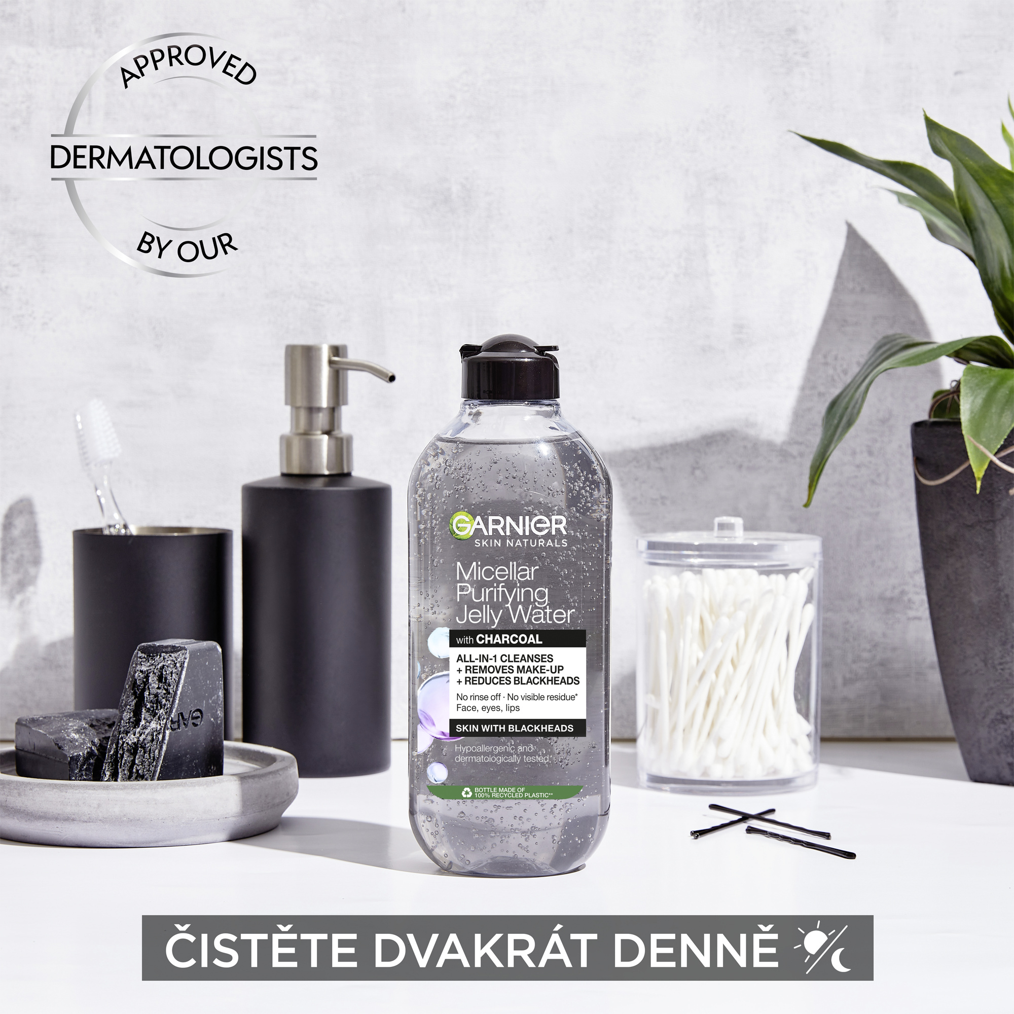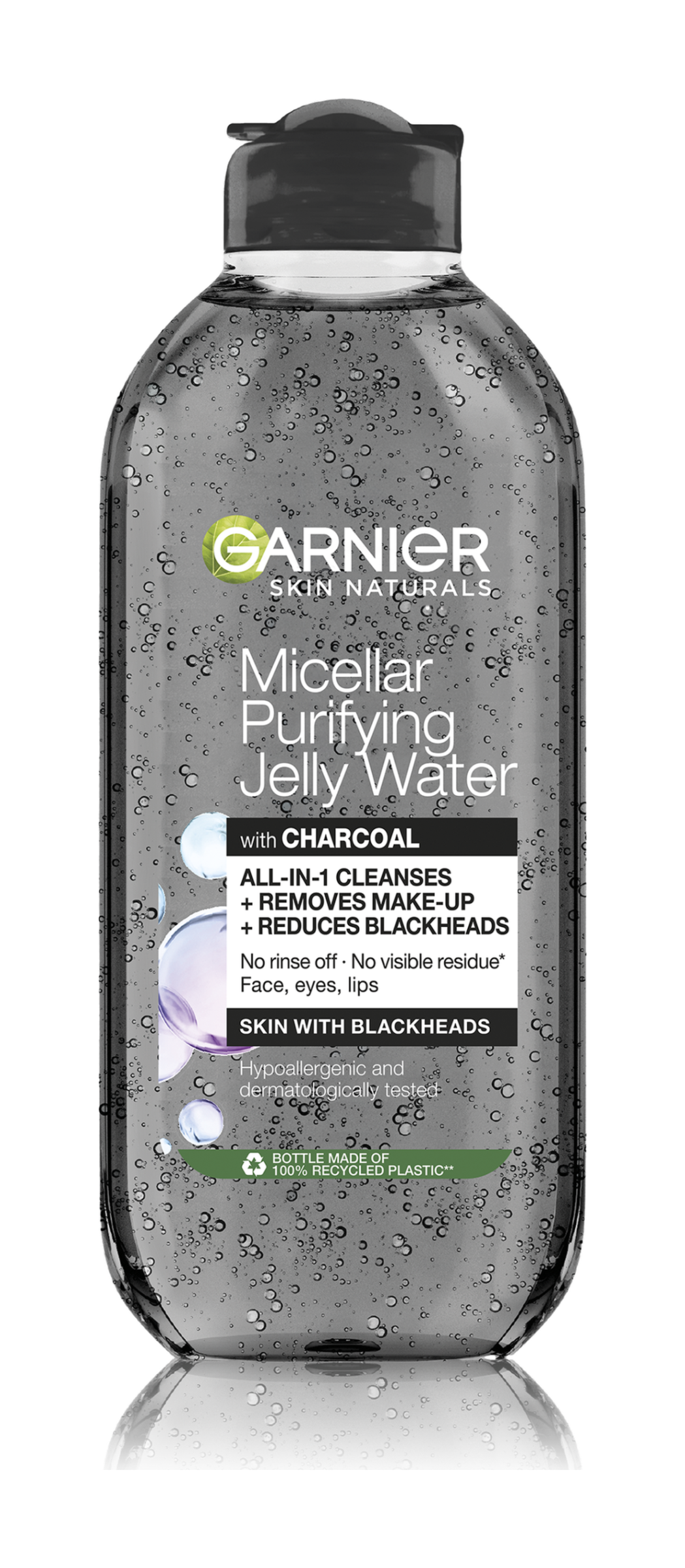 Micelární voda obohacená o aktivní uhlí a kyselinu salicylovou pomáhá vyčistit pleť, redukovat nedokonalosti a odstranit černé tečky. Obsahuje micely, které přitáhnou nečistoty a maz jako magnet a bez tření je odstraní spolu s make-upem.