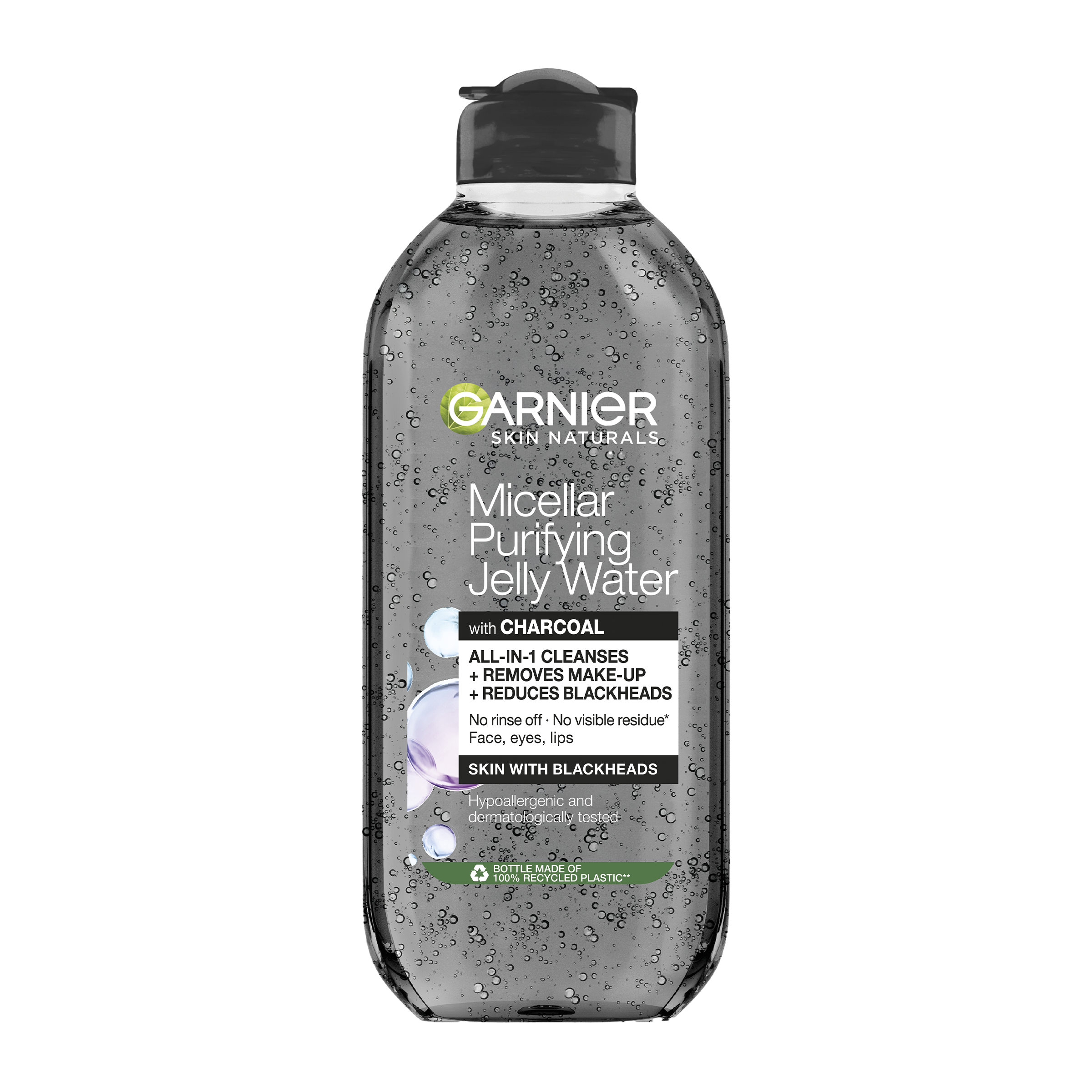 Micelární voda obohacená o aktivní uhlí a kyselinu salicylovou pomáhá vyčistit pleť, redukovat nedokonalosti a odstranit černé tečky.