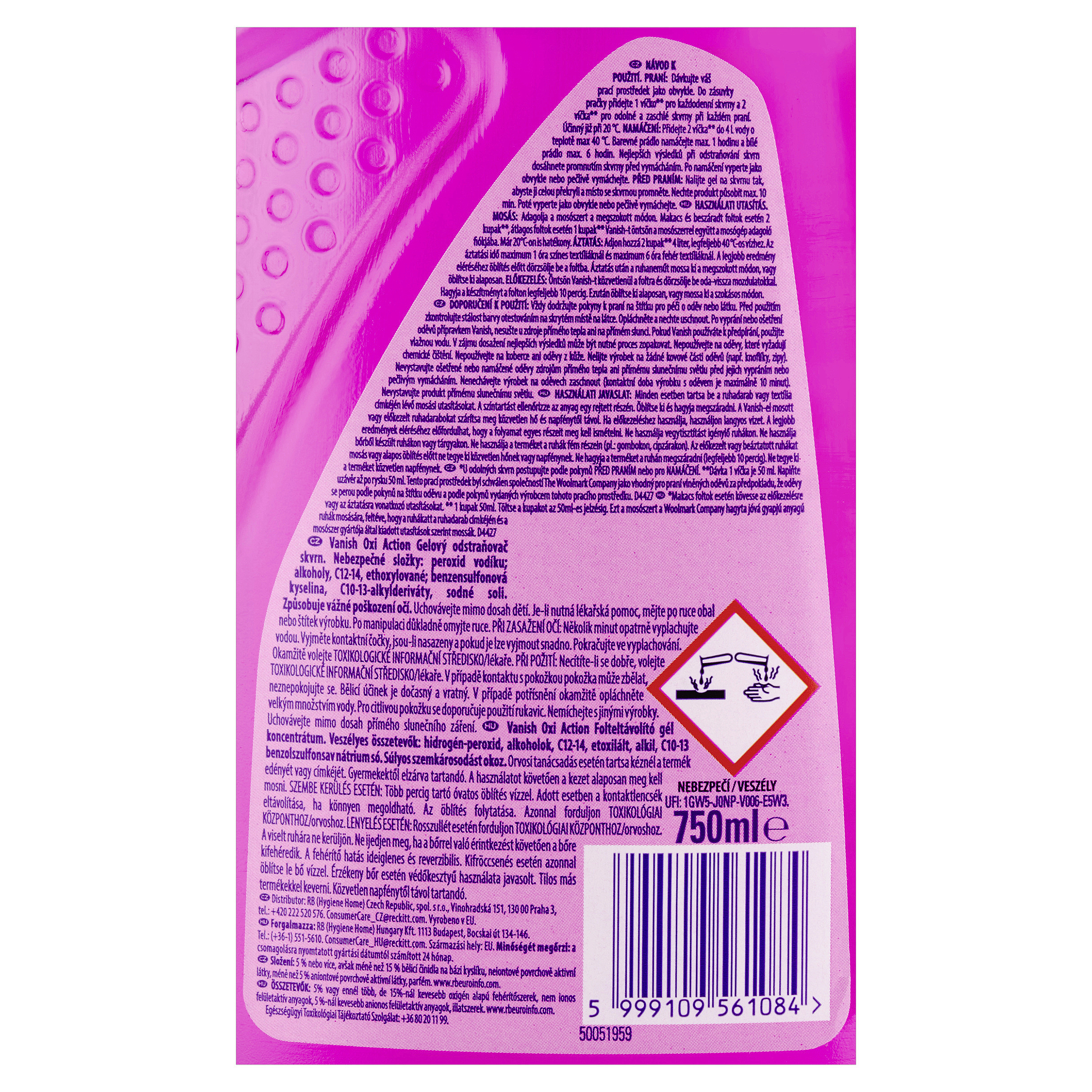 NEBEZPEČÍ Vanish Oxi Action Gelový odstraňovač skvrn. Nebezpečné složky: peroxid vodíku; alkoholy, C12-14, ethoxylované; benzensulfonová kyselina, C10-13-alkylderiváty, sodné soli. Způsobuje vážné poškození očí. Uchovávejte mimo dosah dětí. Je-li nutná lékařská pomoc, mějte po ruce obal nebo štítek výrobku. Po manipulaci důkladně omyjte ruce. PŘI ZASAŽENÍ OČÍ: Několik minut opatrně vyplachujte vodou. Vyjměte kontaktní čočky, jsou-li nasazeny a pokud je lze vyjmout snadno. Pokračujte ve vyplachování. Okamžitě volejte TOXIKOLOGICKÉ INFORMAČNÍ STŘEDISKO/lékaře. PŘI POŽITÍ: Necítíte-li se dobře, volejte TOXIKOLOGICKÉ INFORMAČNÍ STŘEDISKO/lékaře. V případě kontaktu s pokožkou pokožka může zbělat, neznepokojujte se. Bělicí účinek je dočasný a vratný. V případě potřísnění okamžitě opláchněte velkým množstvím vody. Pro citlivou pokožku se doporučuje použití rukavic. Nemíchejte s jinými výrobky.