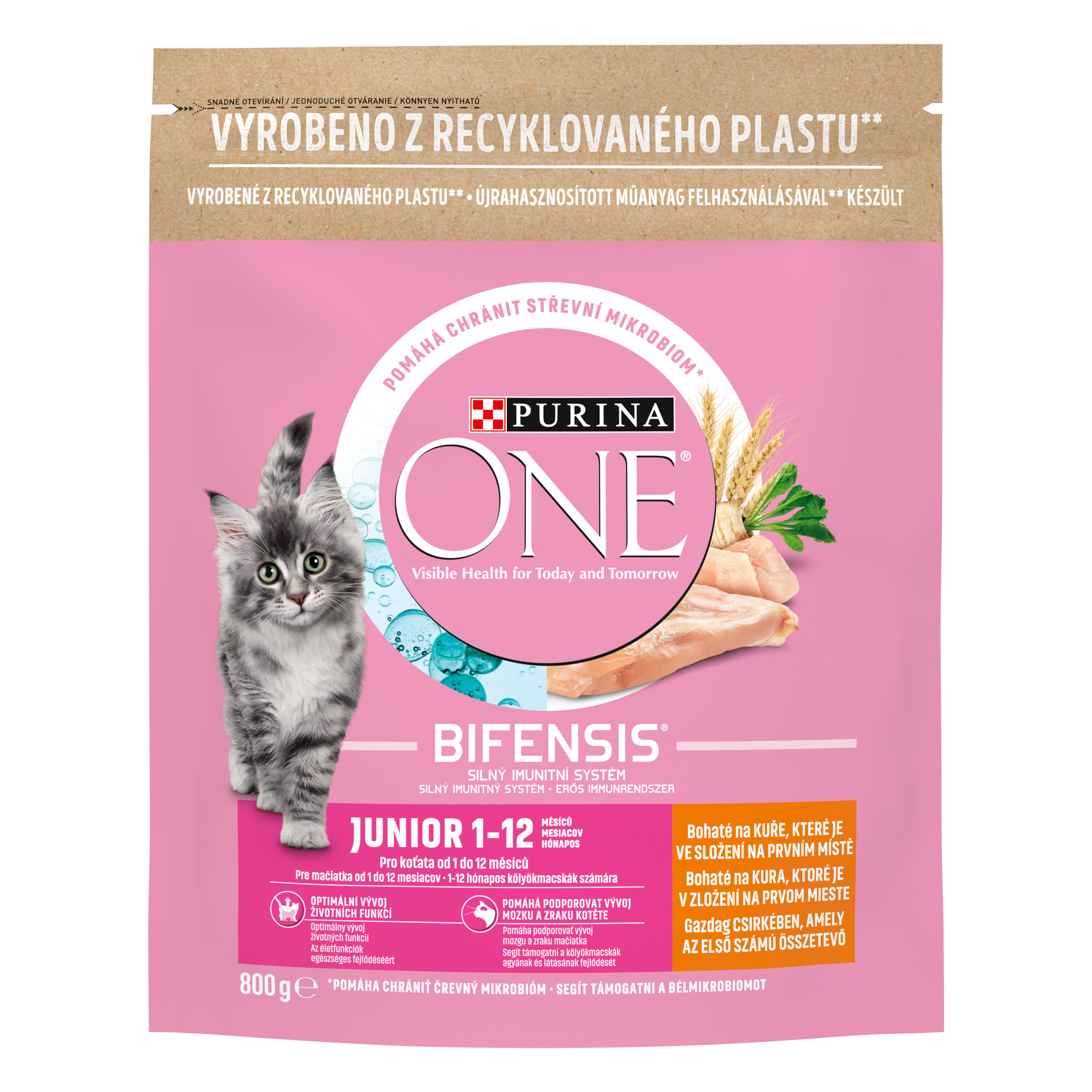 VIDITELNÉ ZDRAVÍ DNES I ZÍTRA Purina ONE Junior je receptura speciálně navržená pro výživové potřeby koťat (od odstavení do 12 měsíců) a pro březí a kojící kočky. Pro zdraví vaší kočky je nezbytný vyvážený střevní mikrobiom. Ten má přímý dopad na její imunitní systém. Mikrobiom je tvořen biliony mikroorganismů, které žijí ve střevech a jsou pro každou kočku unikátní. Rovnováha mikroorganismů je důležitá pro dobré zažívání a má pozitivní vliv na imunitní systém a celkovou pohodu vaší kočky. PURINA ONE BIFENSIS je vyvážená receptura s prospěšnými bakteriemi - laktobacily, u kterých je vědecky prokázáno, že posilují imunitní systém vaší kočky uvnitř i navenek a pomáhají chránit zdravý střevní mikrobiom