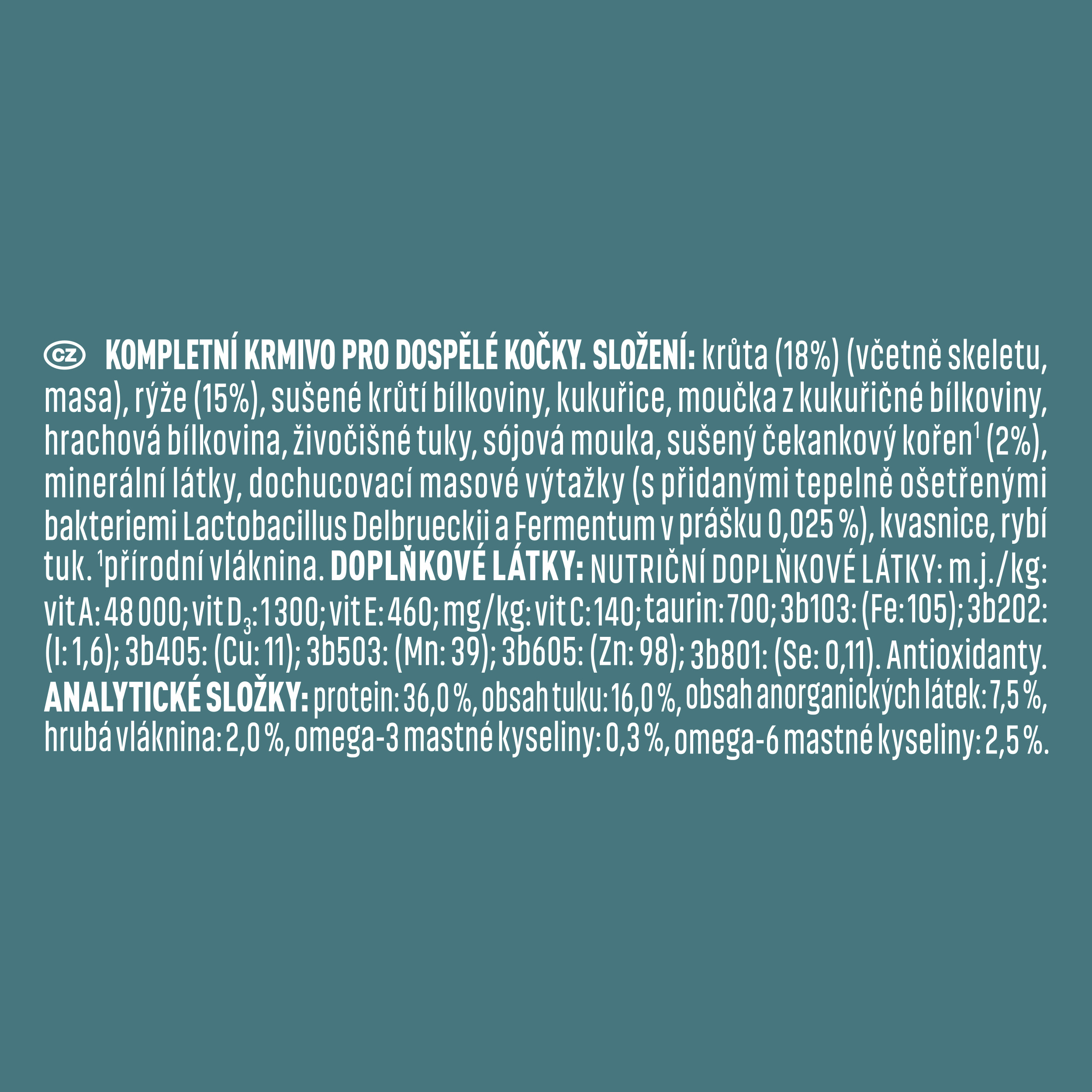 Krůta (18 %) (včetně skeletu, masa, kůže), rýže (15 %), sušené krůtí bílkoviny, kukuřice, moučka z kukuřičné bílkoviny, hrachová bílkovina, živočišné tuky, sójová mouka, sušený čekankový kořen* (2 %), minerální látky, dochucovací masové výtažky (s přidanými tepelně ošetřenými bakteriemi Lactobacillus Delbrueckii a Fermentum v prášku 0,025 %), sušené kvasnice, rybí tuk