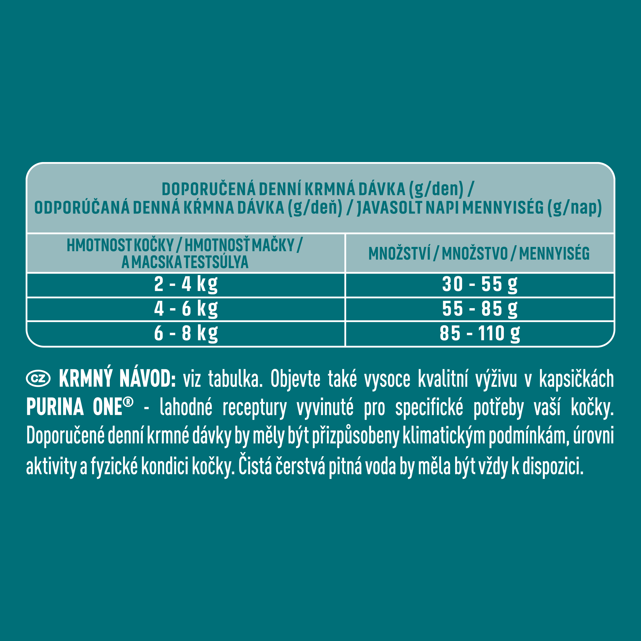 Krmný návod: viz tabulka. Objevte také vysoce kvalitní výživu v kapsičkách Purina ONE - lahodné receptury vyvinuté pro specifické potřeby vaší kočky. Doporučené denní krmné dávky by měly být přizpůsobeny klimatickým podmínkám, úrovni aktivity a fyzické kondici kočky. Čistá čerstvá pitná voda by měla být vždy k dispozici.