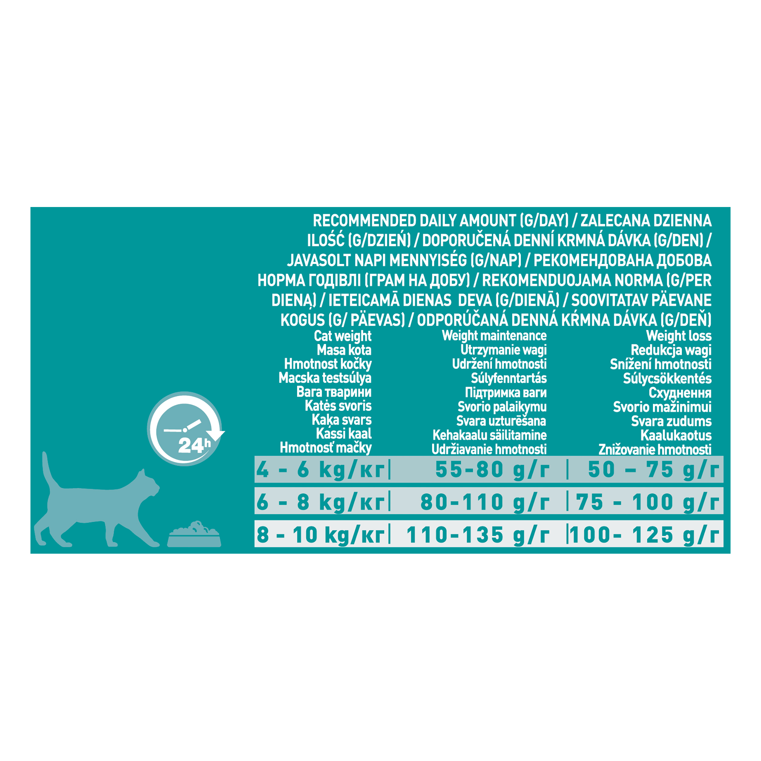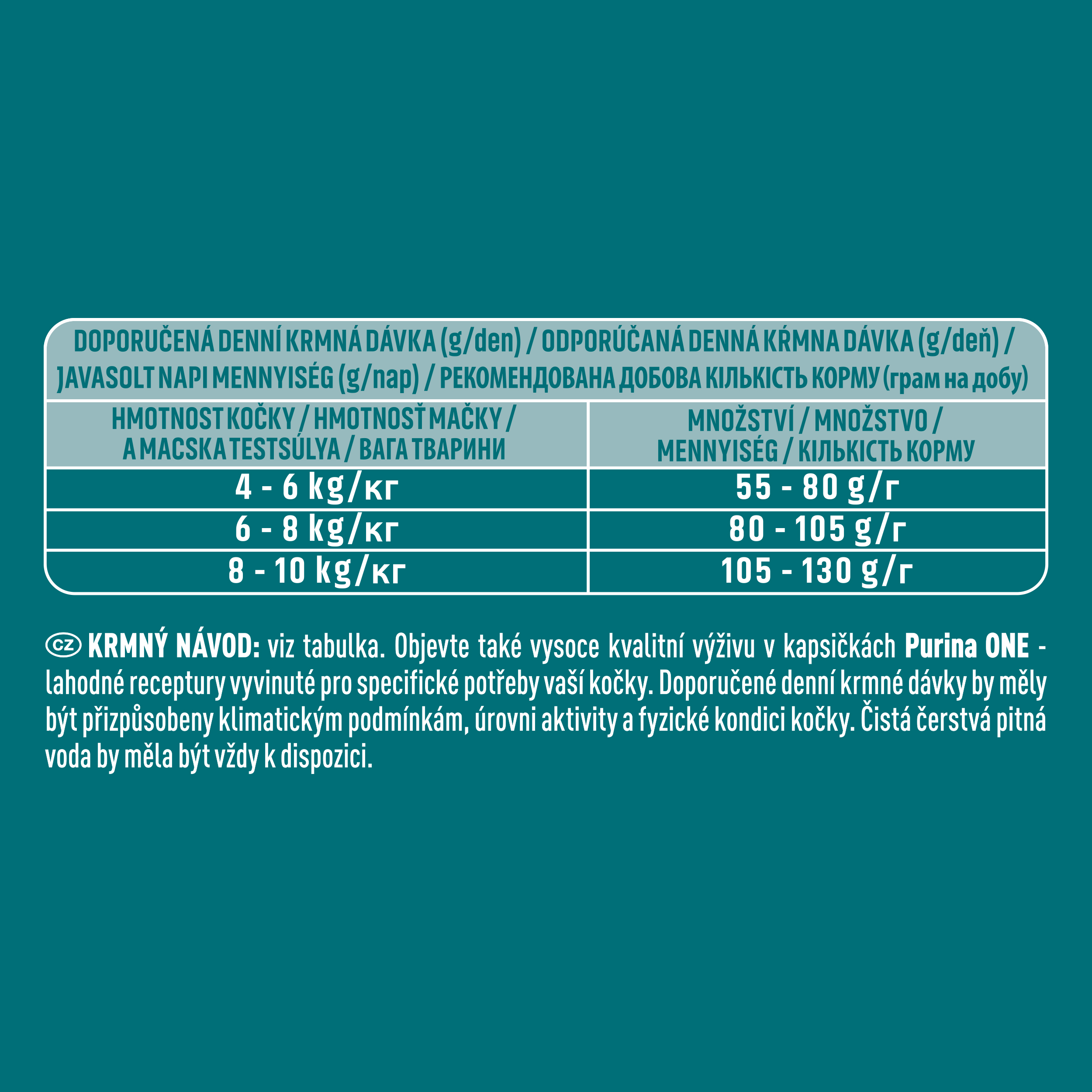Krmný návod: Doporučená denní krmná dávka (g/den): hmotnost kočky 4-6 kg: 55-80 g, hmotnost kočky 6-8 kg: 80-110 g, hmotnost kočky 8-10 kg: 110-135 g. Objevte také vysoce kvalitní výživu v kapsičkách Purina ONE - lahodné receptury vyvinuté pro specifické potřeby vaší kočky. Doporučené denní krmné dávky by měly být přizpůsobeny klimatickým podmínkám, úrovni aktivity a fyzické kondici kočky. Čistá čerstvá pitná voda by měla být vždy k dispozici.