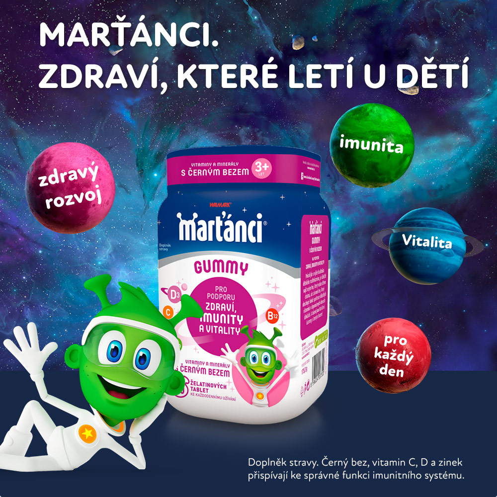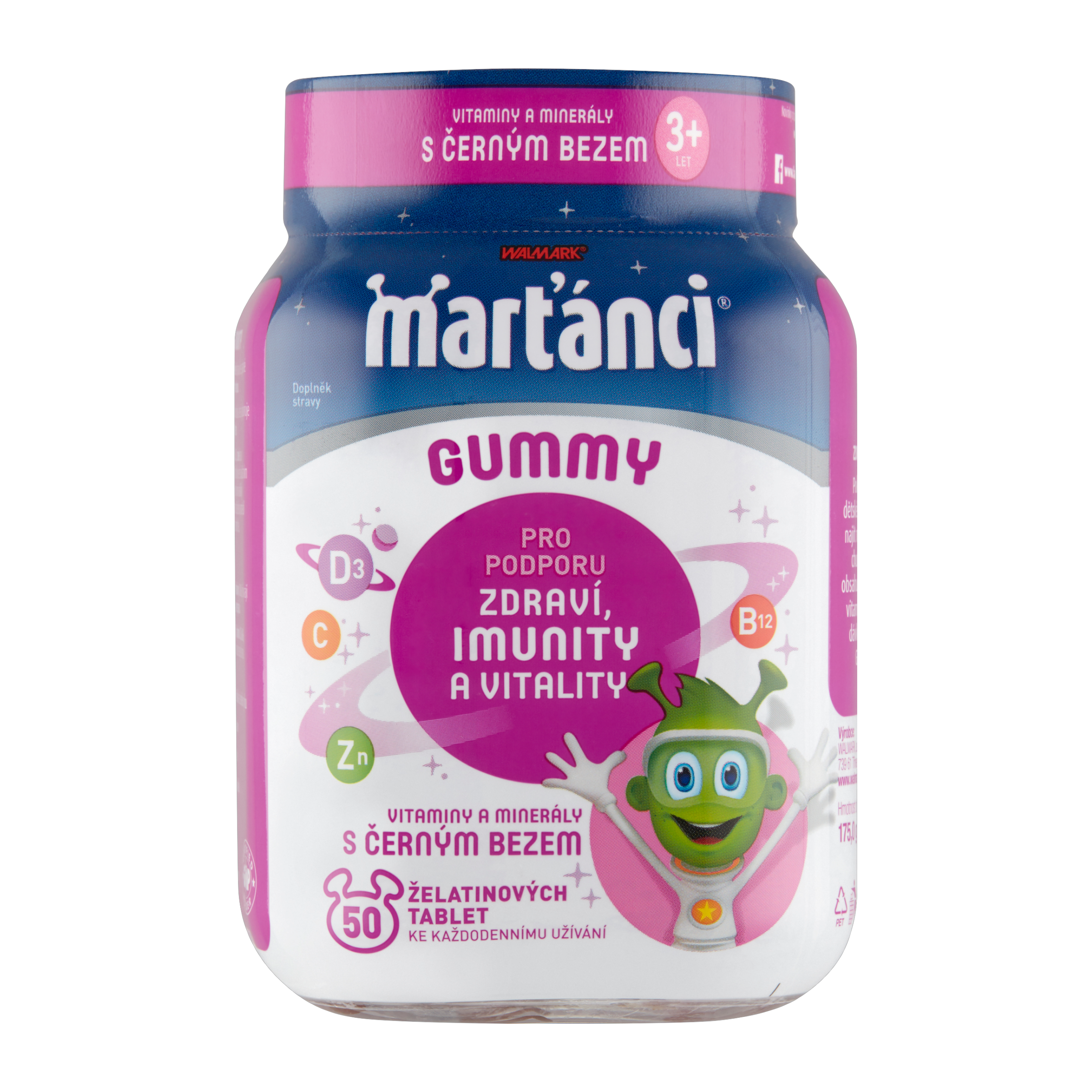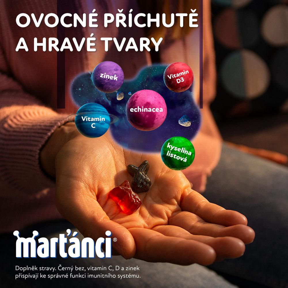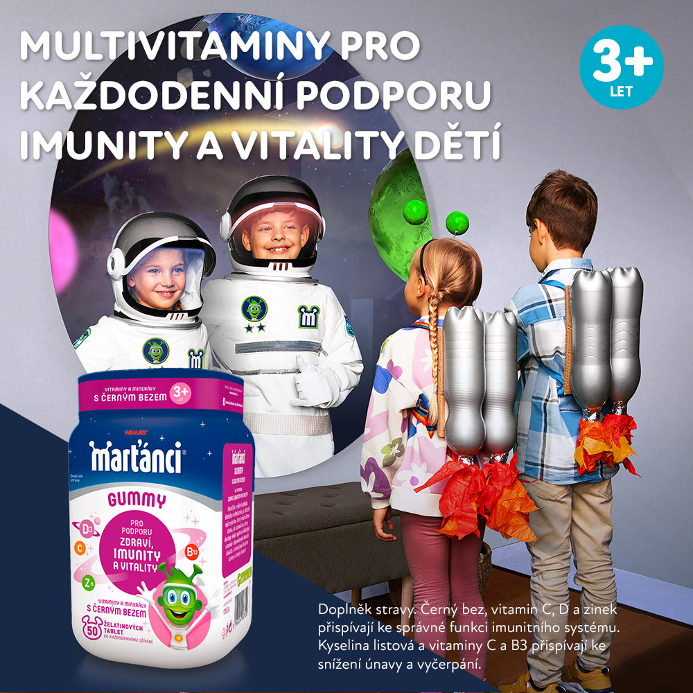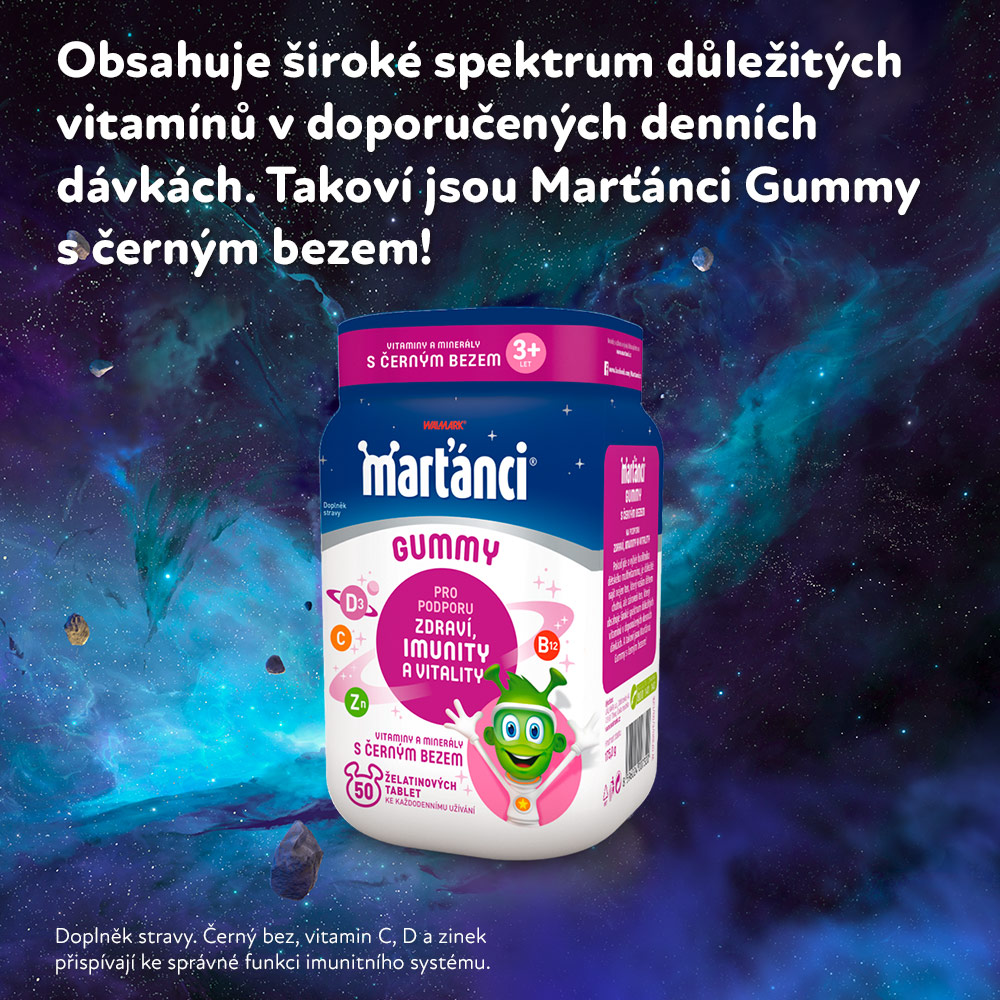 Marťánci Gummy vitaminy a minerály s černým bezem v želatinových tabletách představují doplněk stravy na podporu zdraví, imunity a vitality dětí. Pokud jde o výběr kvalitního dětského multivitaminu, je důležité najít nejen ten, který vašim dětem chutná, ale zároveň ten, který obsahuje široké spektrum důležitých vitaminů v doporučených denních dávkách. A takoví jsou Marťánci Gummy s černým bezem! Vitamin C, D₃ a zinek přispívají ke správné funkci imunitního systému. Černý bez je tradiční rostlina, která podporuje zdravý imunitní systém. Černý bez, vitamin C, E a zinek jsou antioxidanty chránící buňky před oxidačním stresem způsobeným volnými radikály vznikajícími vlivem znečištěného prostředí či vlastním metabolizmem těla. Kyselina listová a vitaminy C a B₃ přispívají ke snížení únavy a vyčerpání. Biotin (vitamin B7), vitamin C, B₃ a B₁₂ přispívají ke správnému energetickému metabolizmu.