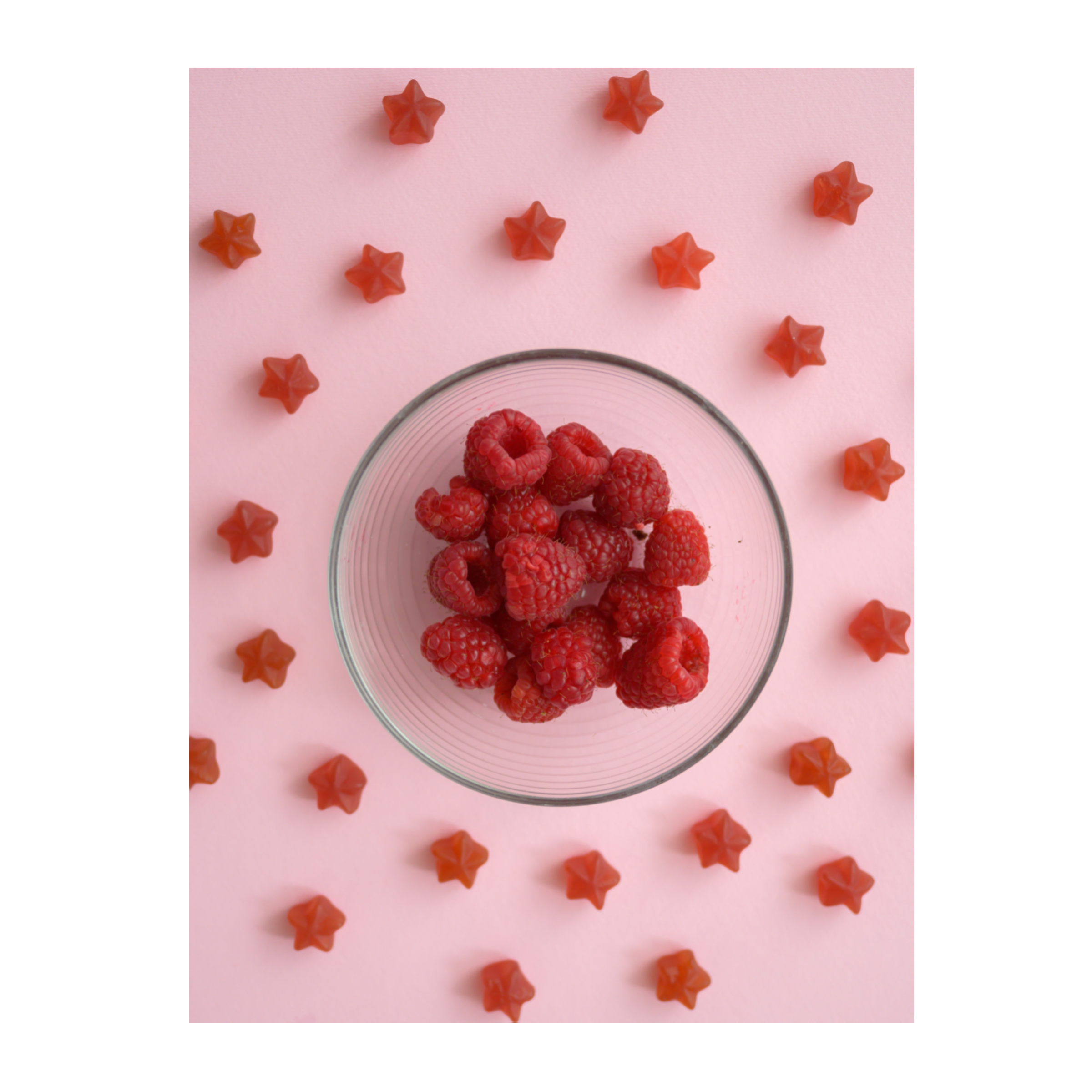 Glukózový sirup, cukr, voda, želírující látka (pektiny), regulátor kyselosti (kyselina citronová), vitamín C (kyselina L-askorbová) - 20 mg (25 %*), vitamín E (DL–alfa-tokoferylacetát) - 7,4 mg (61,7 %*), maltodextrin, barvivo (antokyaniny), regulátor kyselosti (citrany sodné), kokosový olej, přírodní aroma, zinek (citran zinečnatý) - 2,7 mg (27 %*), kyselina pantothenová (D-pantothenát vápenatý) - 5,2 mg (86,7 %*), biotin (D-biotin) - 5000 µg (10 000 %*), vitamín A (retinyl-acetát) - 315 µg (39,4 %*), vitamín B6 (pyridoxin hydrochlorid) - 2 mg (142,9 %*), vitamín D2 (ergokalciferol) - 5 µg (100 %*), vitamín B12 (kyanokobalamin) - 6 µg (240 %*), protihrudkující látka (karnaubský vosk), kyselina listová - 260 µg (130 %*), cholin bitartrát - 0,04 mg (**), jód (jodid draselný) - 42 µg (28 %*), inozitol - 0,04 mg (**).