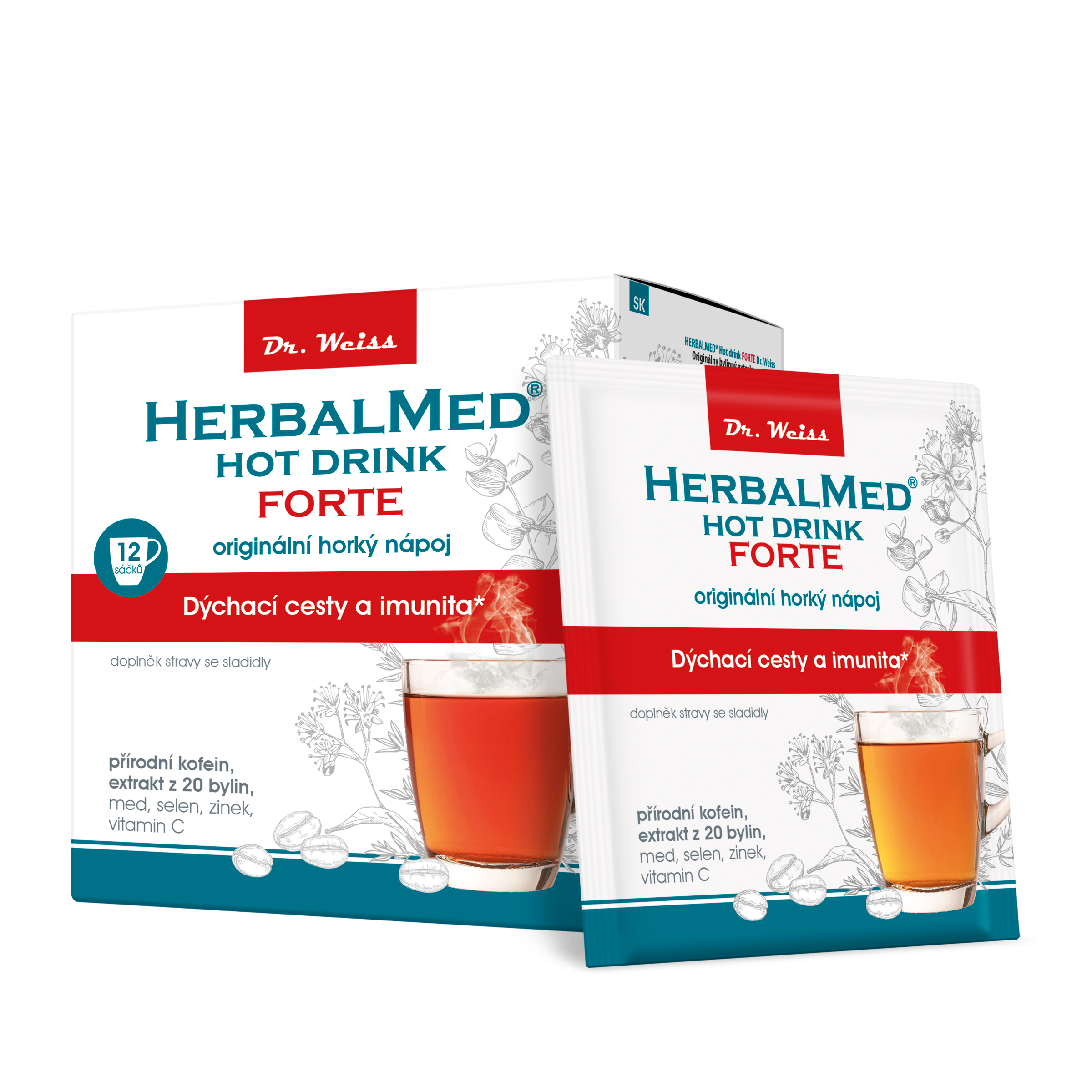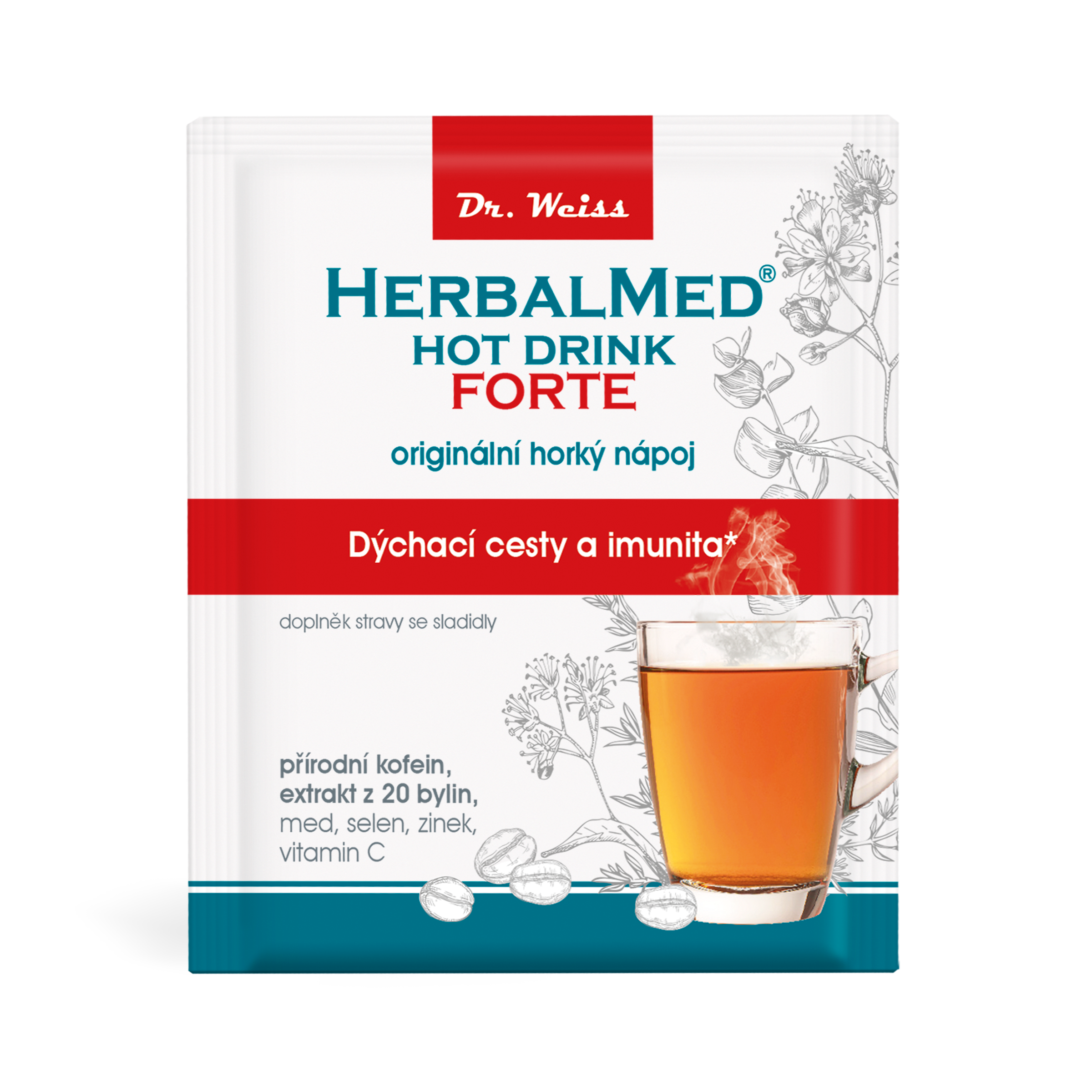 HERBALMED® Hot drink FORTE Dr. Weiss obsahuje unikátní kombinaci 20 extraktů z léčivých bylin, vitamin C, zinek, selen, med a kofein. Díky přírodnímu složení je HERBALMED® Hot drink možné kombinovat s ostatními přípravky (vhodné např. jako doplněk při užívání antibiotik nebo analgetik). HERBALMED® Hot drink FORTE Dr. Weiss obsahuje unikátní kombinaci 20 extraktů z léčivých bylin, vitamin C, zinek, selen, med a kofein, která: - podporuje normální funkci dýchacího systému (1,4,5,8-14) - uvolňuje dýchací cesty (1,4,5,9,10) - napomáhá přirozené obranyschopnosti (1-4,6-8,11,13-14) Přírodní kofein podporuje nástup účinku, potlačuje příznaky únavy, přispívá ke zvýšení výkonu a pomáhá zlepšit koncentraci. Bez umělých barviv. Bez umělých aromat. Bez umělých sladidel. Bez chemických konzervantů. Proč zvolit HERBALMED® Hot drink FORTE Dr. Weiss?