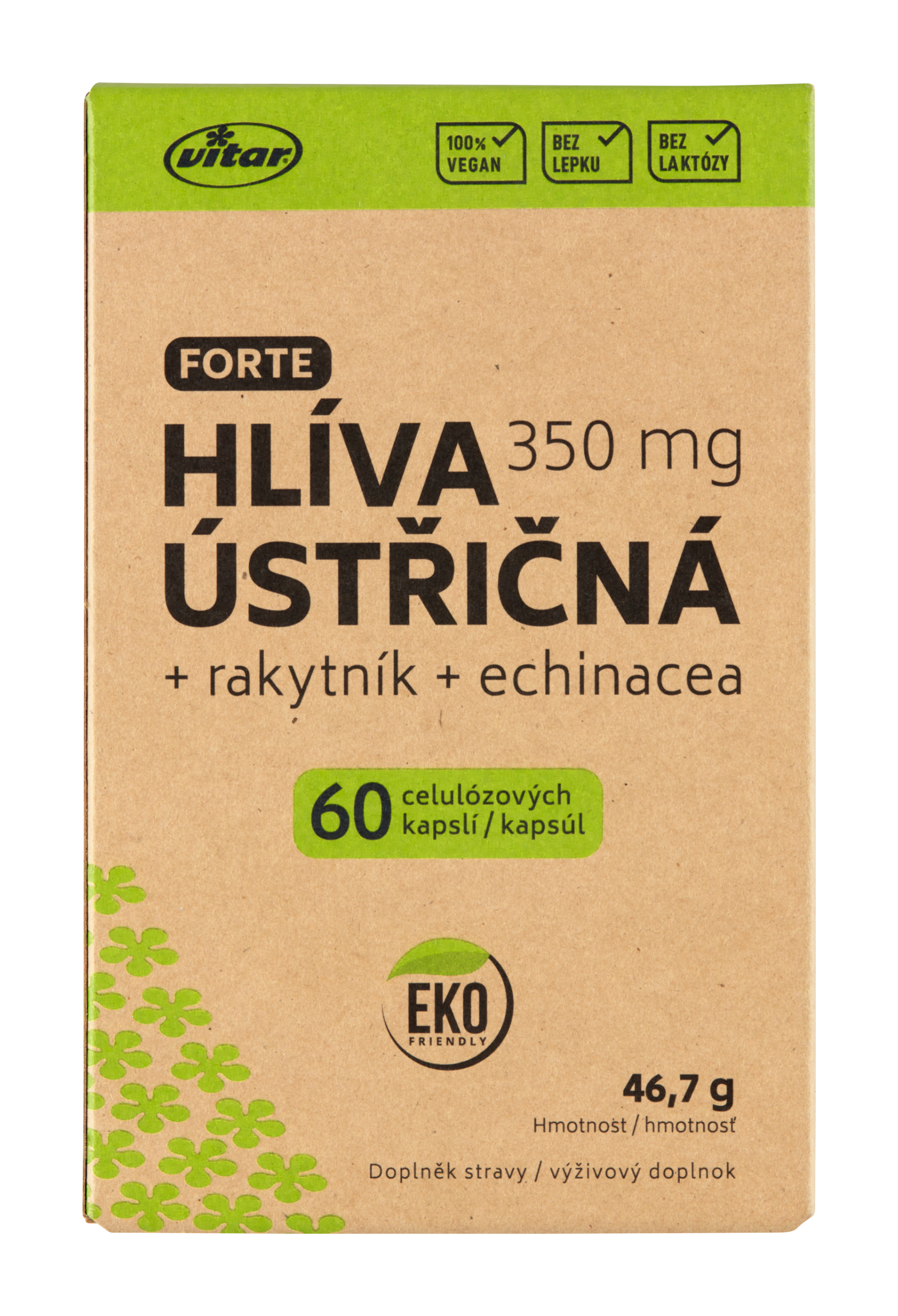 Veganské kapsle obsahují vysokou dávku extraktu z hlívy ústřičné, která odpovídá 10 500 mg plodnic v 1 kapsli. Hlíva ústřičná je jedlá houba, již po tisíce let užívaná v tradiční čínské medicíně. Je ceněna zejména pro vysoký obsah polysacharidů, mezi které patří betaglukany. Je vhodně doplněna extrakty z rakytníku řešetlákového a echinacey, které podporují imunitní systém a tím i obranyschopnost celého organizmu. Rakytník navíc přispívá ke správné funkci kardiovaskulárního systému, pomáhá při únavě a udržení zdravé pokožky. Echinacea je prospěšná pro zdraví horních cest dýchacích a podporuje zdraví močových cest. Vitamin C je významný antioxidant, který výrazně zasahuje do řady životních pochodů. Je potřebný pro tvorbu kolagenu, který působí podpůrně ve tkáních lidského těla - svalech, šlachách, chrupavkách a kůži. Podporuje správnou funkci nervové soustavy, která ovládá činnost všech orgánů v těle.