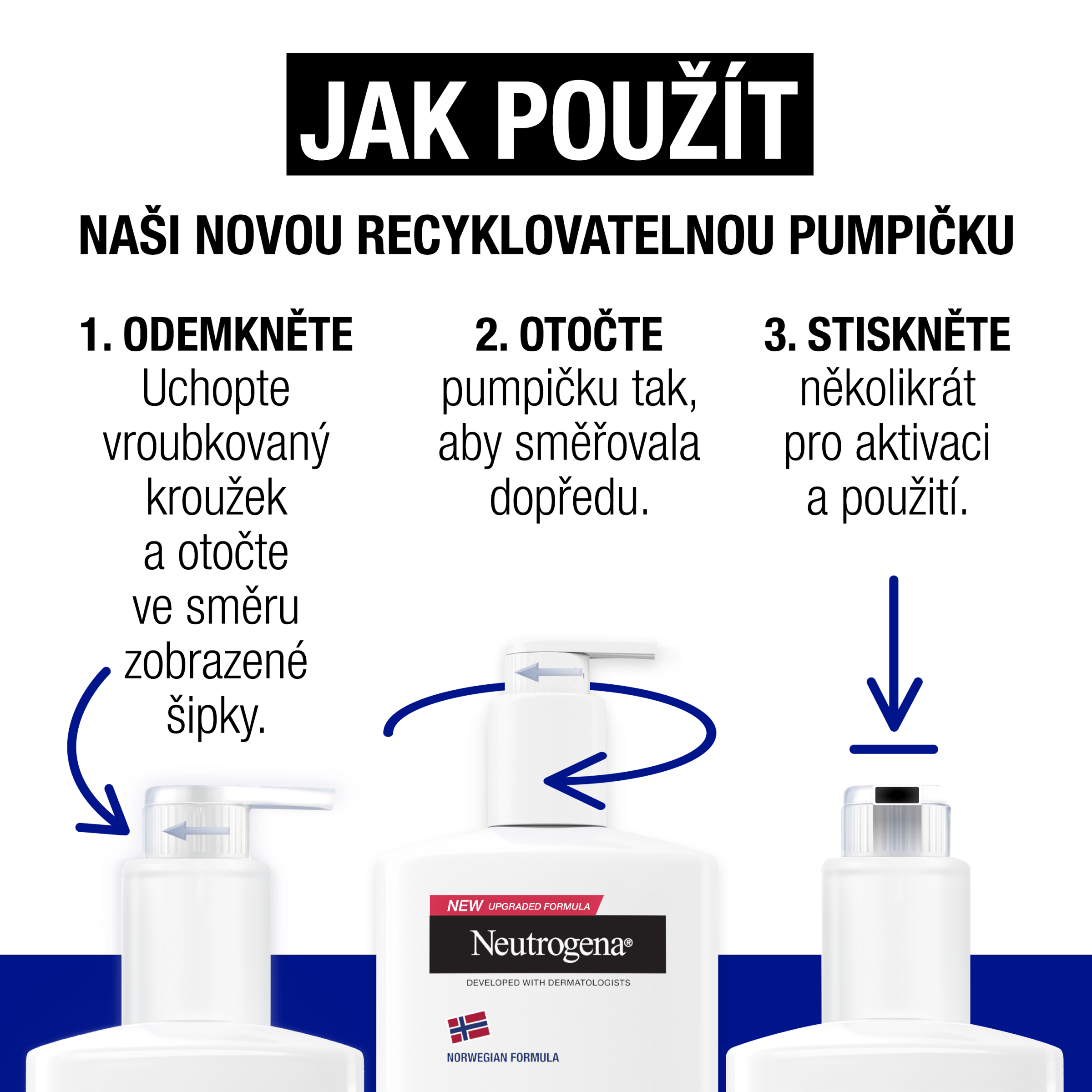 *Sebehodnocení, 55 testujících po 4 týdnech používání, v porovnání s neošetřenou pokožkou. Nyní nově: Recyklovatelná pumpička & lahev** **Tam, kde existují recyklační zařízení.