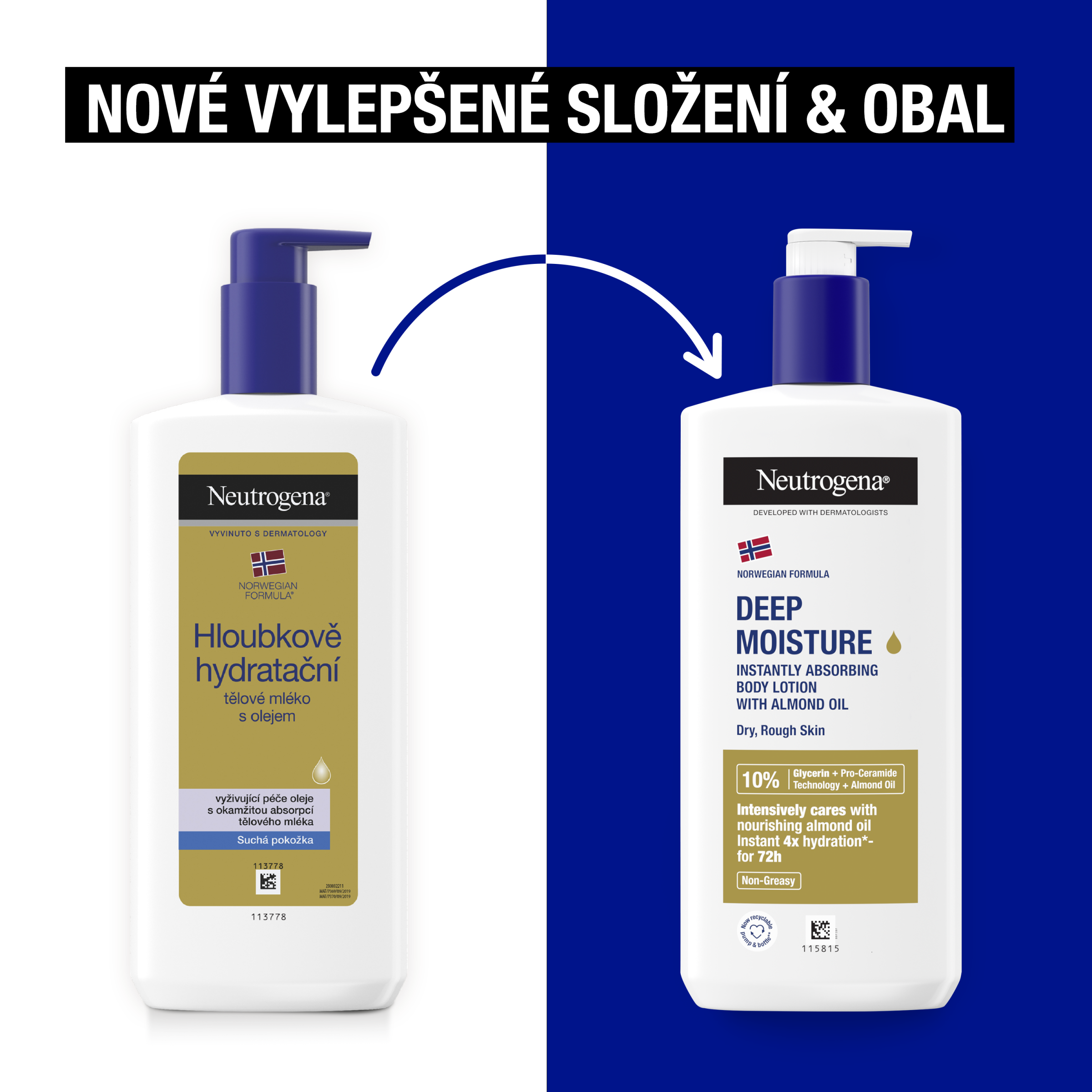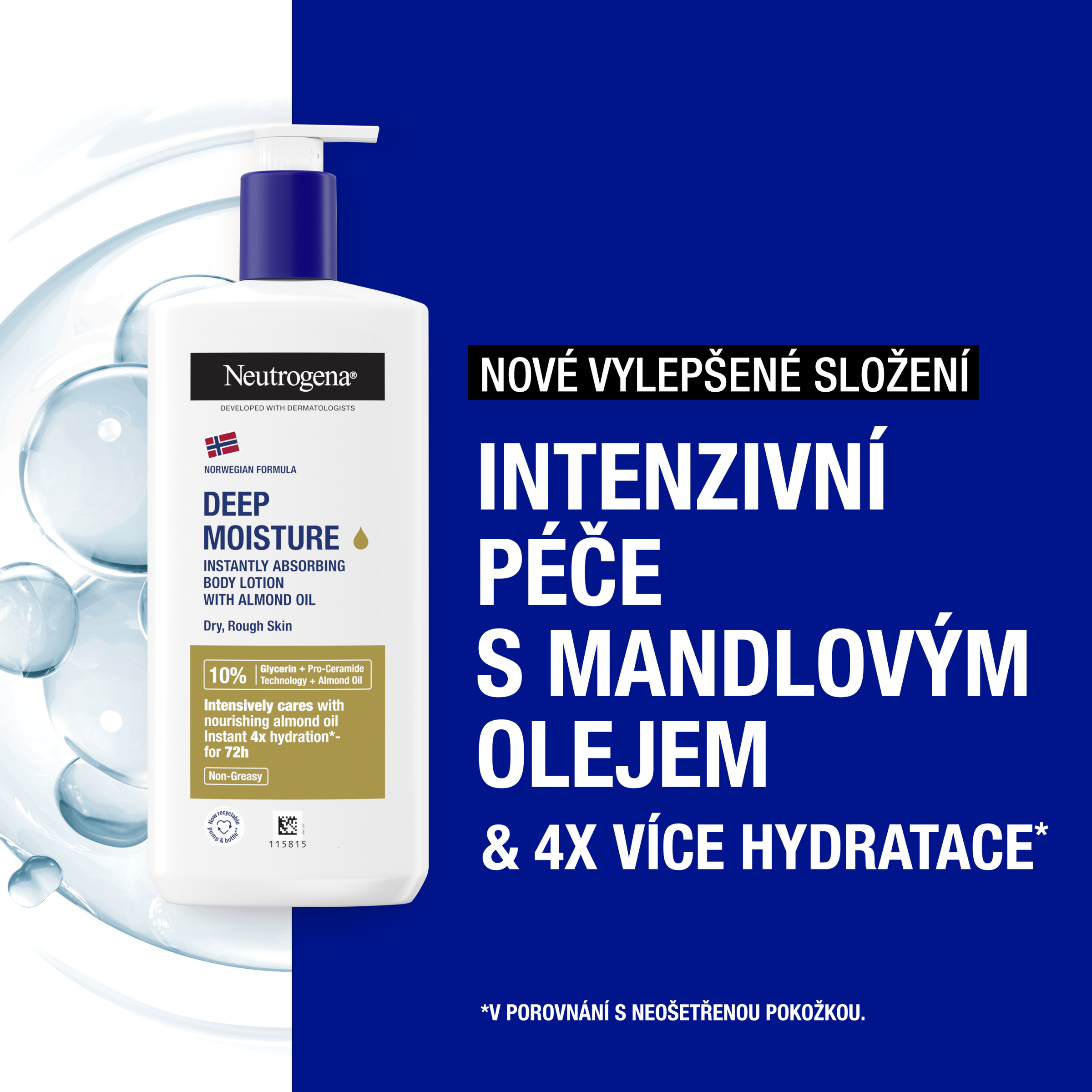 Neutrogena® Norská receptura Hloubkově hydratační tělové mléko s mandlovým olejem. Pro suchou, hrubou pokožku. Nemastné mléko obohacené o mandlový olej intenzivně pečuje o pokožku a okamžitě jí dodává 4x více hydratace*, bez lepivého pocitu. Kožní bariéra, tvořená více než 100 ceramidy, udržuje přirozenou hydrataci a zdravý vzhled pokožky. Pokud je vaše kůže suchá, je čas na doplnění ceramidů. Nová pro-ceramide technologie inovativním způsobem posiluje esenciální ceramidy pokožky. Mandlový olej pokožku vyživuje a zanechává ji hebkou. Okamžitě se vstřebává do pokožky, takže se můžete ihned obléknout. Intenzivně hydratuje po dobu 72 hodin. Složení s vysokou tolerancí, vhodné i pro citlivou pokožku. *v porovnání s neošetřenou pokožkou.