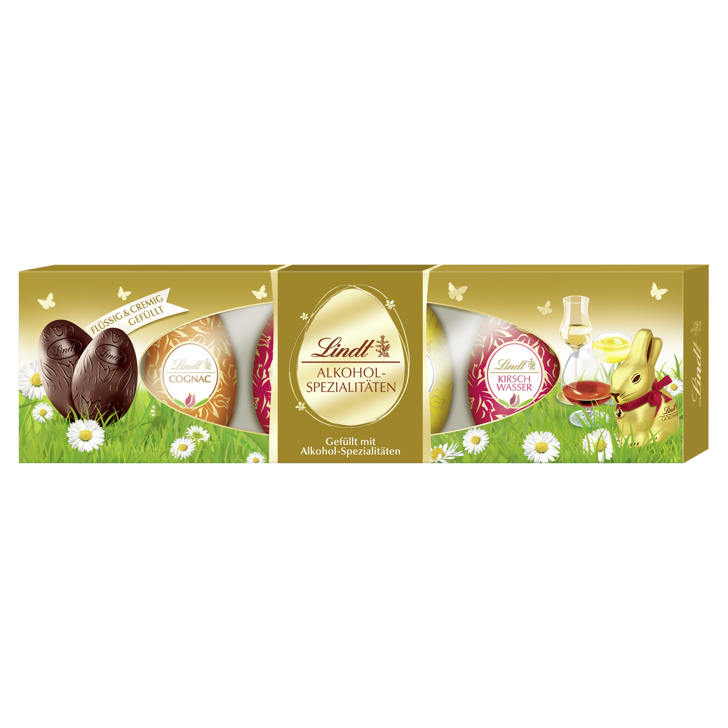 Lindt Hořká čokoláda plněná různými příchutěmi alkoholu.