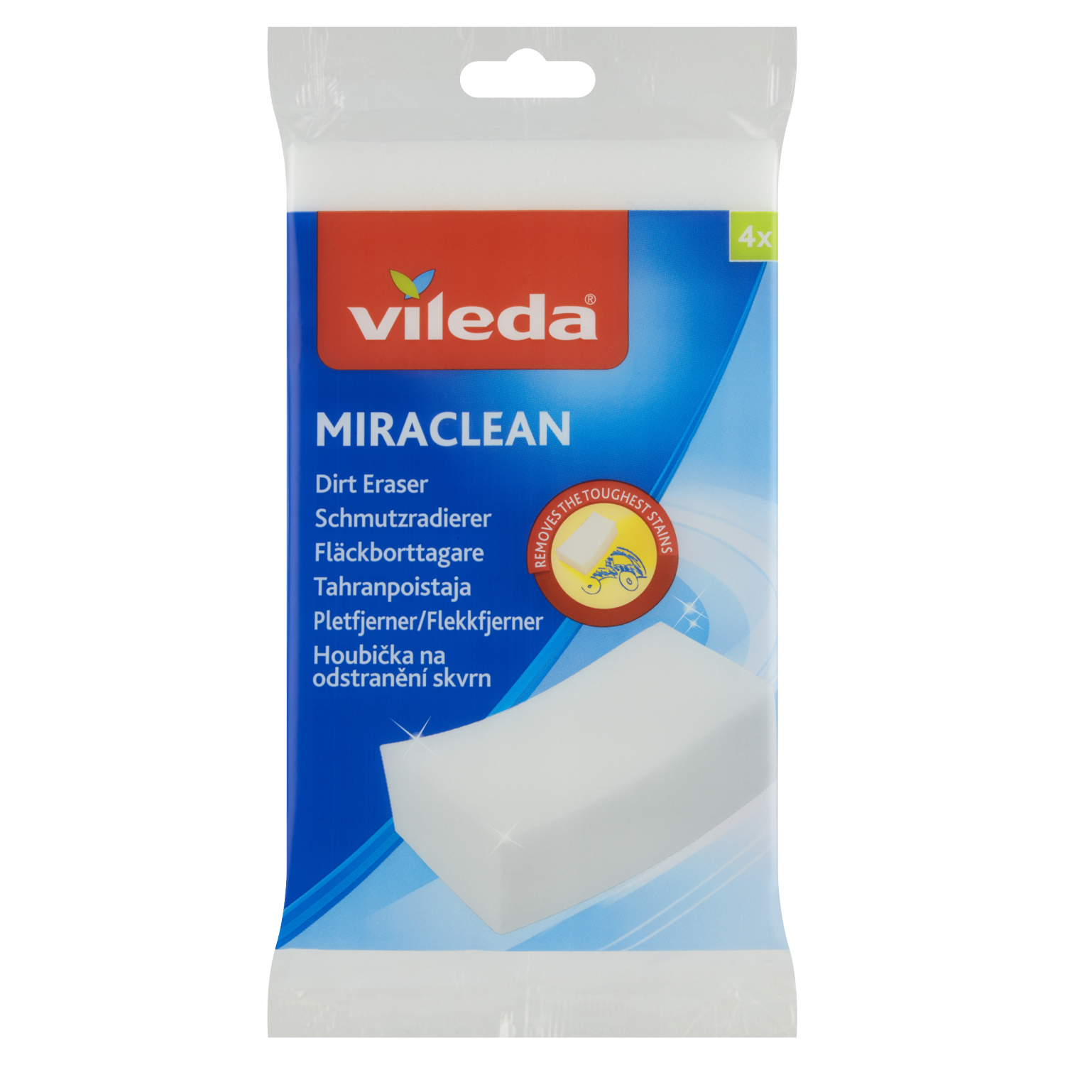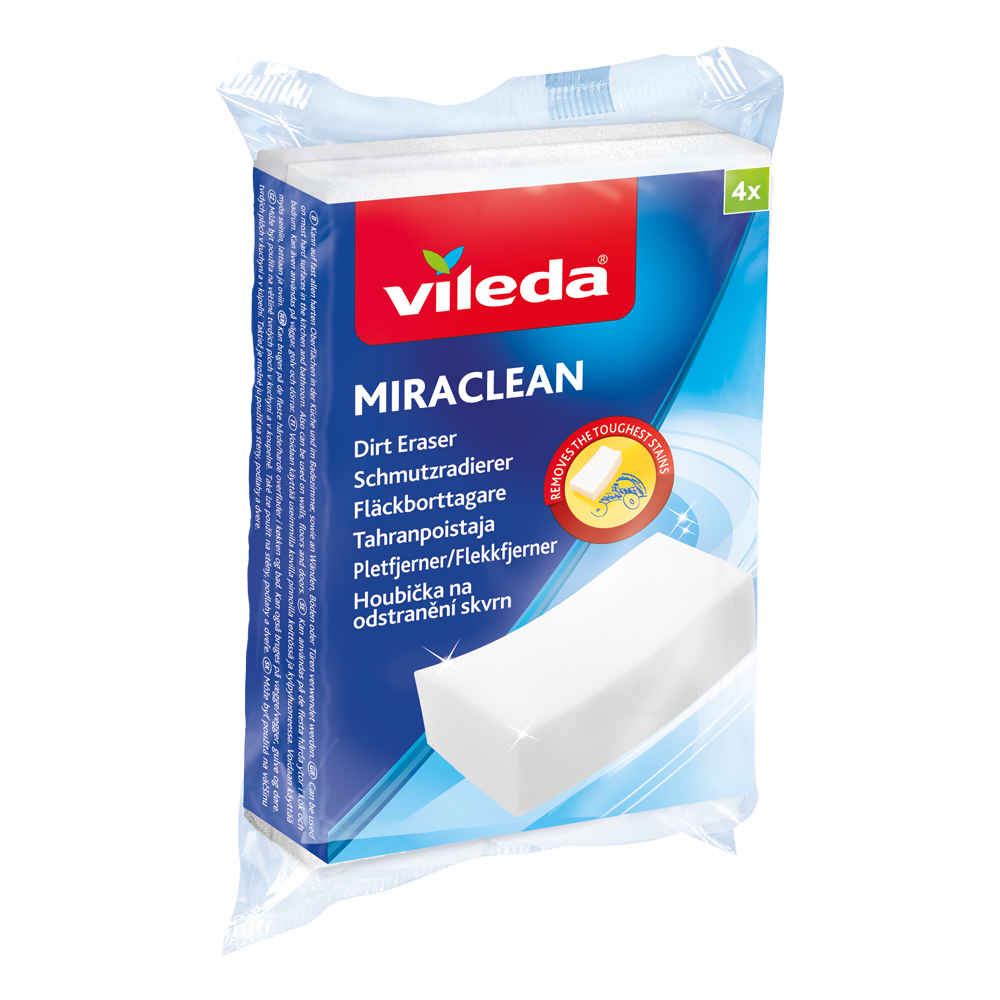 Vileda Miraclean snadno odstraňuje skvrny (čaj, káva, vodní kámen, značky od pera apod.) z většiny tvrdých povrchů. Čistí pouze vodou. Může být použita na většině tvrdých plochách v kuchyni a v koupelně. Také lze použít na stěny, podlahy a dveře. Rozměr houbičky: 10 × 6 × 2,7 cm. Může být použita na většině tvrdých plochách v kuchyni a v koupelně. Také lze použít na stěny, podlahy a dveře.