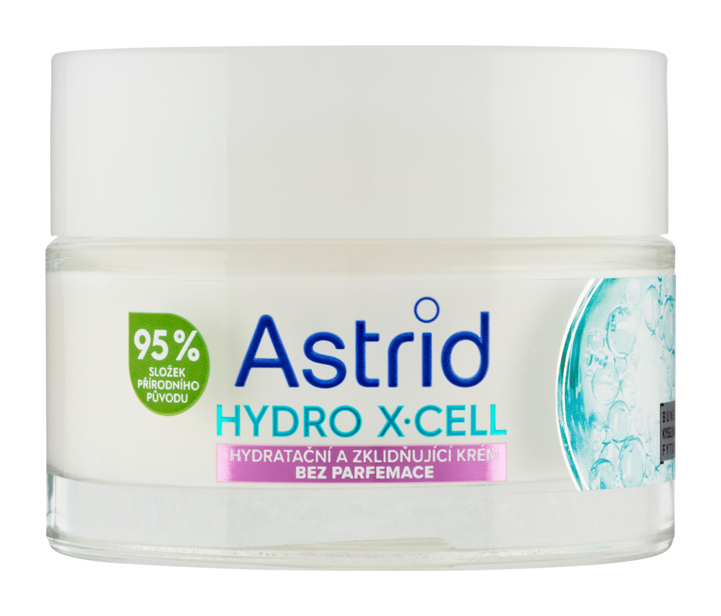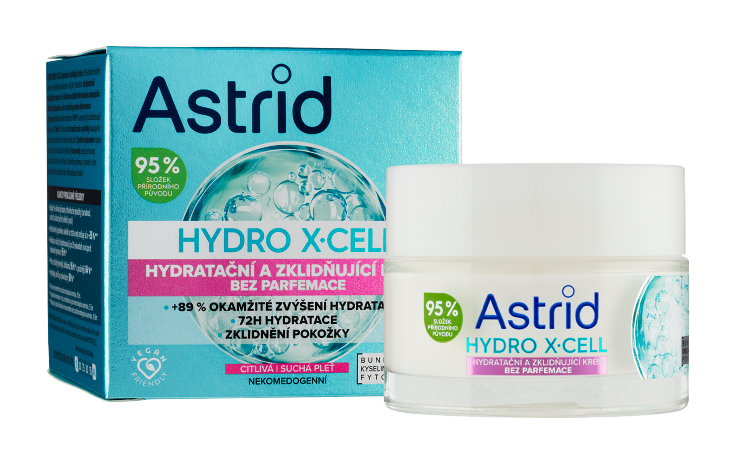 Astrid Hydro X·Cell Hydratační a zklidňující krém s 95 % složek přírodního původu - denní dávka hydratace pro vaši pleť. Hedvábná, ultrahydratační a zklidňující receptura s 5 % účinného multiaktivního komplexu obsahujícího 100 % přírodní buněčnou vodu ze spiruliny, kyselinu hyaluronovou a fytoceramidy dodává okamžitou hydrataci +89 %* a uzamyká ji pro dlouhotrvající výsledky až na 72 hodin*. Na živiny bohatá buněčná voda ze spiruliny obsahuje sílu superpotraviny, která účinně zvyšuje hydratací pleti. Kyselina hyaluronová vypíná pleť, protože jí pomáhá dodávat hydrataci. Fytoceramidy posilují ochrannou bariéru pleti a udržují v ní tak vlhkost. Složení bez parfemace, vyvinuté s cílem minimalizovat riziko alergické reakce. Nekomedogenní složení.