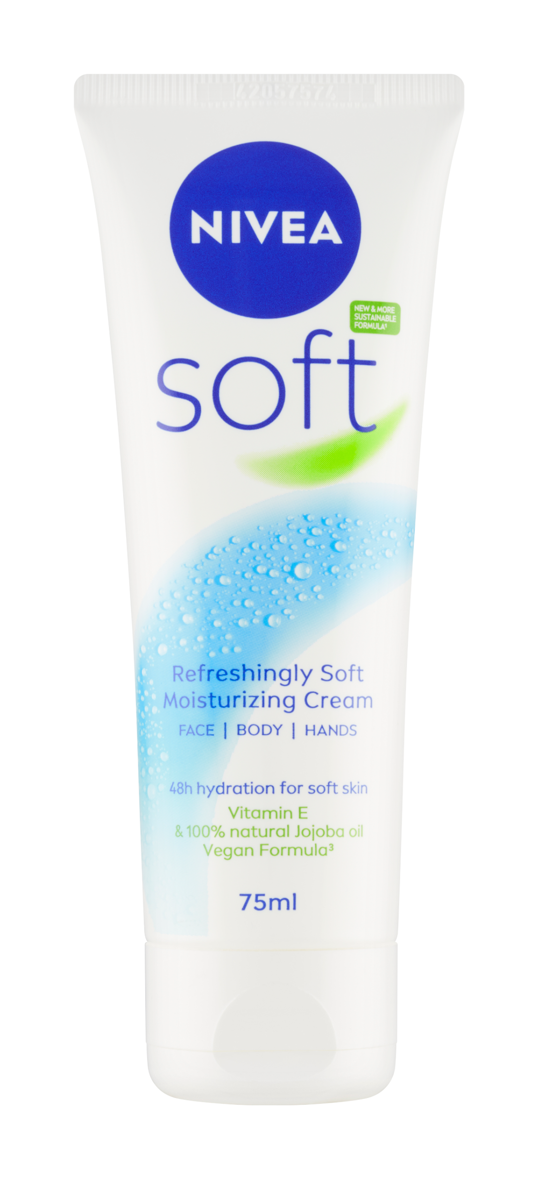 Nivea® Soft Svěží hydratační krém se rychle vstřebává a osvěží pokožku celého těla. 95% ingrediencí přírodního původu². ²ingredience z přírody si po zpracování zachovávají více než 50 % svého přirozeného stavu, včetně vody. Veganské složení - neobsahuje ingredience živočišného původu.