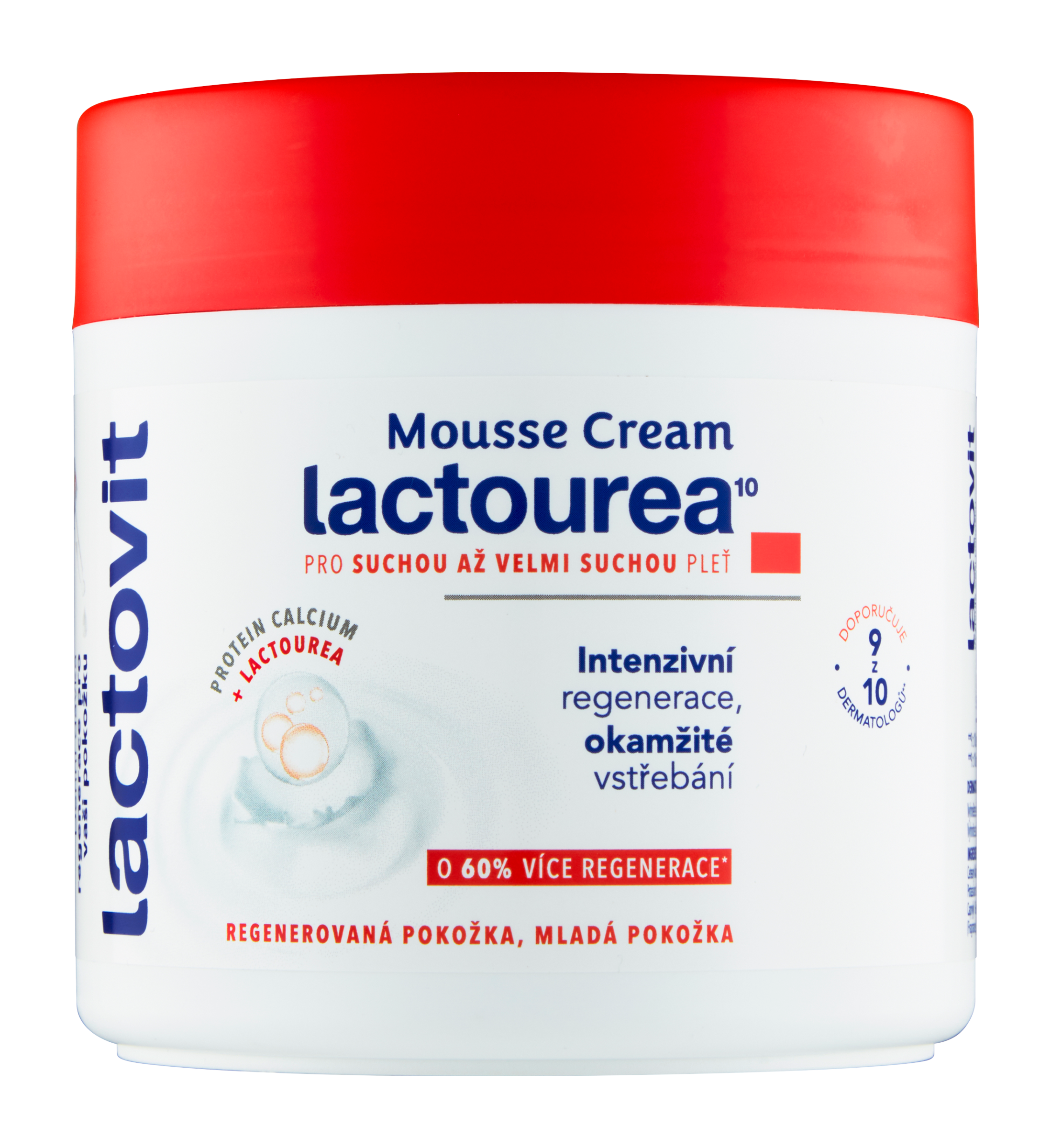 O 60% více regenerace*. Doporučuje 9 z 10 dermatologů**. Exkluzivní složení s kyselinou mléčnou a ureou intenzivně regeneruje a posiluje pokožku. Lehká pěnová textura umožňuje okamžité vstřebání krému a poskytuje hedvábný pocit na pokožce. Lactourea svým dvojím účinkem poskytuje intenzivní hydrataci a obnovuje kožní bariéru. S technologií Protein Calcium, která stimuluje tvorbu elastinu a kolagenu v pokožce, a ta si tak zachová mladý vzhled.