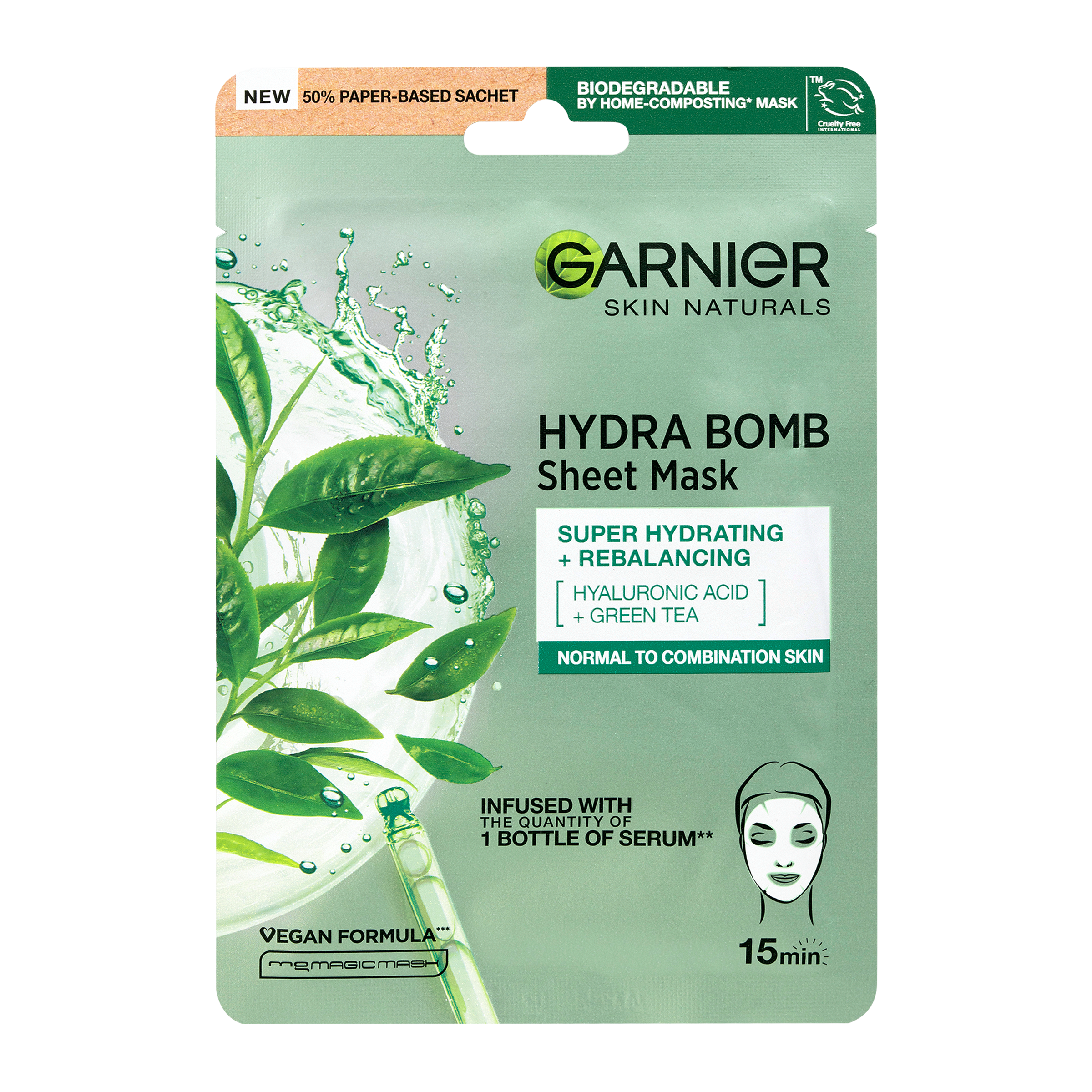 Garnier Skin Naturals super-hydratační textilní pleťová maska s osvěžujícím a čistícím složením obsahující extrakt ze zeleného čaje, kyselinu hyaluronovou a glycerin. Složky jsou uchovány odděleně až do aktivace s textilií. Smícháním získáte čerstvý mix pro účinnou hydrataci. Pleť je po aplikaci intenzivně hydratovaná, osvěžená a vyčištěná.