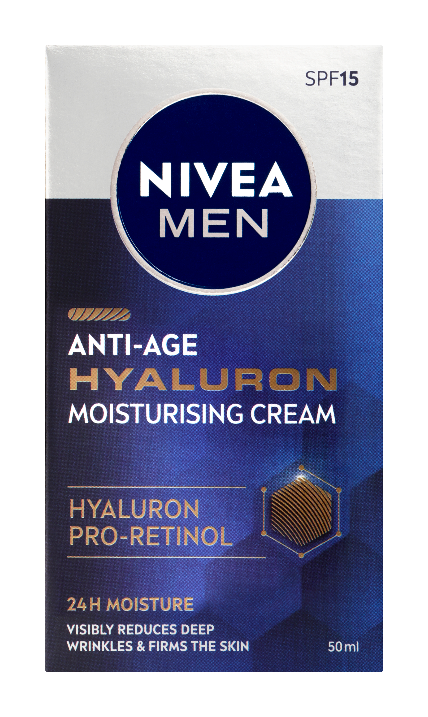 Nivea® Men Hydratační pleťový krém proti vráskám Hyaluron. Rychle se vstřebávající složení s OF 15, Hyaluronem a Pro-retinolem aktivuje pleťové buňky. Viditelně redukuje hluboké vrásky, zpevňuje pleť a hloubkově ji hydratuje.