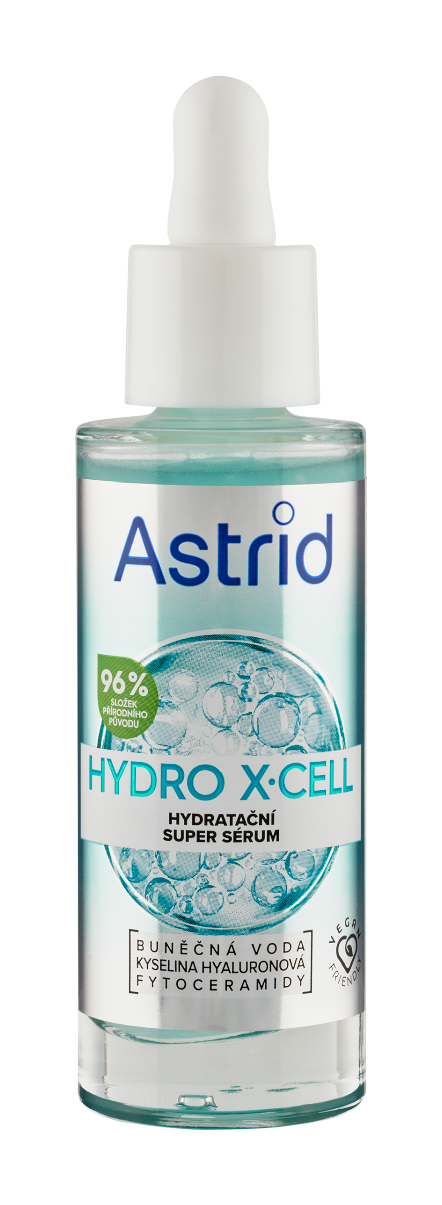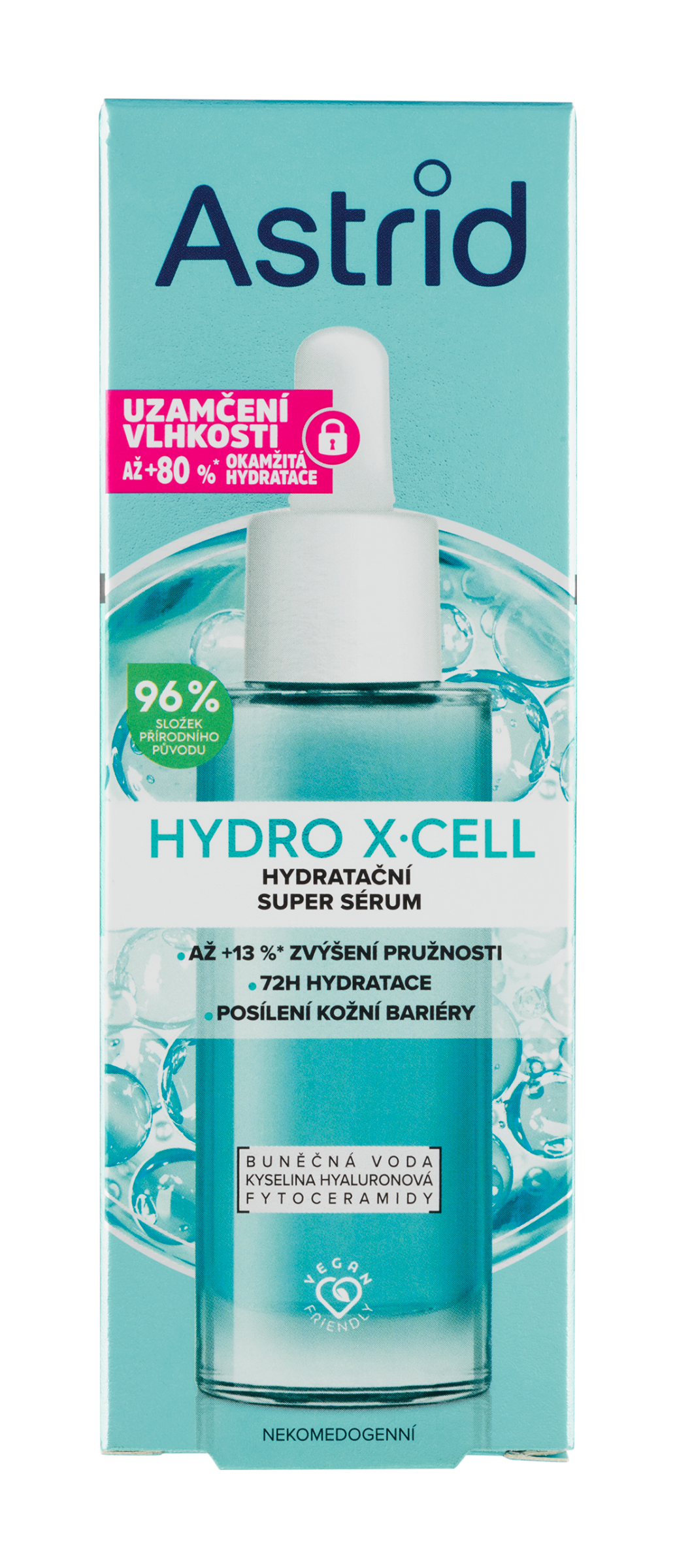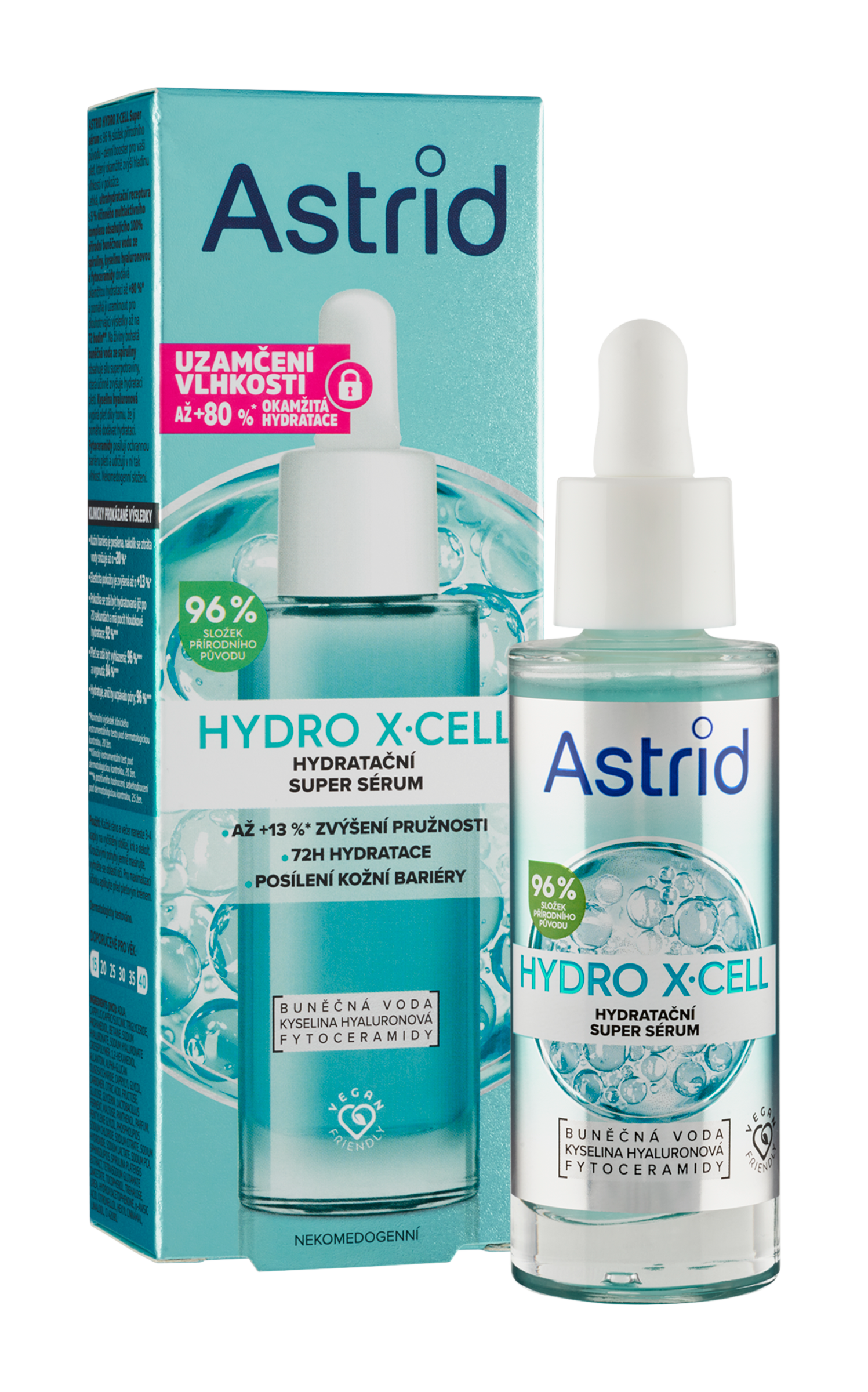 Uzamčení vlhkosti Až +80 %* okamžitá hydratace. Až +13 %* zvýšení pružnosti. Astrid Hydro X-Cell Super sérum s 96 % složek přírodního původu - denní booster pro vaši pleť, který okamžitě zvýší hladinu vlhkosti v pokožce. Lehká, ultrahydratační receptura s 5 % účinného multiaktivního komplexu obsahujícího 100% přírodní buněčnou vodu ze spiruliny, kyselinu hyaluronovou a fytoceramidy dodává okamžitou hydrataci až +80 %* a pomáhá ji uzamknout pro dlouhotrvající výsledky až na 72 hodin**. Na živiny bohatá buněčná voda ze spiruliny obsahuje sílu superpotraviny, která účinně zvyšuje hydrataci pleti. Kyselina hyaluronová vypíná pleť díky tomu, že jí pomáhá dodávat hydrataci. Fytoceramidy posilují ochrannou bariéru pleti a udržují v ní tak vlhkost. Nekomedogenní složení. Klinicky prokázané výsledky: