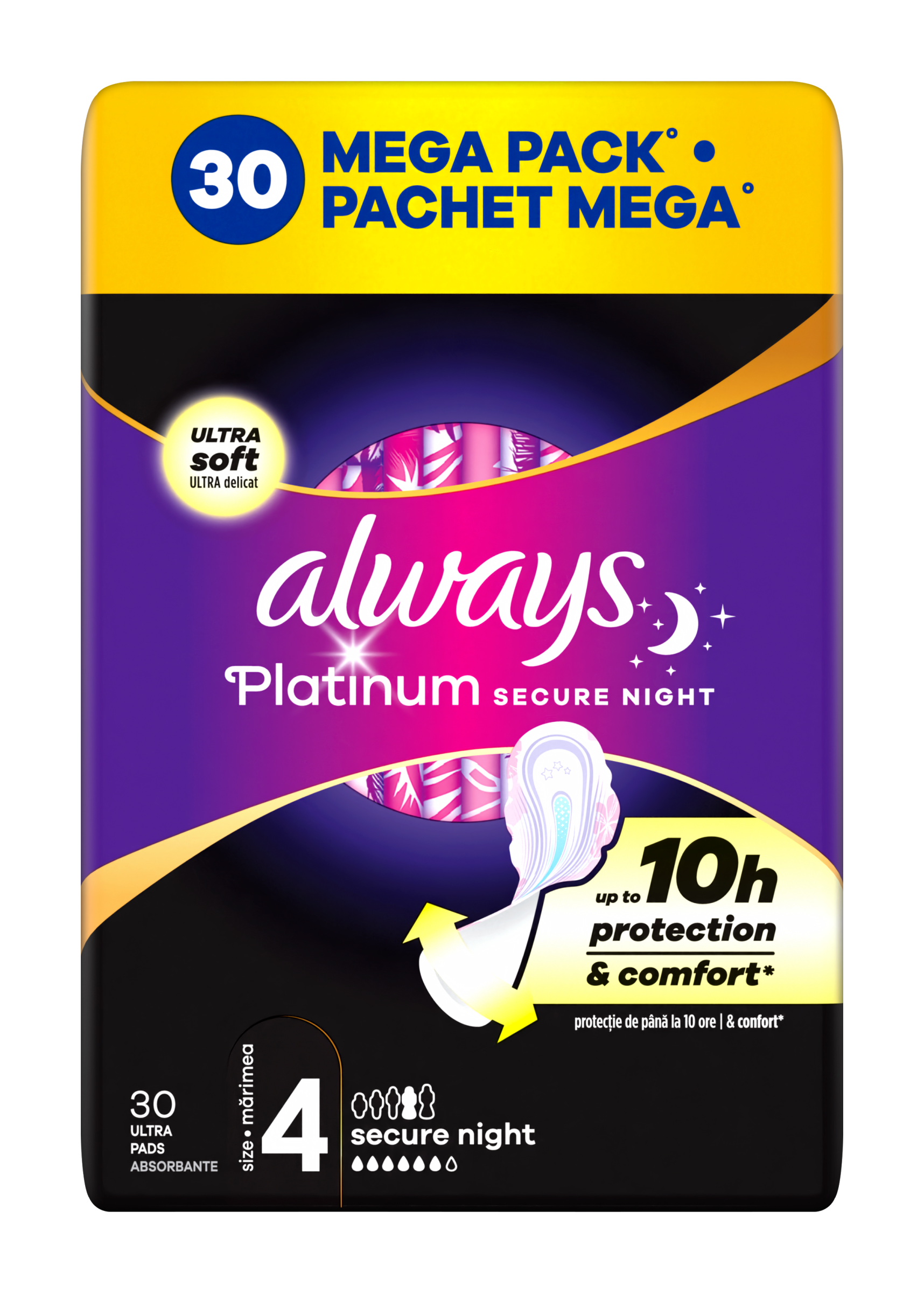 Vložky s ultra hebkou ochrannou povrchovou vrstvou pro úžasný komfort a ochranu před protečením. Technologie InstantDry pro ještě větší pohodlí. Měkký a flexibilní design, který se přizpůsobí vašemu tělu. O 60 % větší zadní část* pro silnější ochranu tam, kde ji potřebujete nejvíce. Vložky Always Platinum s ultra hebkou a ochrannou povrchovou vrstvou jsou navrženy tak, aby zabraňovaly protečení, zůstávaly na místě a poskytovaly optimální pohodlí. S hygienickými vložkami Always Platinum bude vaše menstruace to poslední, na co budete muset myslet. Always Platinum Secure Night (velikost 4) doporučujeme pro použití v noci. Mají o 60 % větší zadní část* pro silnější ochranu před protečením. Vyzkoušejte Always Platinum Super (velikost 2) pro ochranu během vašich dnů.