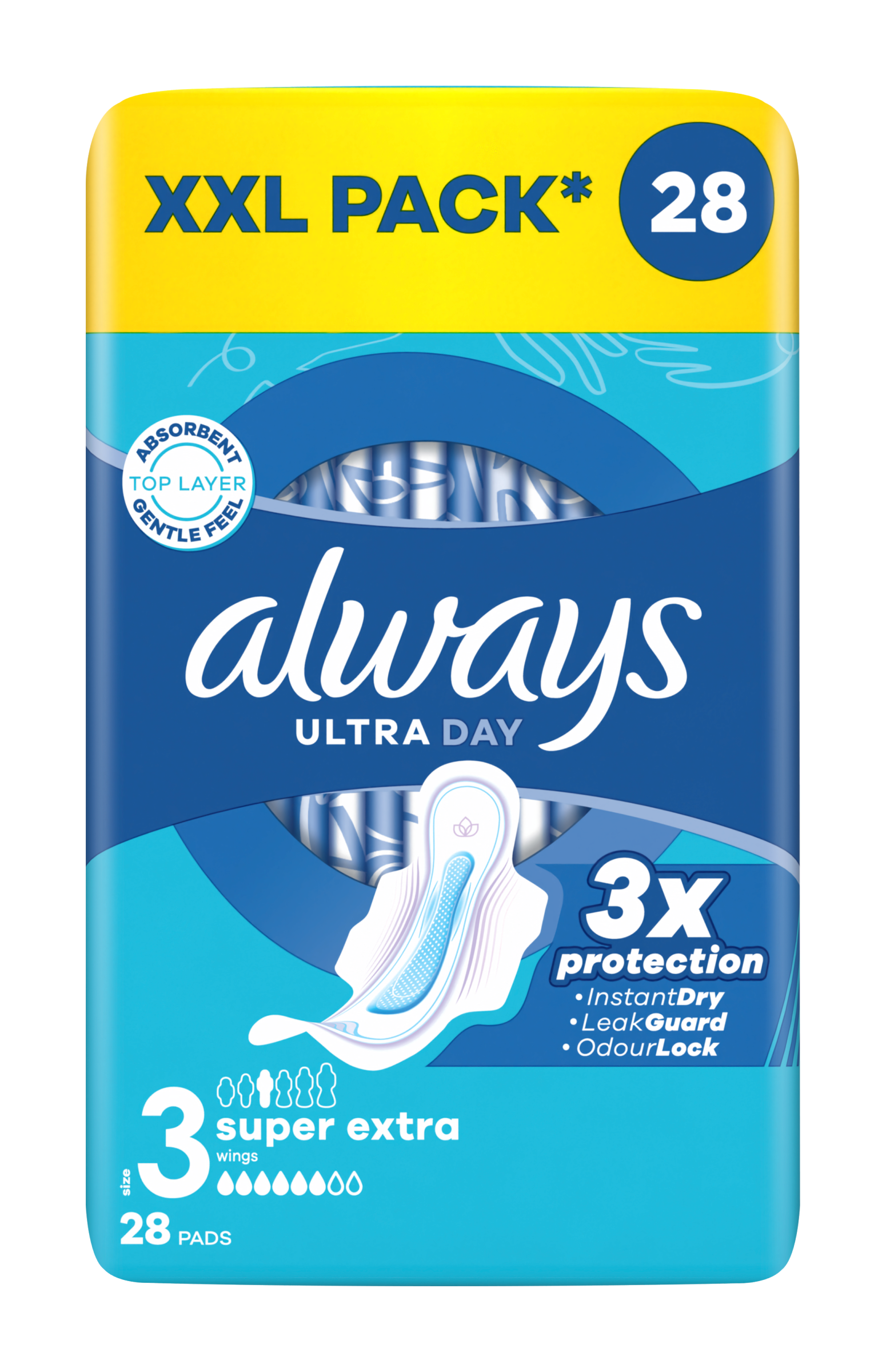 Nespokojujte se s méně než 3násobnou ochranou s hygienickými vložkami Always Ultra Super Extra (velikost 3). Vložky Always s absorpční a hebkou povrchovou vrstvou absorbují díky technologii InstantDry tekutinu během několika sekund a díky technologiím LeakGuard a OdorLock zabraňují protečení a zápachu. Jejich jedinečná křidélka ComfortLock jsou navržena tak, aby se skvěle přizpůsobila jakémukoliv typu spodního prádla. Pro mimořádnou ochranu během noci vyzkoušejte vložky Always Night různých velikostí. Vložky Always Ultra jsou dermatologicky schváleny organizací Skin Health Alliance.