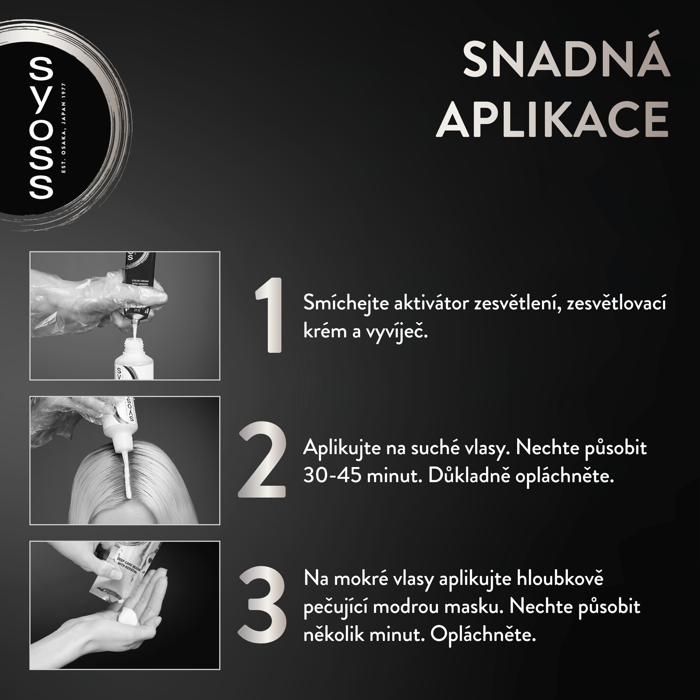 Než začnete s aplikací, připravte si ručník a hodinky poblíž tak, abyste mohli kontrolovat dobu působení. SYOSS BLOND ZESVĚTLOVAČE se používají na předem nemyté, suché vlasy