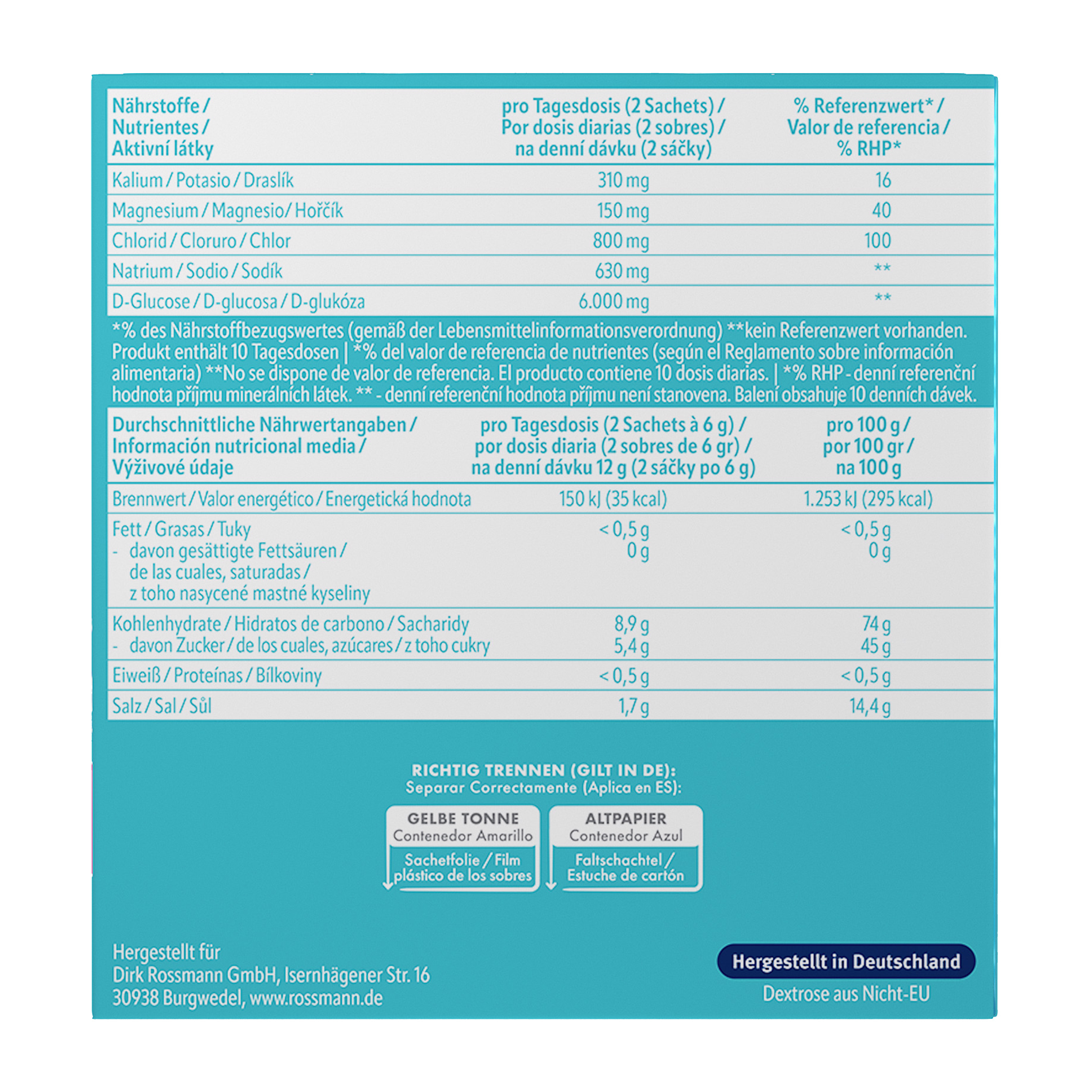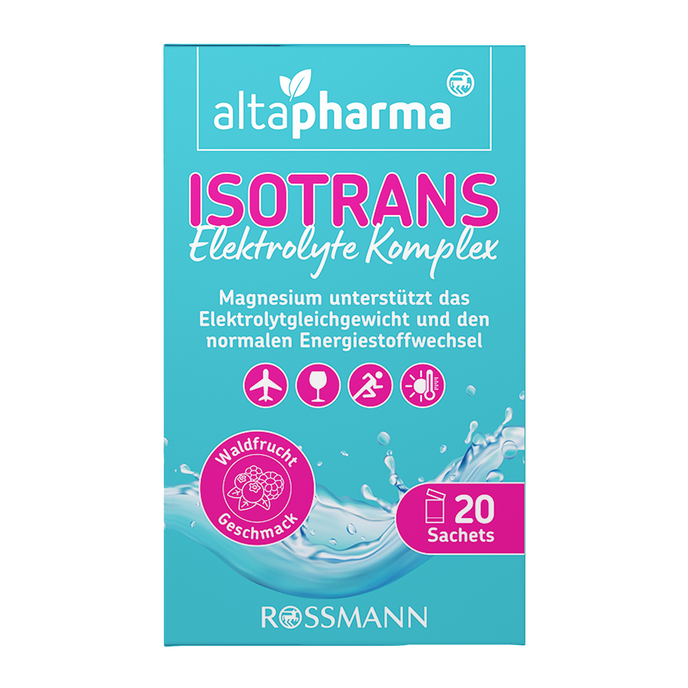 Pro rovnováhu vody a elektrolytů v těle, zejména po fyzické aktivitě, hrají důležitou roli některé soli, jako je hořčík, draslík a sodík. Standardizované roztoky elektrolytů jsou ideální pro obnovení elektrolytové rovnováhy po závažných ztrátách elektrolytů. Sáčky Altapharma ISOTRANS elektrolyty obsahují dokonale vyvážený komplex elektrolytů v kombinaci s glukózou. Hořčík přispívá k normálnímu energetickému metabolismu, pomáhá snižovat únavu a vyčerpání a podporuje elektrolytovou rovnováhu. Draslík přispívá k normální funkci nervového systému a spolu s hořčíkem k normální funkci svalů.