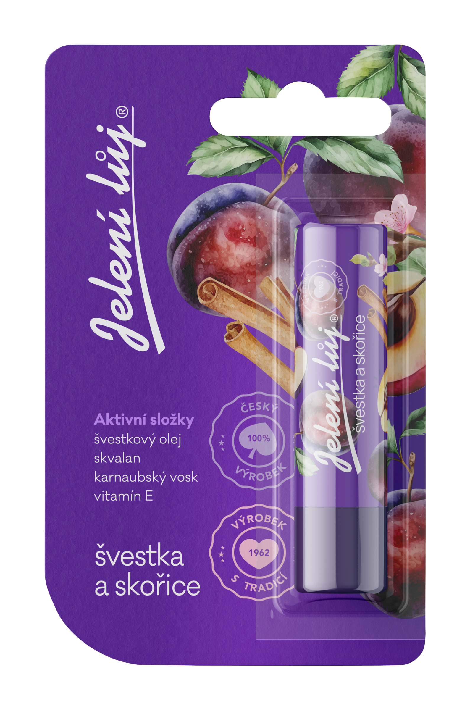Aktivní složky: švestkový olej, skvalan, karnaubský vosk, vitamín E. Jelení Lůj® Švestka a skořice je vyrobený podle jedinečné receptury z přírodních surovin. Díky aktivním složkám jako jsou švestkový olej a karnaubský vosk dodá vašim rtům potřebnou hydrataci a sametovou hebkost. Díky třtinovému skvalanu napomáhá obnovit lipidovou bariéru pokožky a zvyšuje její elasticitu. Pomáda rty chrání před vysoušením a popraskáním, regeneruje pokožku rtů a tvoří ji odolnou proti nepříznivým povětrnostním vlivům jako je vítr, extrémní horko či mráz. 1962 Výrobek s tradicí.