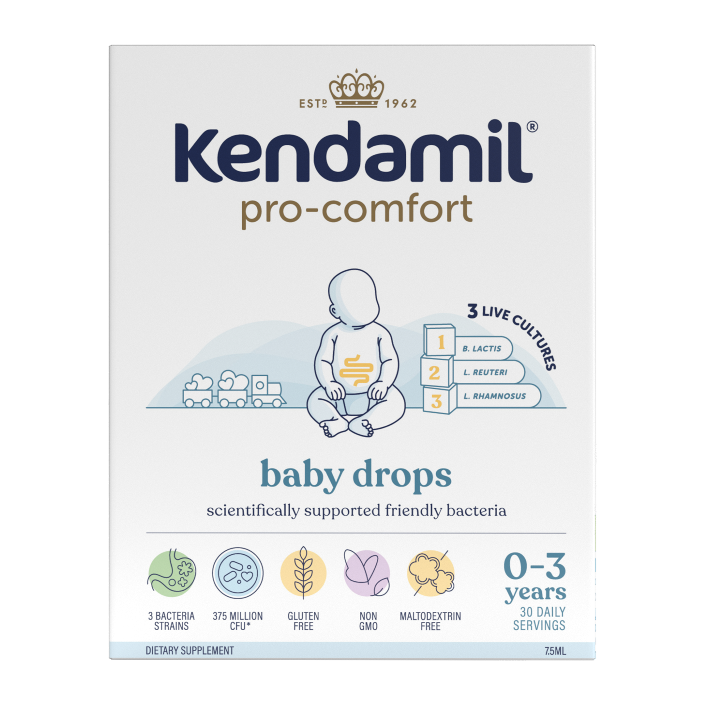 Doplněk stravy pro péči o střevní mikrobiotu kojenců a malých dětí. Vhodné pro děti od narození. Až 80 % imunitních buněk se nachází ve střevech (1), která tak představují pomyslnou bránu k našemu imunitnímu systému. Střevní mikrobiota se také podílí na správném vývoji a fungování mnoha dalších fyziologických procesů. O střeva a střevní mikrobiotu je proto vhodné se už od narození náležitě starat. Například proto, že střevní mikrobiota se z velké části formuje už od narození, a to až do 3 let věku dítěte (2), kdy se již podobá mikrobiotě dospělých jedinců. Kapky Kendamil pro-comfort obsahují tři bakteriální kmeny pro doplnění bifidobakterií a laktobacilů, které se nachází ve střevním mikrobiomu. Navíc obsahují také fruktooligosacharidy (FOS), kterými se tyto prospěšné bakterie živí. Péče o rovnováhu střevní mikrobioty (3) pro děti již od narození vhodné při a po používání antibiotik (4) vhodné pro předčasně narozené děti a děti narozené císařským řezem (5) obsahují 3 bakteriální kmeny (Lactobacillus reuteri, Lactobacillus rhamnosus a Biffidobacterium lactis) 375 milionů živých bakterií v jedné dávce (5 kapek) bez lepku FOS (Fruktooligosacharidy).