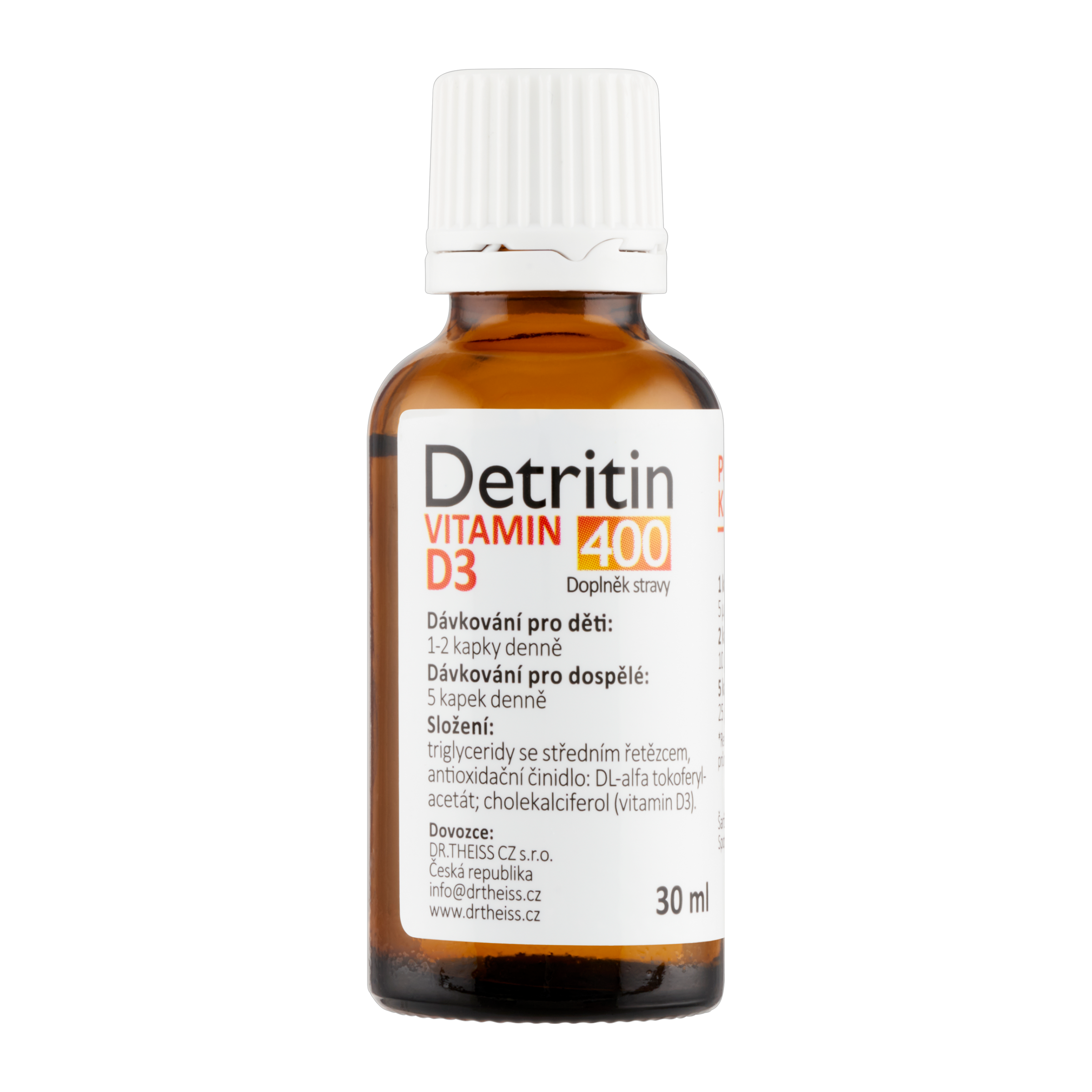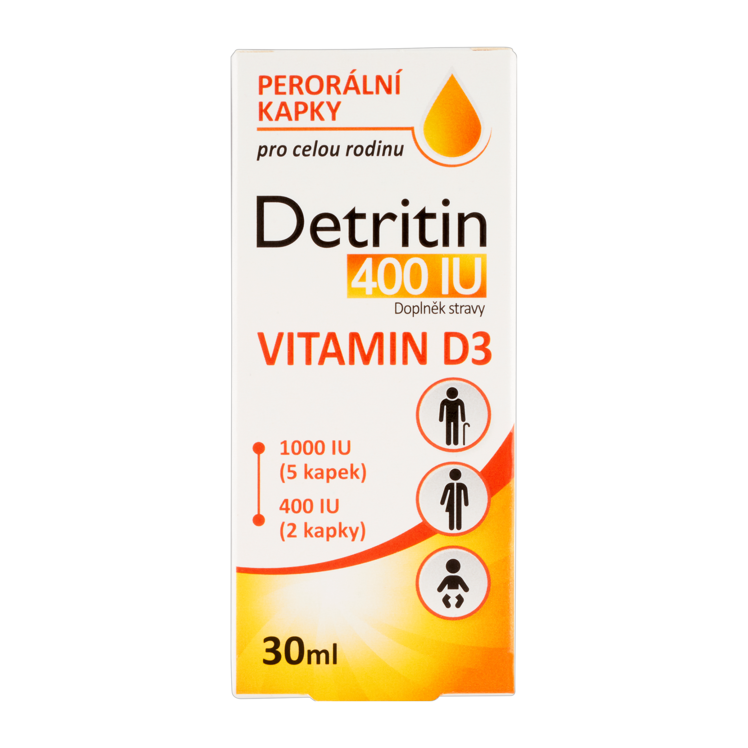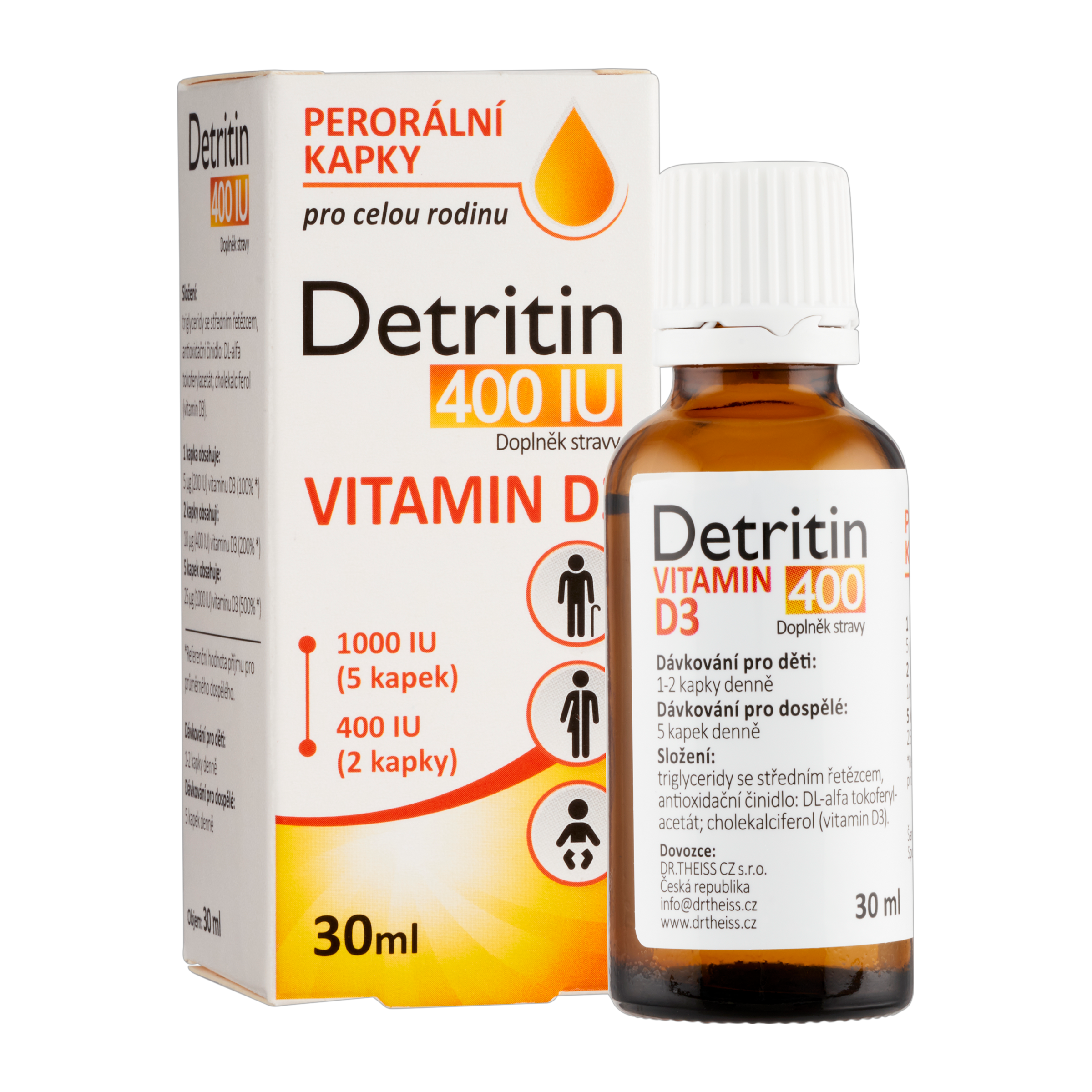 - 2 kapky = 400 IU vitaminu D3, 5 kapek = 1000 IU