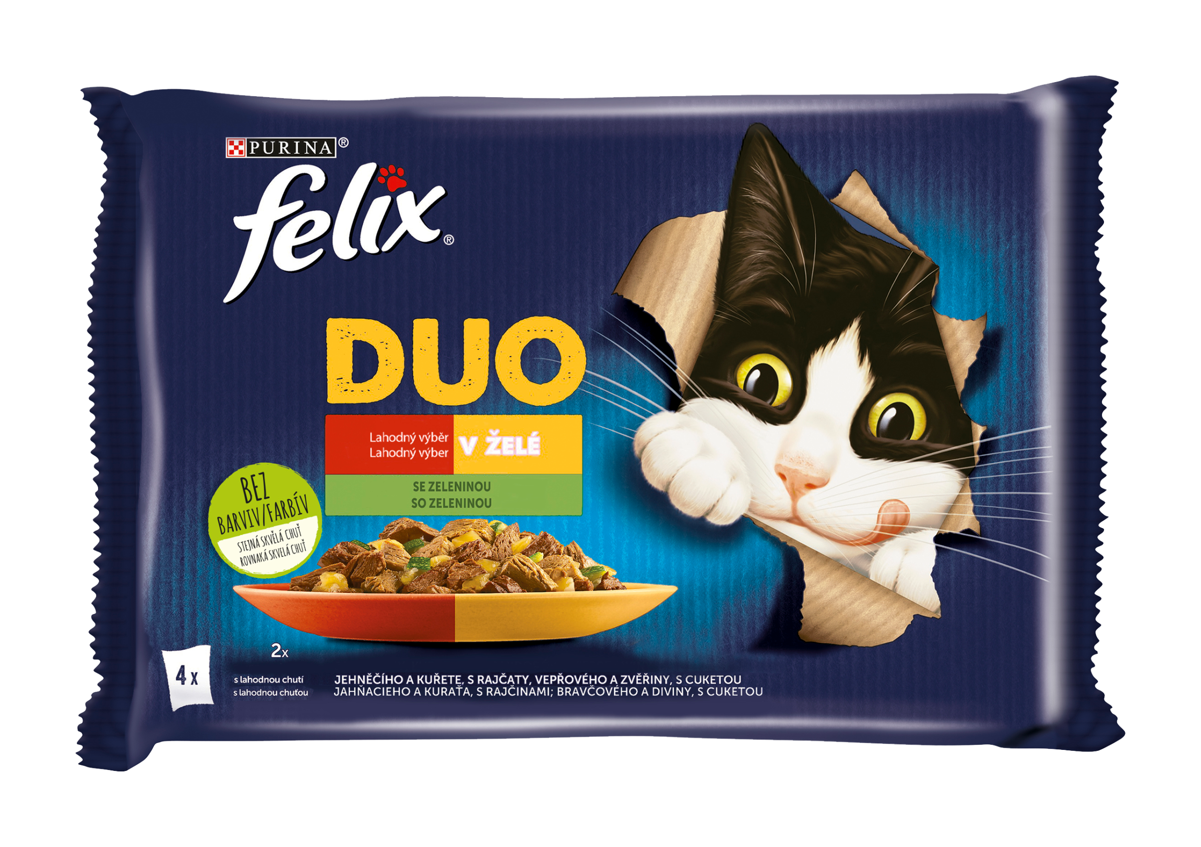Kompletní krmivo pro dospělé kočky. FELIX® Duo je řada neodolatelných krmiv, která vypadají, voní a chutnají tak lahodně, jako jídlo, které byste sami uvařili. Každá receptura, vyrobená z kvalitních surovin, obsahuje křehké kousky kombinující dvě neodolatelné chutě v želé. Tak si vaše kočka může pochutnat na dvou oblíbených chutích najednou! Zároveň jsou zdrojem omega-6 mastných kyselin a mají správnou kombinaci vitamínů, aby udržely vaši kočku plnou energie a připravenou k uličnictví! Jsou plná dobrot a uspokojí 100 % denních potřeb vaší kočky, když jsou podávána podle krmného návodu. To není všechno! FELIX Duo je dostupný v celé řadě neodolatelných receptur v lahodném želé, aby každý den uspokojil lásku vaší kočky po rozmanitosti. Opravdu dvojnásobně vynikající! FELIX je prostě neodolatelný! 100% kompletní a vyvážené Vitamíny D a E Zdroj omega-6 mastných kyselin, bez přidaných umělých konzervantů.