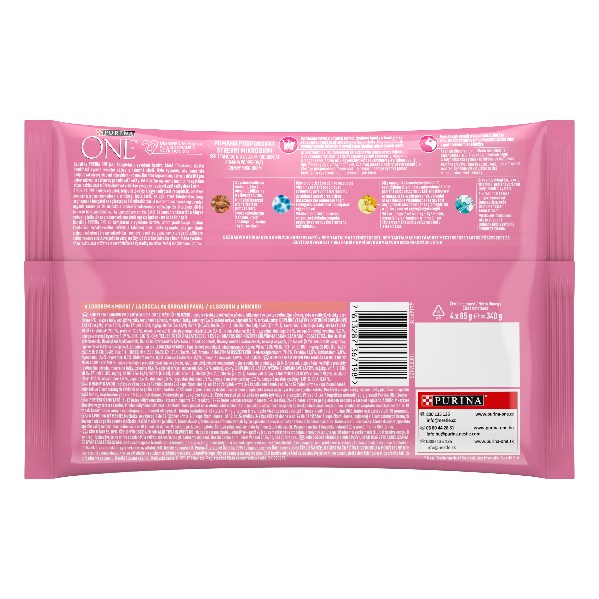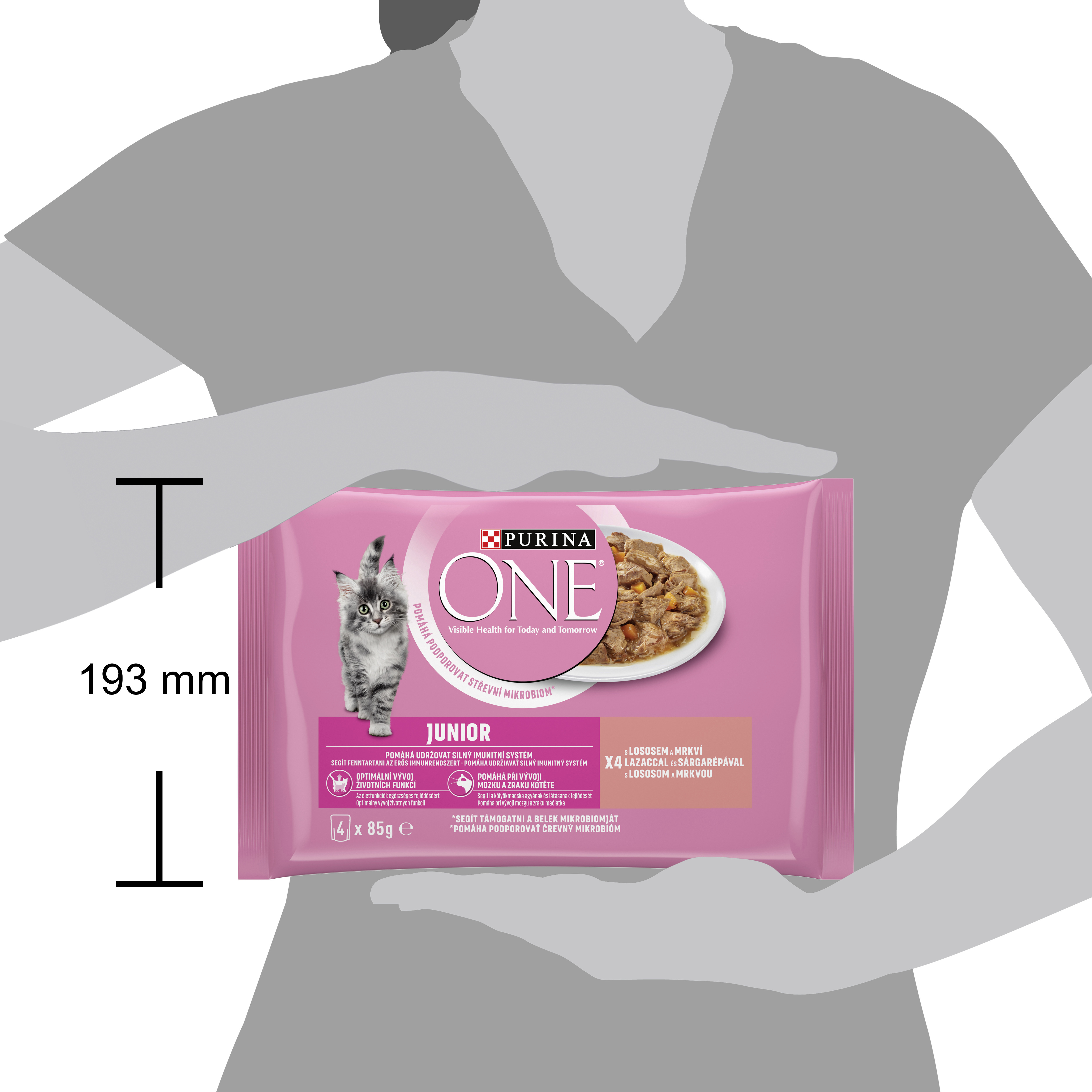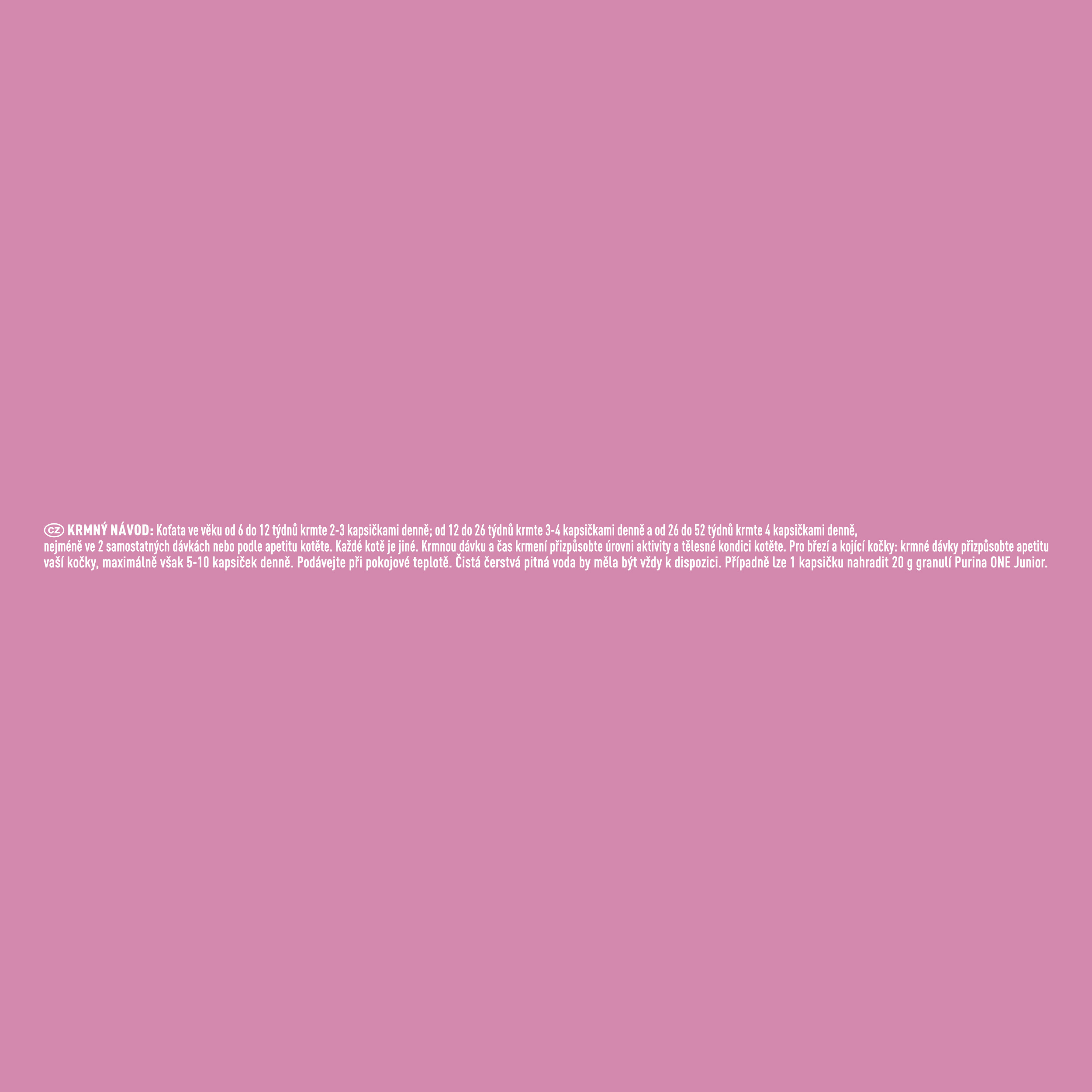 Krmný návod: Koťata ve věku od 6 do 12 týdnů krmte 2-3 kapsičkami denně; od 12 do 26 týdnů krmte 3-4 kapsičkami denně a od 26 do 52 týdnů krmte 4 kapsičkami denně, nejméně ve 2 samostatných dávkách nebo podle apetitu kotěte. Každé kotě je jiné. Krmnou dávku a čas krmení přizpůsobte úrovni aktivity a tělesné kondici kotěte. Pro březí a kojící kočky: krmné dávky přizpůsobte apetitu vaší kočky, maximálně však 5-10 kapsiček denně. Podávejte při pokojové teplotě. Čistá čerstvá pitná voda by měla být vždy k dispozici. Případně lze 1 kapsičku nahradit 20 g granulí Purina ONE Junior.
