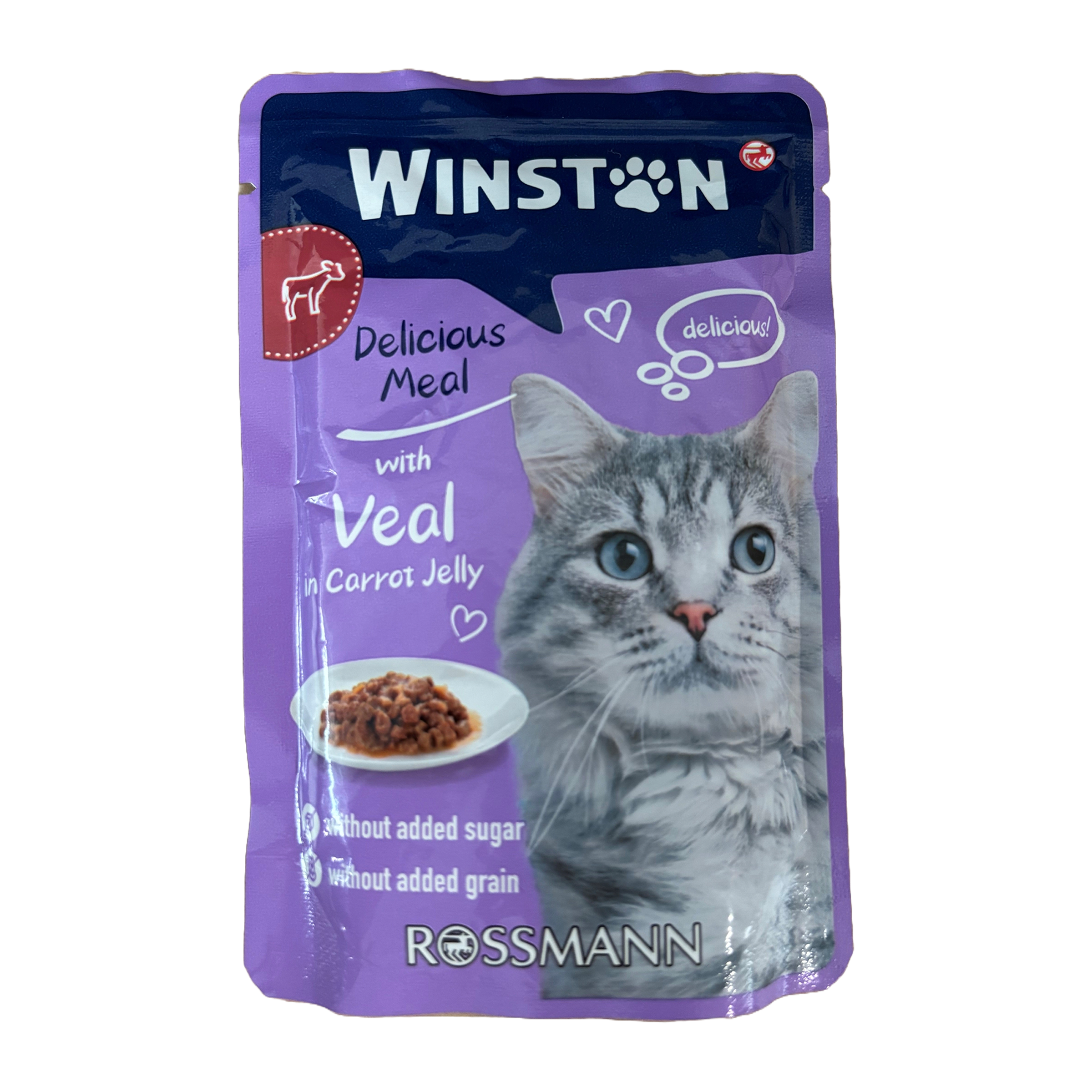 Pochoutka s telecím v mrkvovém želé. Kompletní krmivo pro dospělé kočky.