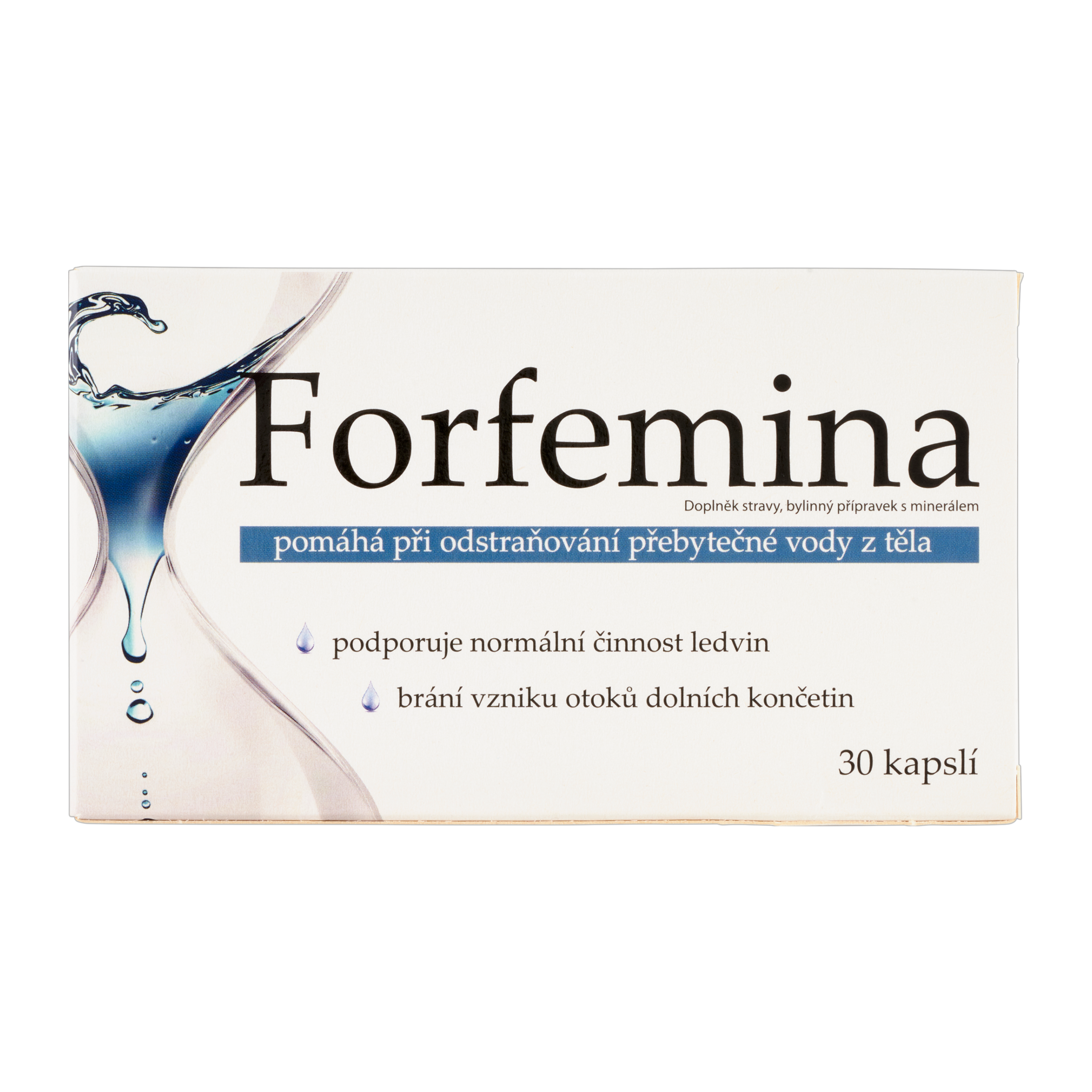 Kapsle na odvodnění Forfemina podporují přirozené vylučování přebytečné vody z těla a přispívají k udržení zdravé funkce ledvin a močových cest. Obsahují extrakt z kopřivy dvoudomé, která je tradičně využívána pro své příznivé účinky na vylučovací systém, normální činnost ledvin i kardiovaskulárního systému. Díky obsahu zinku podporují také správný metabolismus sacharidů, mastných kyselin a proteinů. Pravidelné užívání zmírňuje pocit těžkých nohou a brání vzniku otoků dolních končetin, zejména při dlouhodobém stání, sezení nebo v horkém počasí.