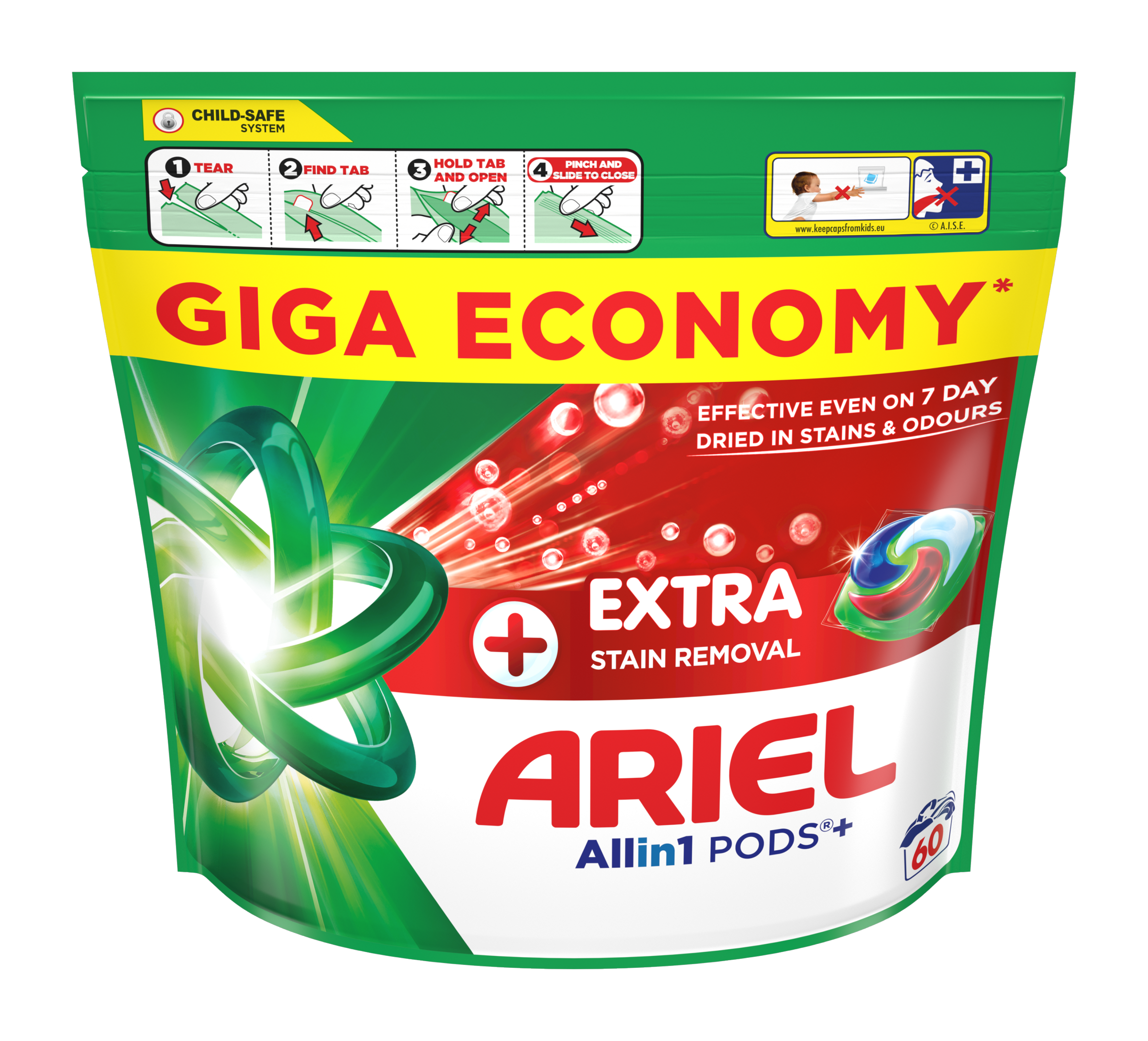 Ariel Allin1 PODS+ nabízí špičkovou technologii pro odstranění odolných skvrn a zápachu, což z něj činí nejlepší Allin1 PODS+ od značky Ariel. Díky speciální červené komůrce si poradí i se zaschlými skvrnami starými až 7 dní. Kapsle jsou navrženy tak, aby fungovaly skvěle i při praní na nižší teplotu, rychle se rozpouštěly i ve studené vodě a poskytovaly dokonalé výsledky. Nejlepších výsledků dosáhnete, když kapsli vložíte do prázdného bubnu a prádlo položíte až na ni.