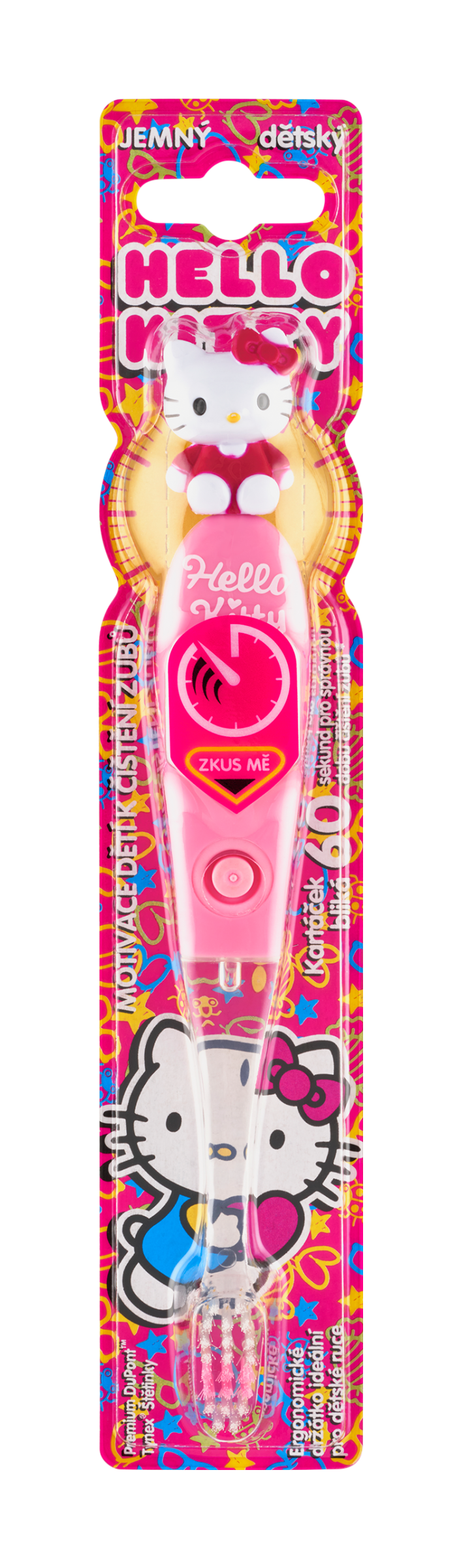 Kartáček bliká 60 sekund pro správnou dobu čištění zubů* *Stomatologové doporučují čistit každé patro zubů po dobu 60 sekund. - Jemné štětinky DuPont™ Tynex® USA pro bezpečné a kvalitní vyčištění zubů - Vyvinuto speciálně pro dětské zoubky Vyvinuto pro motivaci a výuku dětí. Kartáček dětem pomáhá, díky blikání, dodržovat ideální délku čištění zubů a oblíbená postavička Hello Kitty je motivuje k pravidelnosti čištění zubů, protože i kočička Hello Kitty musí mít krásně čisté zuby. Děti s kartáčkem Hello Kitty čištění zubů milují. Pomáhá jim každodenní rutinu udělat zábavnější. Ergonornické držátko padne přesně do dětské ruky a jemné štětinky DuPont™ Tynex® zuby dokonale a jemně vyčistí. V prodeji také zubní pasta Hello Kitty s jahodovou příchutí, ústí voda pro ještě důkladnější ústní hygienu a další druhy zubních kartáčků, dentálních sad a produktů, díky kterým budou Vaše děti čištění zubů milovat. Bezpečnost testována v souladu s EMC direktivou 2004/108/EU.