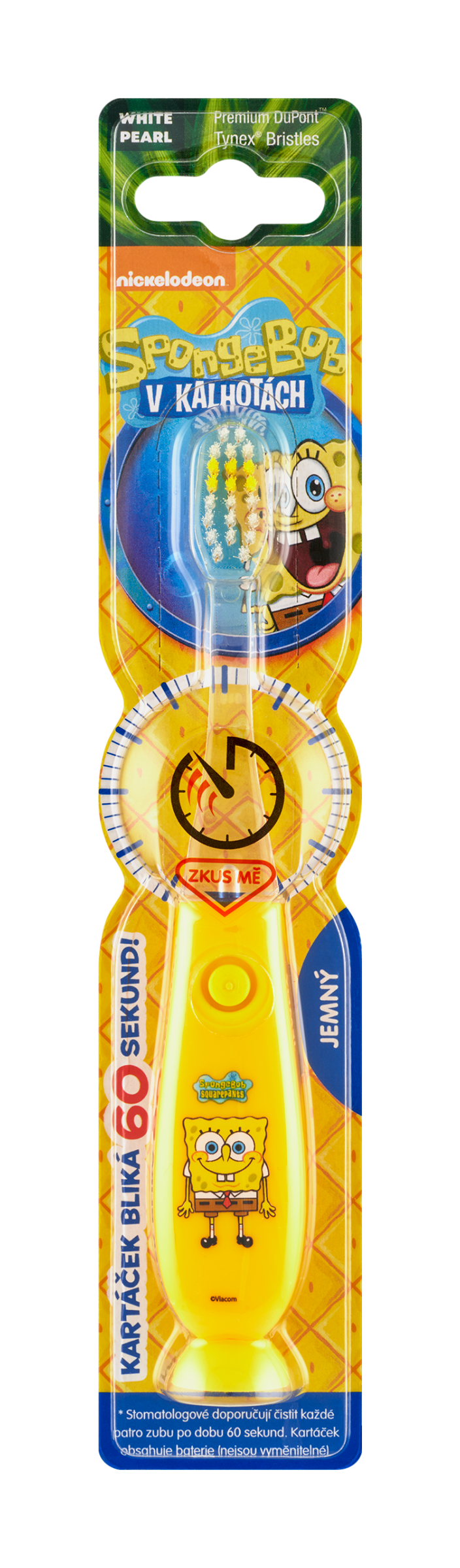 Kartáček bliká 60 sekund! SpongeBob v kalhotách. - jemné štětinky DuPont™ Tynex® USA pro bezpečné a kvalitní vyčištění zubů - vyvinuto speciálně pro dětské zoubky. Vyvinuto pro motivaci a výuku dětí. Kartáček dětem pomáhá, díky blikání, dodržovat ideální délku čištění zubů a oblíbená postavička SpongeBob je motivuje k pravidelnosti čištění zubů, protože i SpongeBob musí mít krásně čisté zuby. Děti s kartáčkem SpongeBob čištění zubů milují. Pomáhá jim každodenní rutinu udělat zábavnější. Ergonomické držátko padne přesně do dětské ruky a jemné štětinky DuPont™ Tynex® zuby dokonale a jemně vyčistí. Stomatologové doporučují čistit každé patro zubů po dobu 60 sekund.