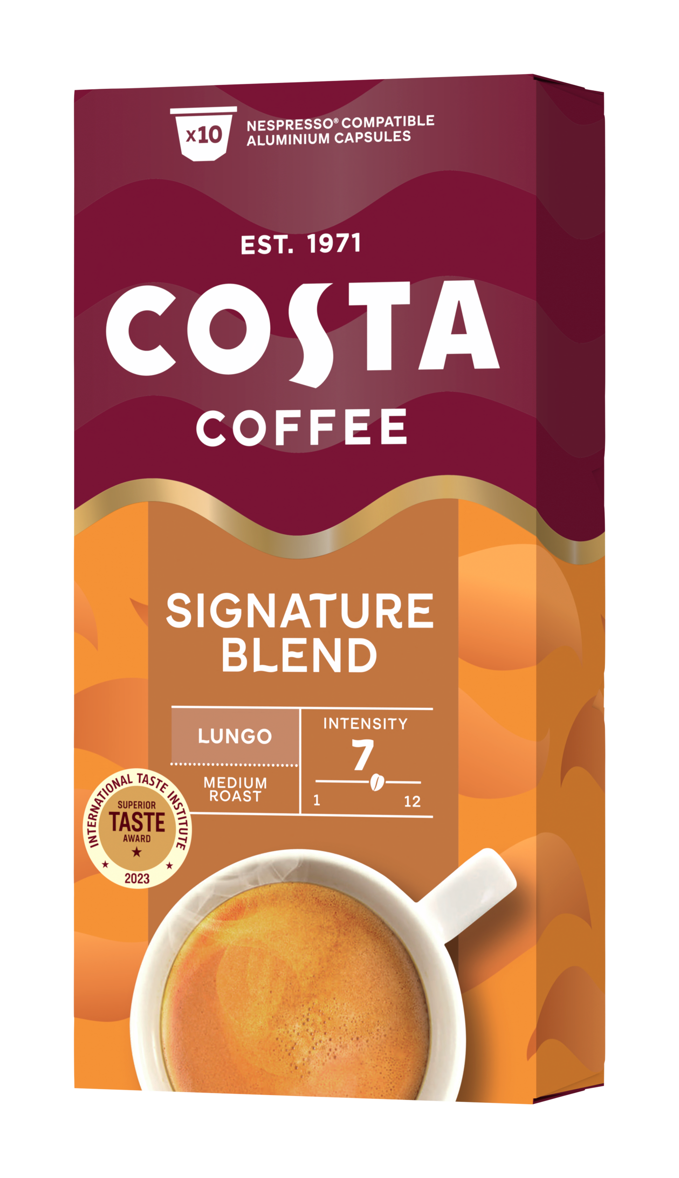 Signature Blend Lungo Costa Coffee je harmonicky složená směs zrn arabiky a robusty, má intenzitu 7 z 12, prostě ideální pro každodenní pití kávy.