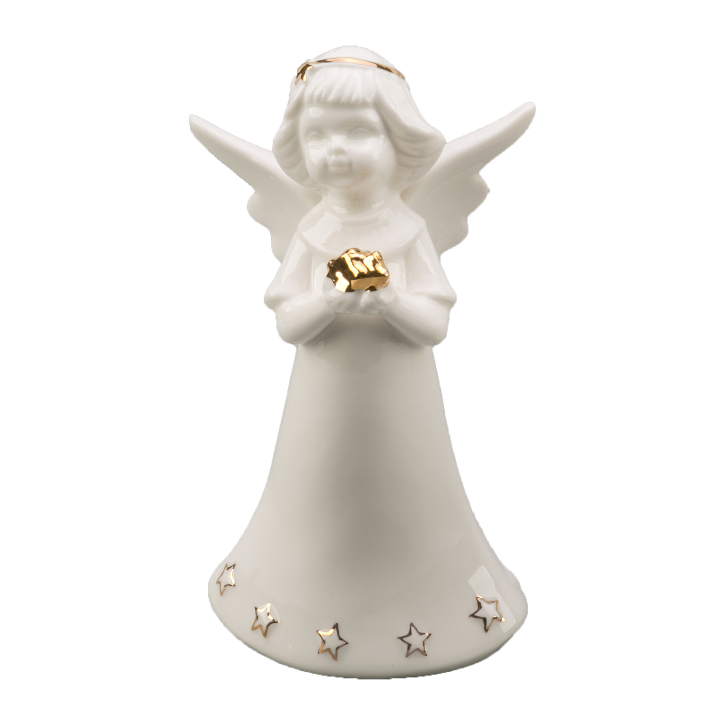 Jemná keramická figurka anděla s hladkým bílým povrchem a zlatými hvězdičkami na spodní části šatu přináší klidnou a slavnostní atmosféru. Anděl drží drobný zlatý objekt a jeho křídla dodávají dekoraci éterický vzhled. Elegantní doplněk vánoční výzdoby vhodný na poličku, stůl nebo jako dárek. Výška: 13 cm