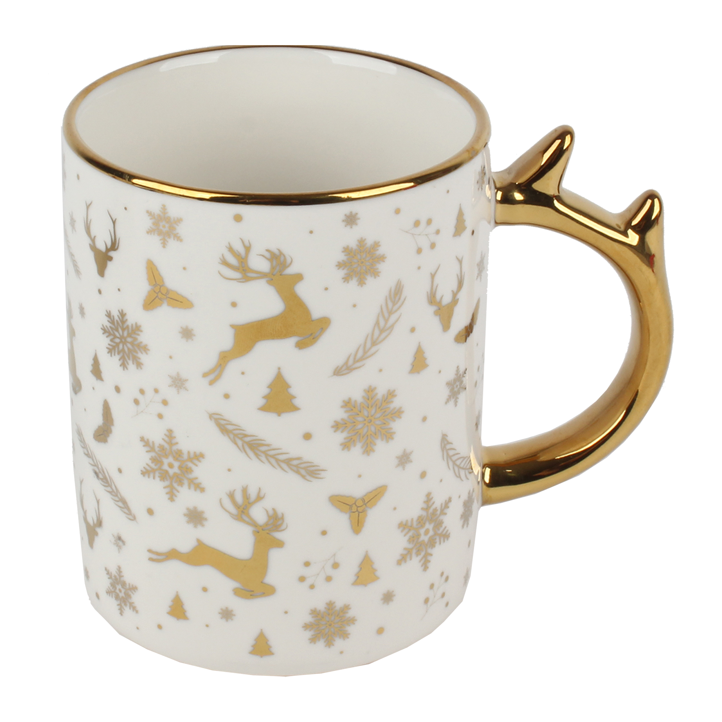 Stylový bílý keramický hrnek s objemem 360 ml ozdobený zlatými motivy sobů, sněhových vloček, stromků a lístků. Originální zlaté ouško ve tvaru parohů dodává hrnku jedinečný vzhled. Ideální pro sváteční chvíle s oblíbeným nápojem – skvělý tip na vánoční dárek.