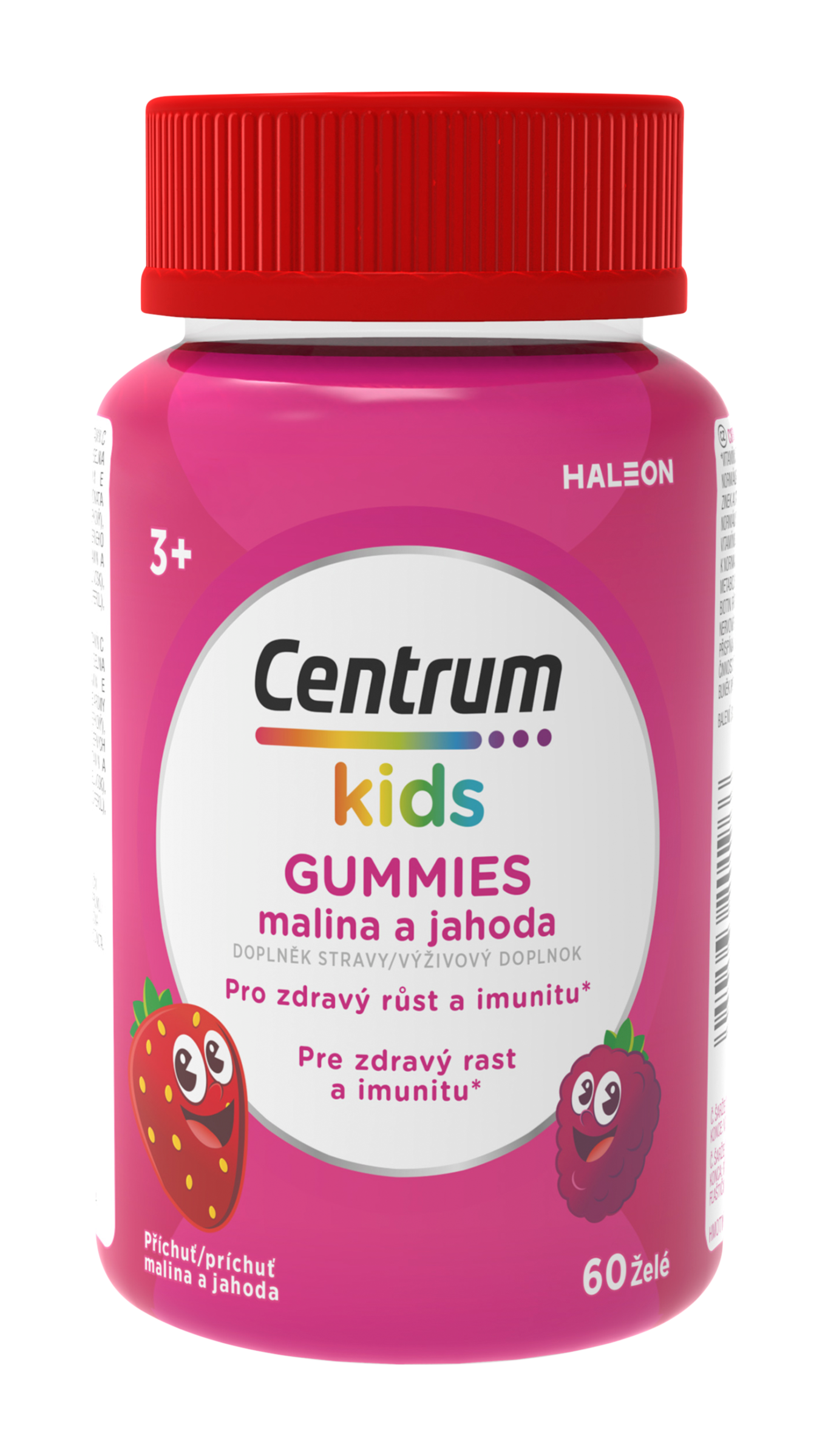 Pro zdravý růst a imunitu* Centrum Kids Gummies obsahují: *vitamín D, který je potřebný pro normální růst a vývin kostí u dětí. Zinek a vitamíny A, C, D přispívají k normální funkci imunitního systému. Vitamíny B₆, B₁₂, biotin a niacin přispívají k normálnímu energetickému metabolismu. Jód a vitamíny C, B₁₂ a biotin přispívají k normální činnosti nervové soustavy. Biotin a niacin přispívají k normální psychické činnosti. Vitamín E přispívá k ochraně buněk před oxidativním stresem.