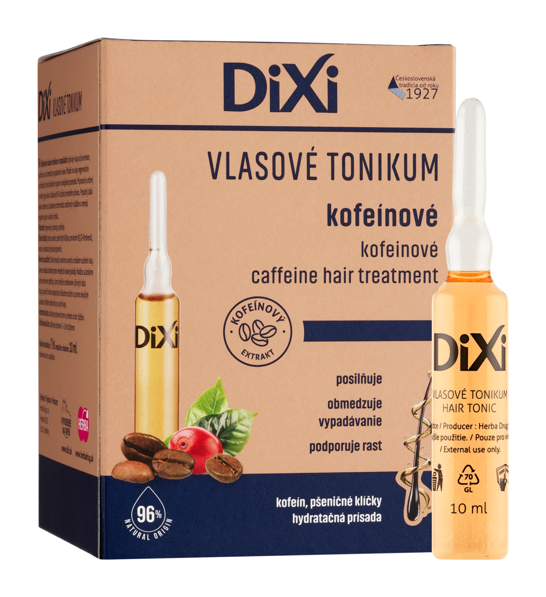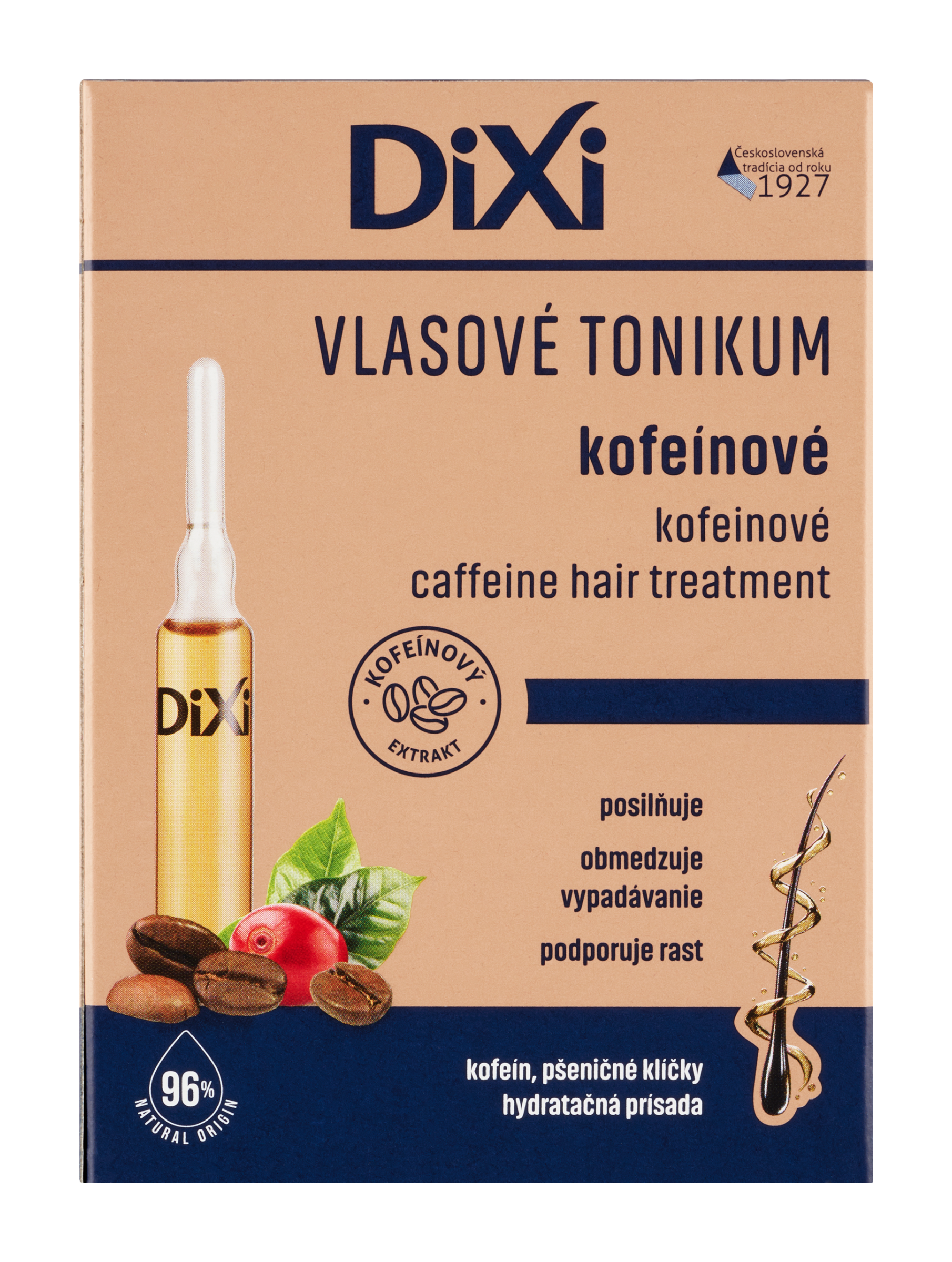 Kofeinové vlasové tonikum v ampulích vyživuje vlasy od kořínků, posiluje jejich růst a omezuje jejich vypadávání. Má regenerační účinek na vlasy a chrání je před škodlivými vlivy vnějšího prostředí. Přípravek je určen pro všechny typy vlasů. Obsahuje 96 % složek přírodního původu. Vlastnosti: regeneruje, hydratuje, posiluje. Účinné složky: kofein, extrakt z pšeničných klíčků, provitamin B5 (D-Panthenol), keratin a hydratační přísada phytantriol.