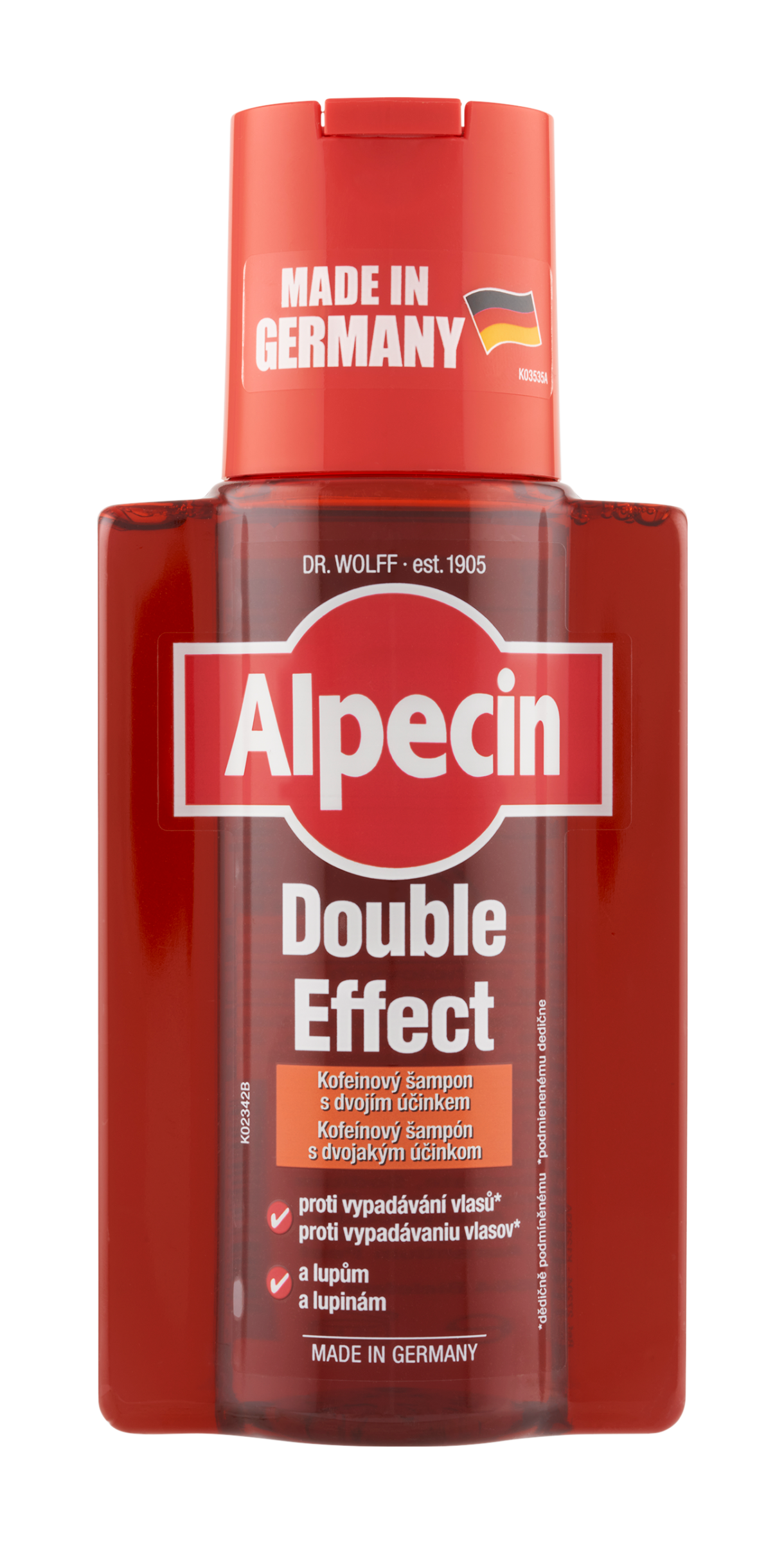 Kofeinový šampon s dvojím účinkem - proti vypadávání vlasů a proti lupům Alpecin Double Effect - kofeinový šampon, který řeší dva problémy najednou. Vyvinutý a vyrobený v Německu. Během první fáze odstraní zrohovatělé odumřelé buňky a vlasovou pokožku důkladně zbaví lupů. Tím pokožku připraví pro kofeinový komplex. Během druhé fáze pronikají účinné látky až k vlasovým kořínkům a zvyšují jejich odolnost vůči dědičně podmíněnému vypadávání vlasů. Složení: kofein, kyselina salicylová, octopirox, zinek, niacin.