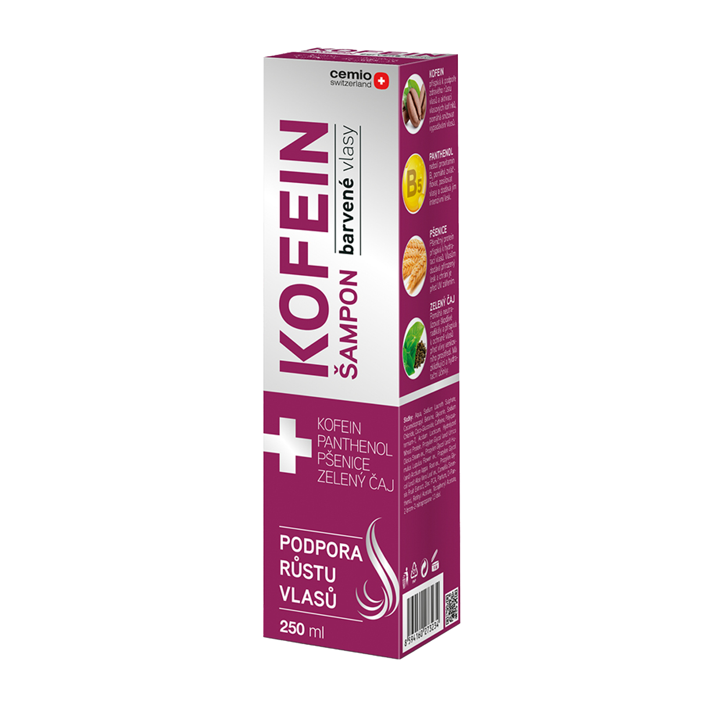 Cemio KOFEIN šampon na barvené vlasy, 250 ml s kofeinem, panthenolem, pšenicí a zeleným čajem přispívá k hydrataci vlasů. Vlasům dodává přirozený lesk a chrání je před UV zářením. Šampon speciálně pro péči o barvené vlasy. Hydratované a silné vlasy. Účinné látky kofein, panthenol, pšenice a zelený čaj. Vhodný na denní použití.
