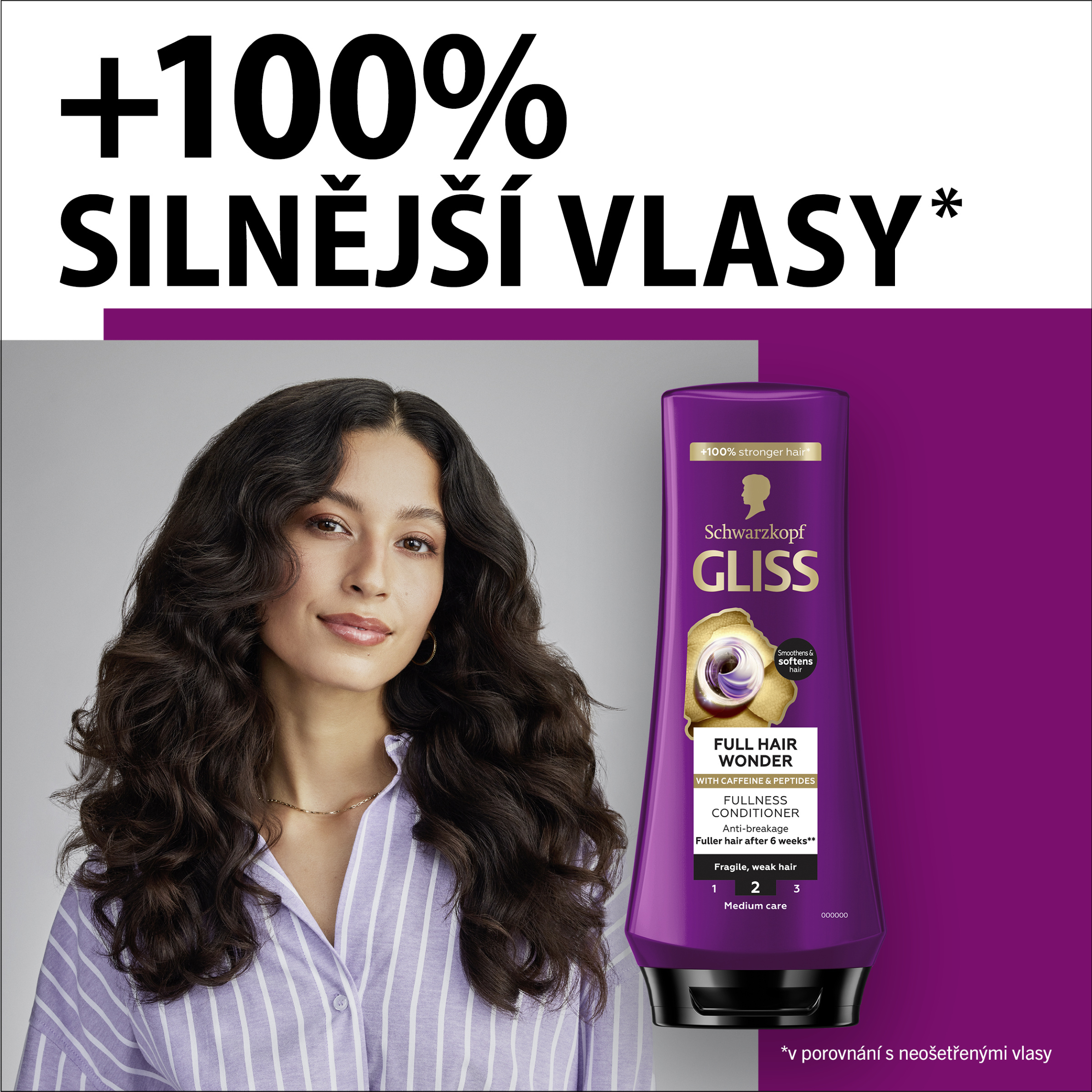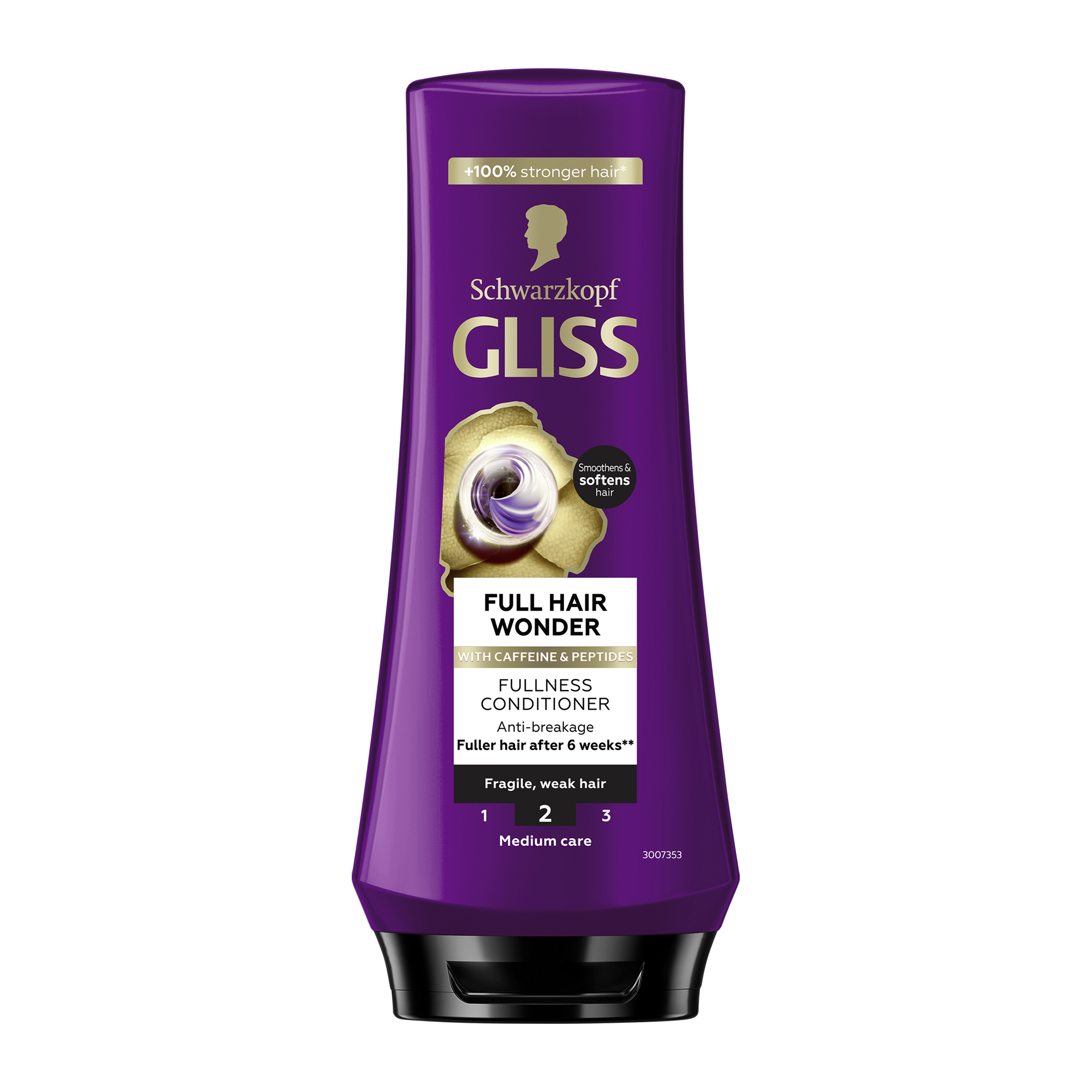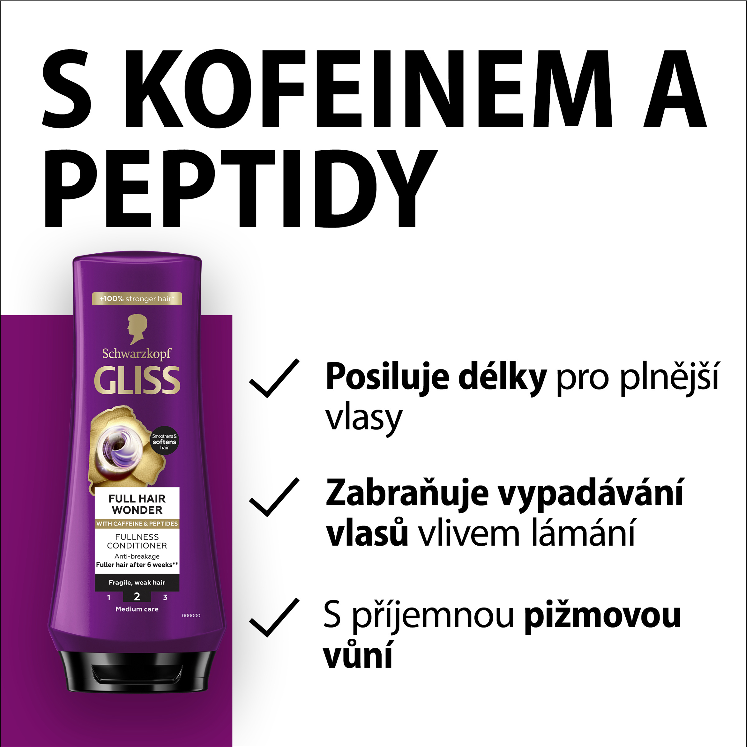 Kondicionér proti lámavosti: Tento kondicionér posiluje délky vlasů, čímž se dosáhne jejich plnosti, a pomáhá předcházet jejich vypadávání v důsledku lámání. Získejte zdravý vzhled vlasů s Gliss Kofein a peptidy: Pro křehké a slabé vlasy je vhodná řada Gliss Full Hair Wonder doplněná o kofein a peptidy, které pečují o vlasy a posilují je, aby byly o 100 % silnější*****