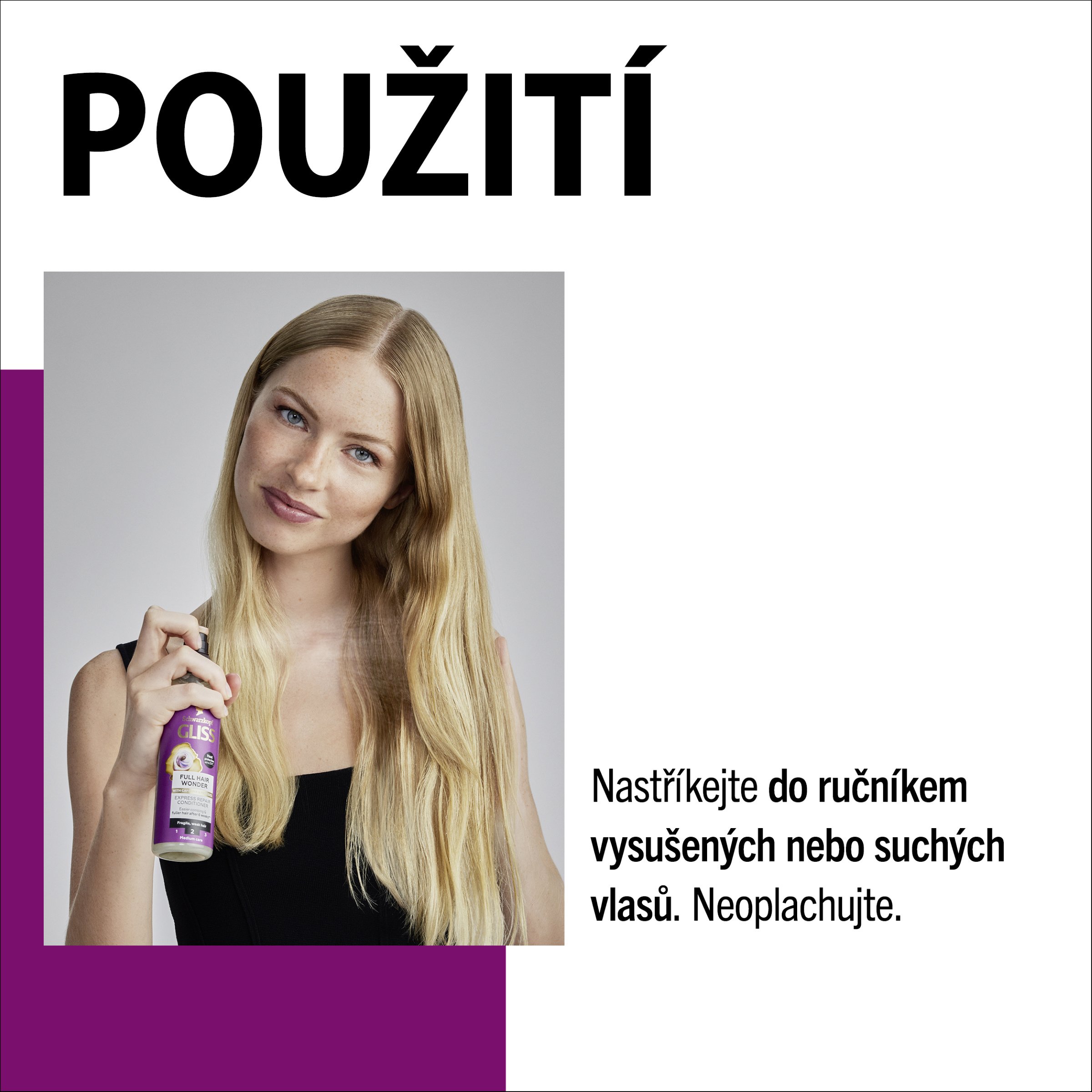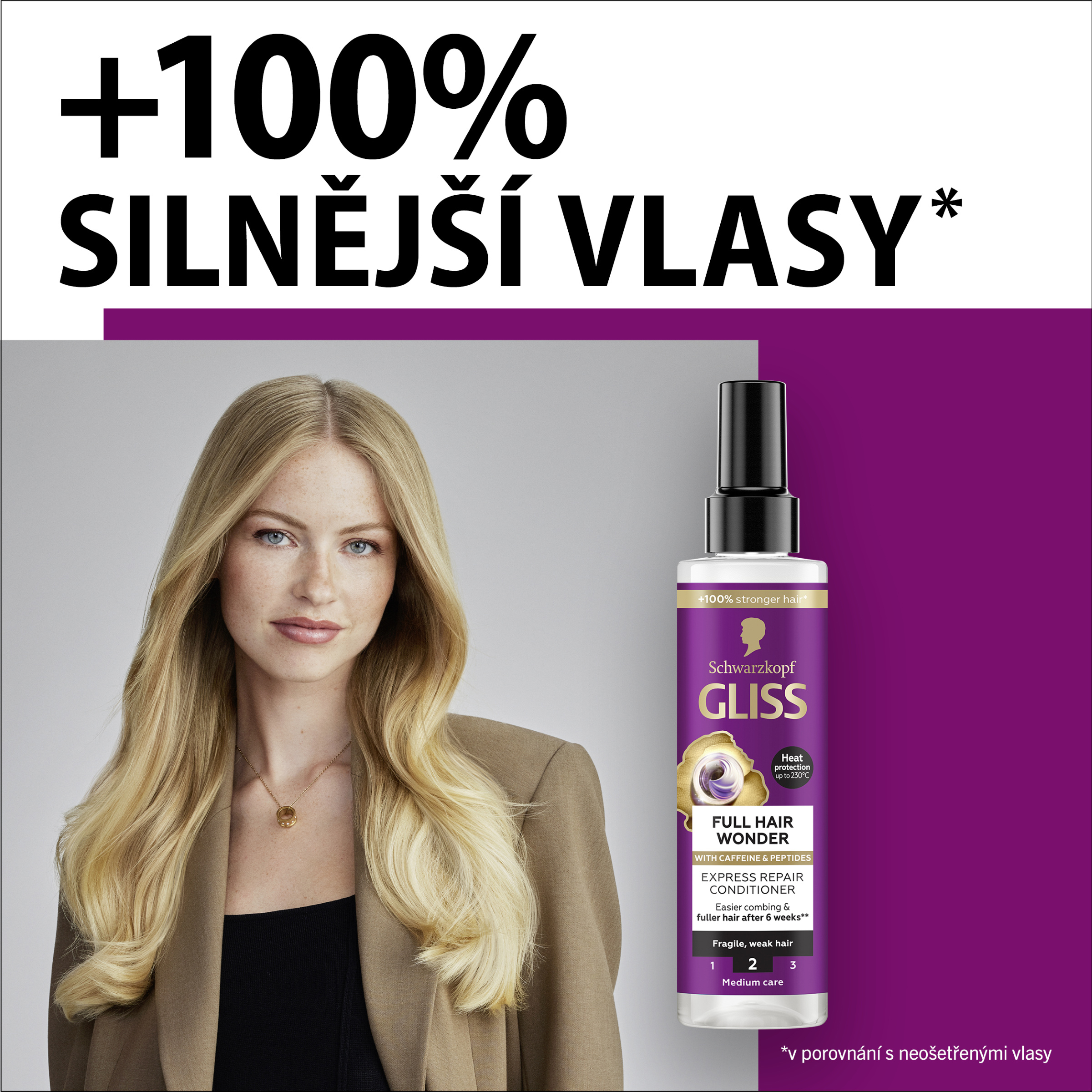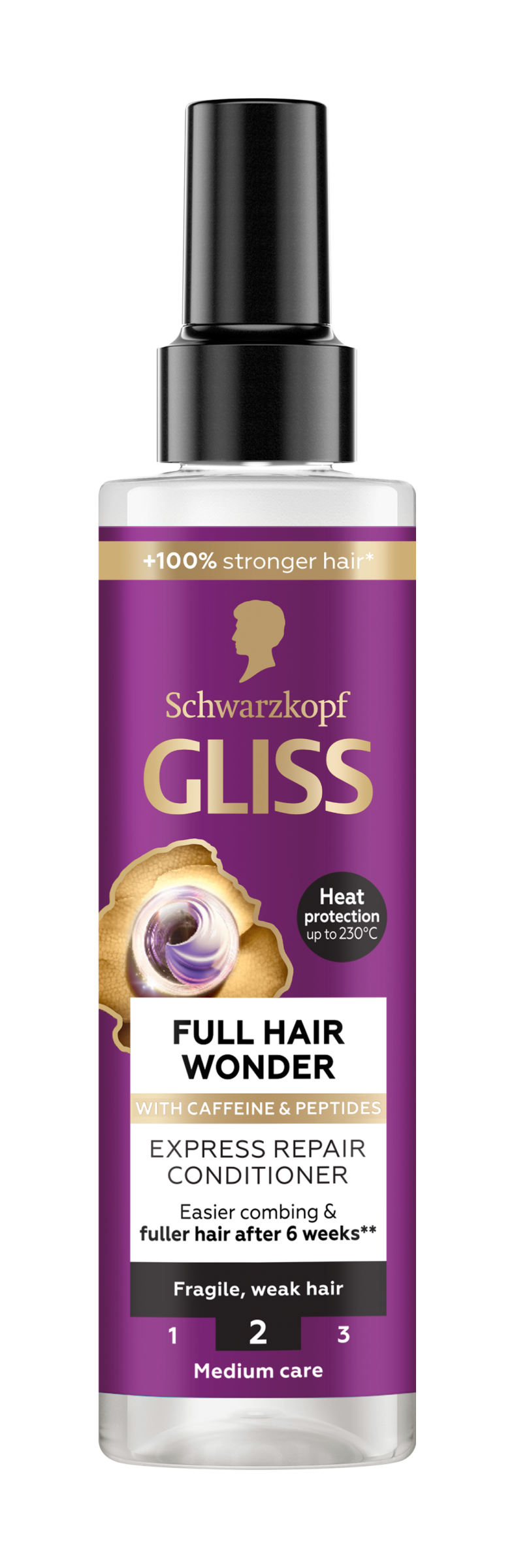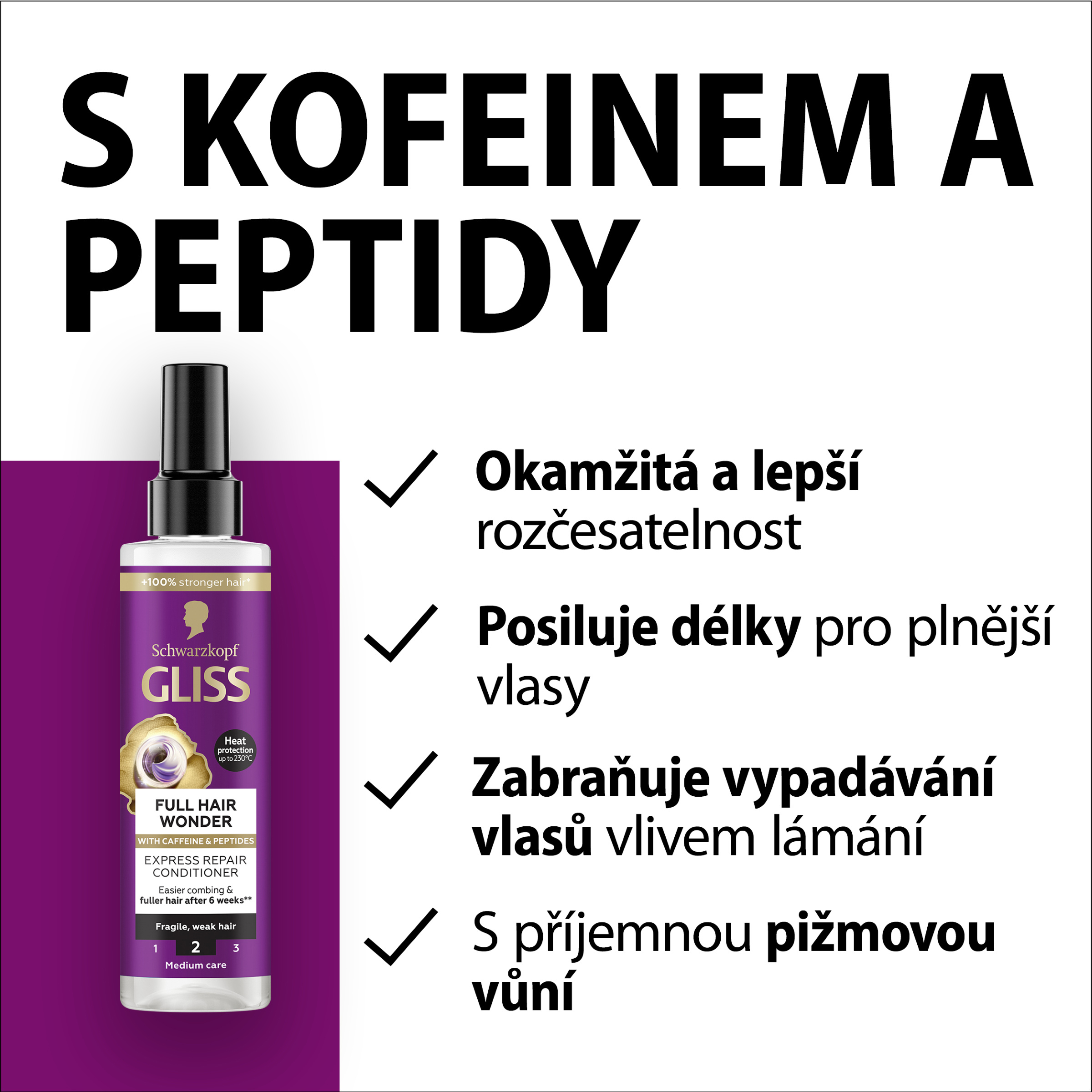 Posilující kondicionér ve spreji: Tento kondicionér na vlasy posiluje délky vlasů, což přispívá k jejich plnosti, a pomáhá předcházet jejich vypadávání v důsledku lámání. Získejte zdravý vzhled vlasů s Gliss Kofein a peptidy: Pro křehké a slabé vlasy je vhodná řada Gliss Full Hair Wonder doplněná o kofein a peptidy, které pečují o vlasy a posilují je, aby byly o 100 % silnější*****