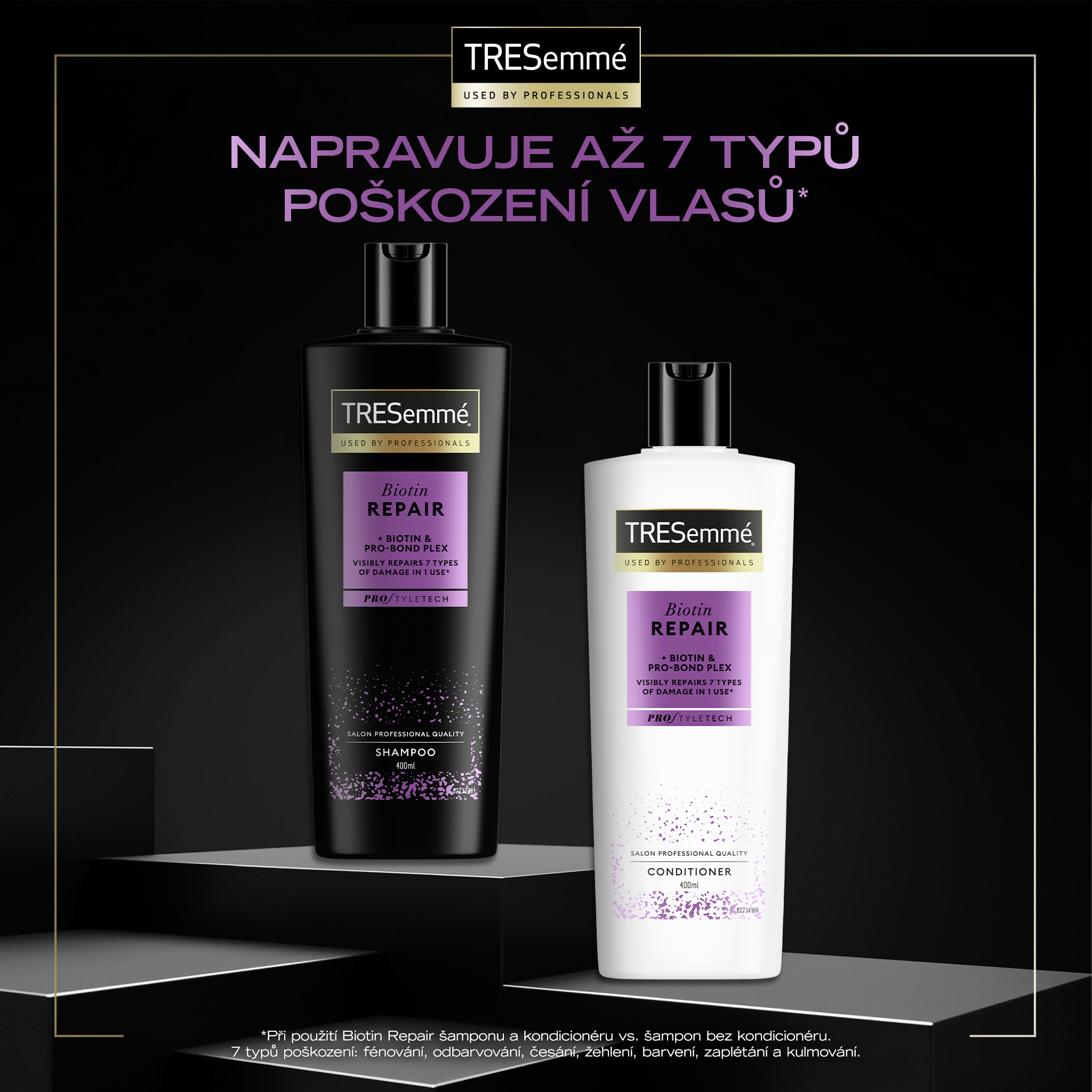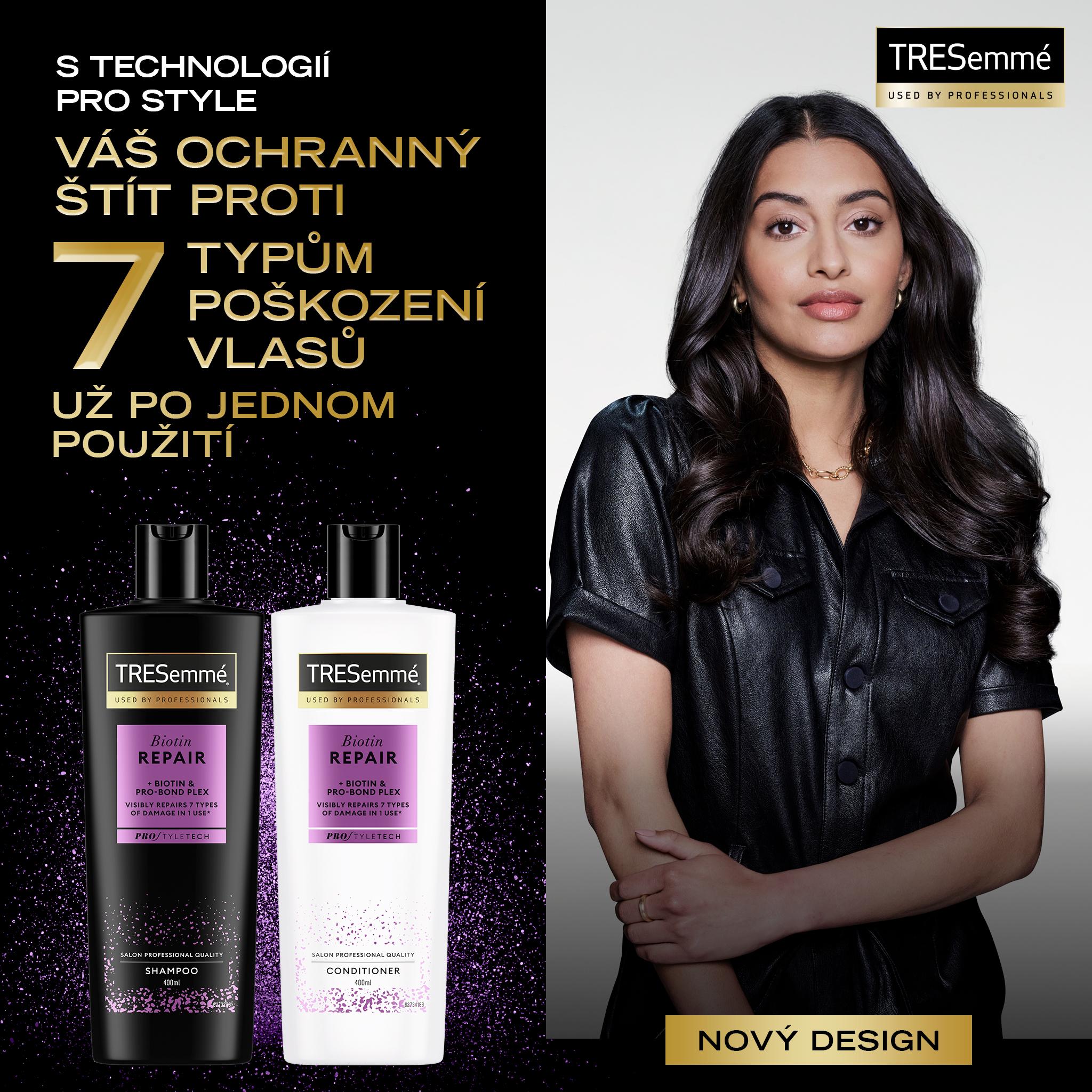 Jak funguje: TRESemmé Biotin Repair šampon a kondicionér tvoří rutinu, která napravuje poškozené vlasy a předchází dalšímu poškozování.