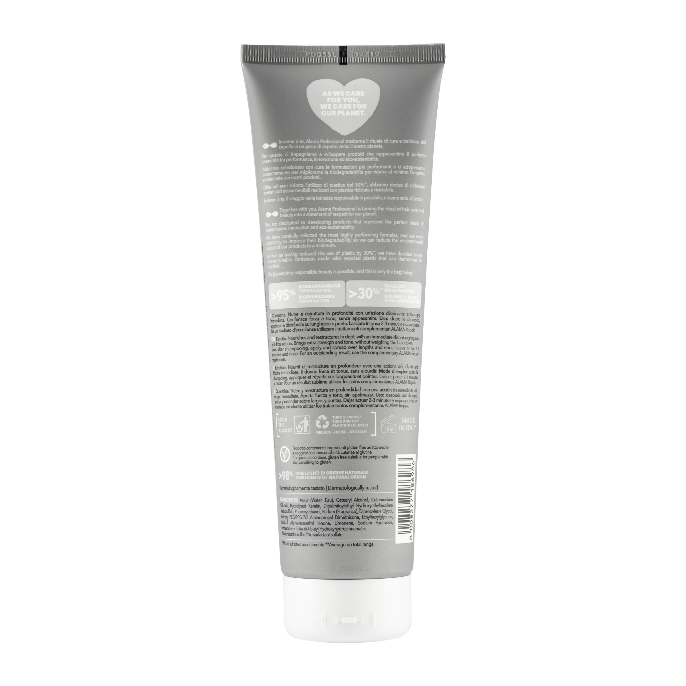 Po použití šamponu naneste a rozetřete po délkách a koncích vlasů. Nechte působit 2-3 minuty a opatrně opláchněte. Aby ste dosáhli vynikající výsledek, použijte doplňkové ošetření ALAMA Repair.