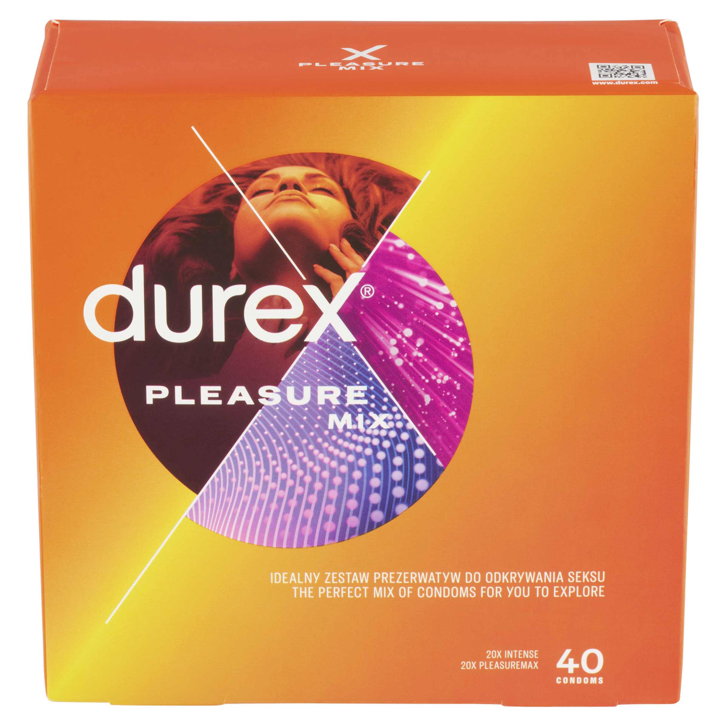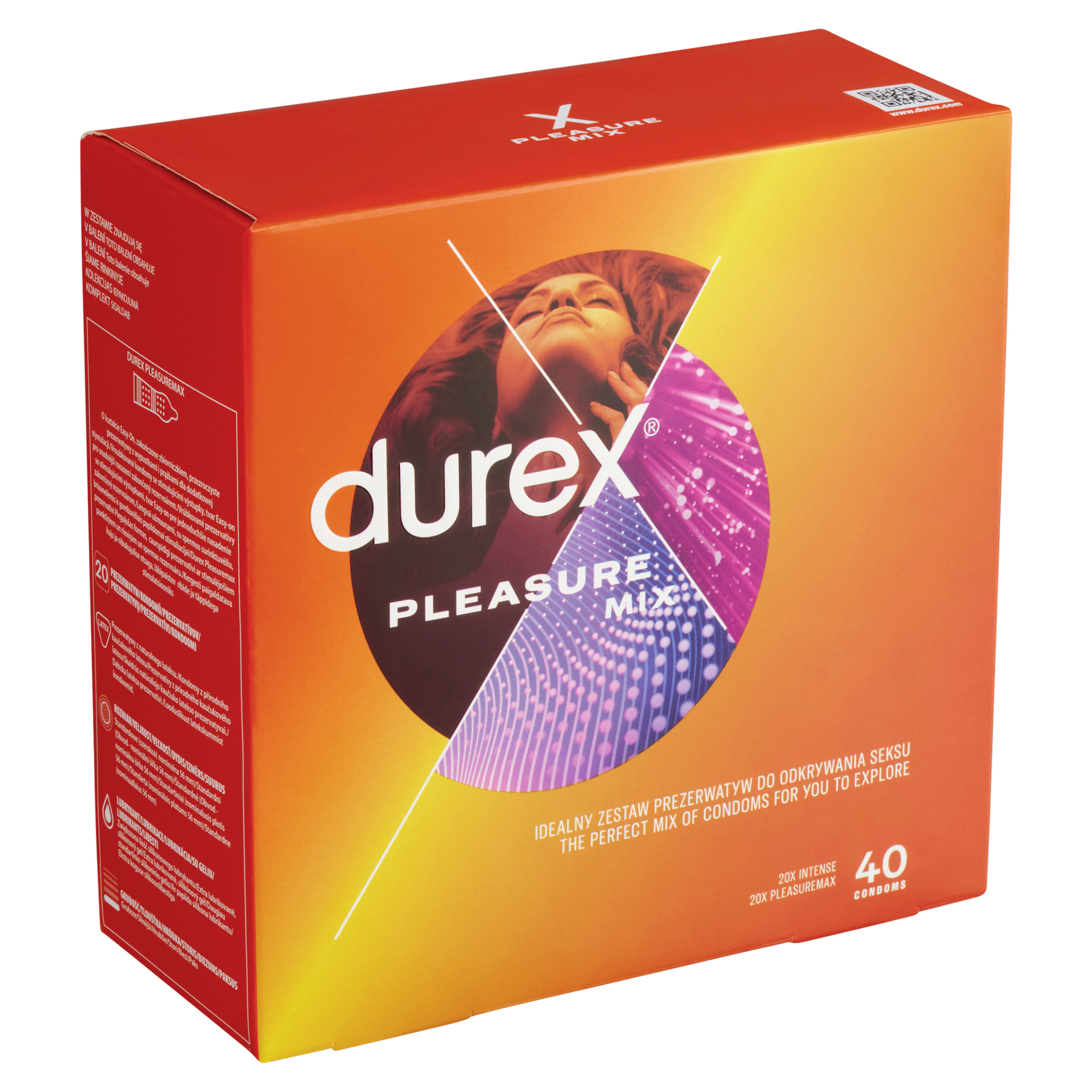 Někdy je zábavné objevit něco nového. Durex Pleasure Mix je sada vybraných kondomů pro skvělou zábavu. Balení obsahuje 20 ks kondomů Intense a 20 ks kondomů Pleasuremax. Použijte kondom, o kterém víte, že je bezpečně nasazený s ohledem na velikost, která vám nejlépe padne. Vroubkované kondomy se stimulujícími výstupky, tvar Easy-on pro snadnější nasazení zakončený rezervoárem. Kondomy z přírodního kaučukového latexu.