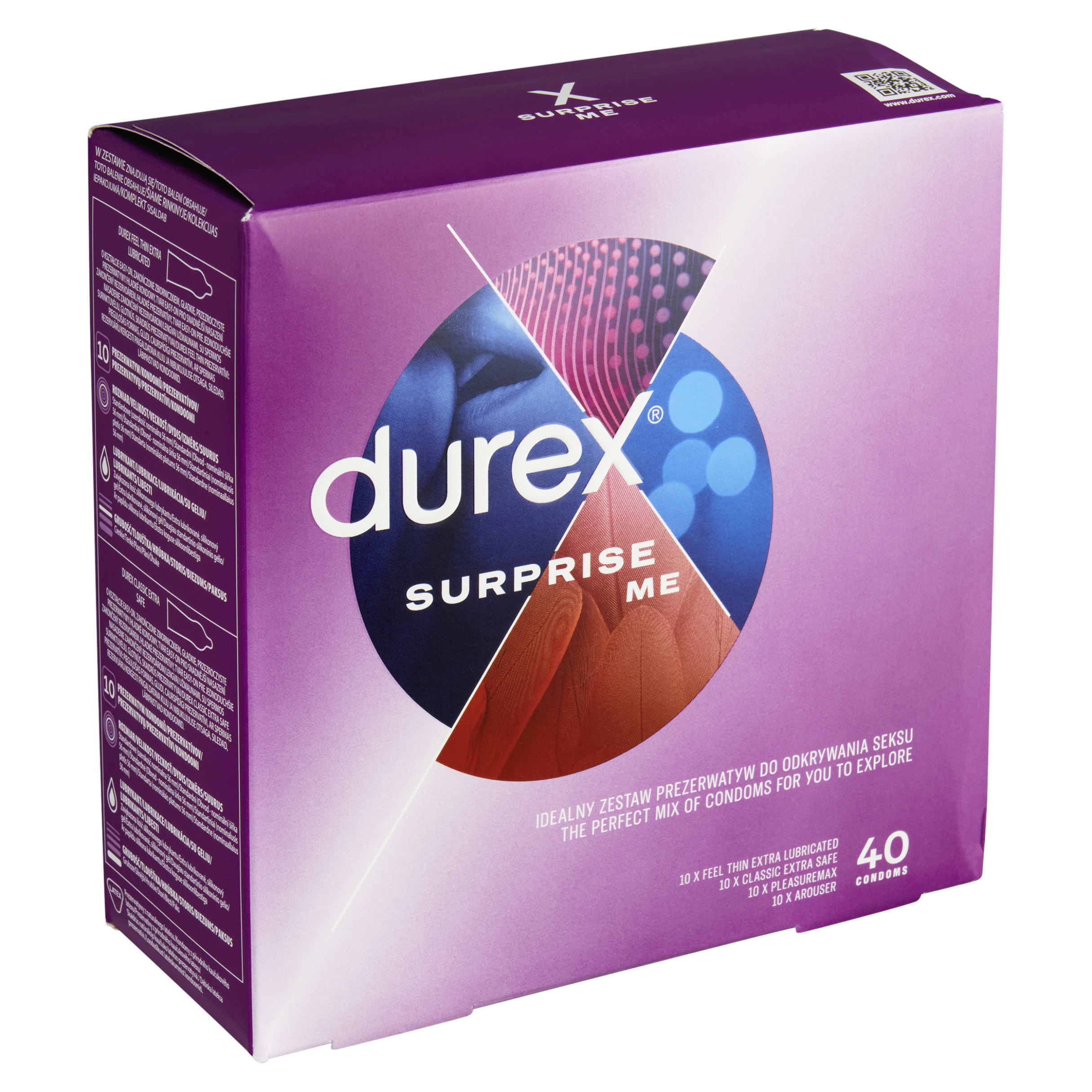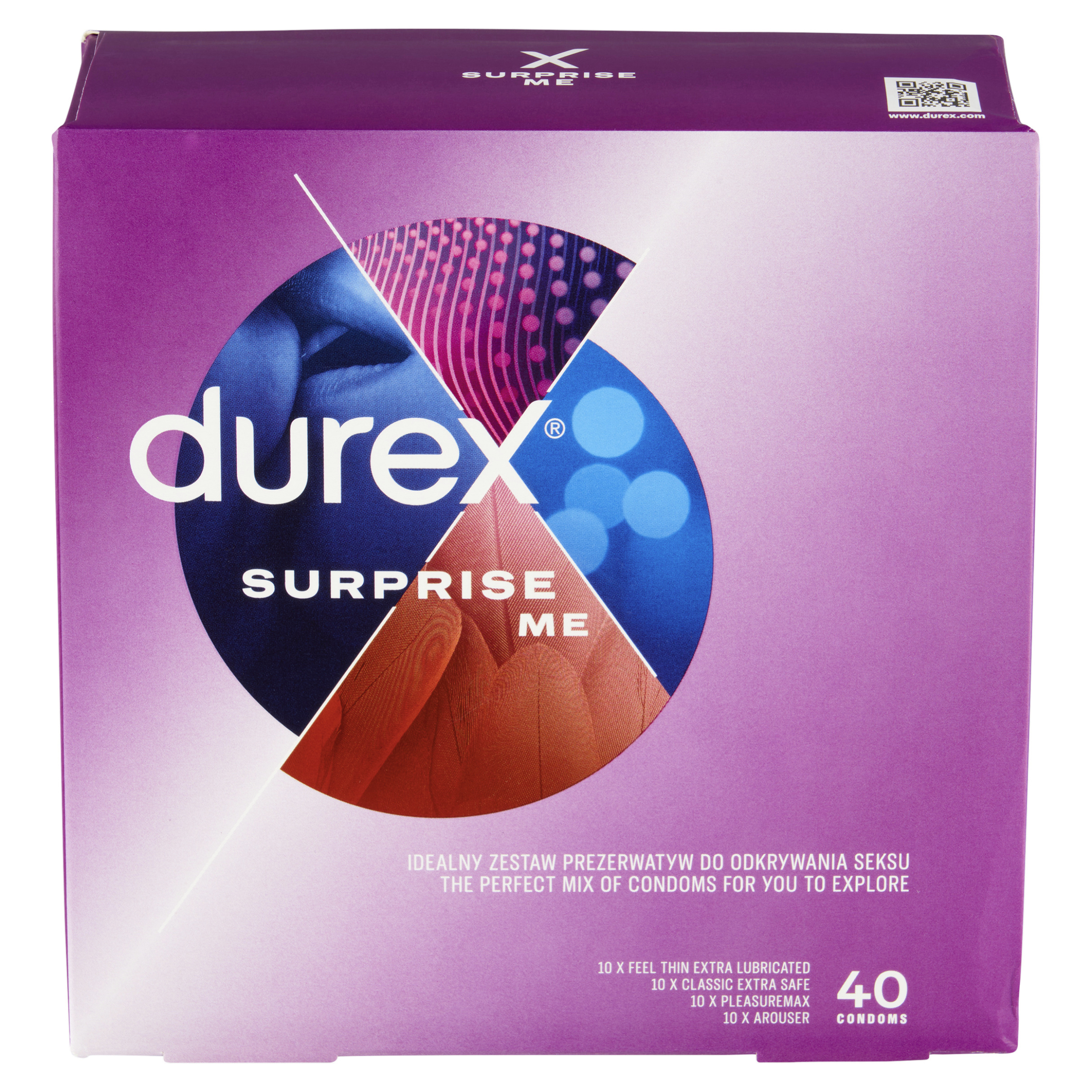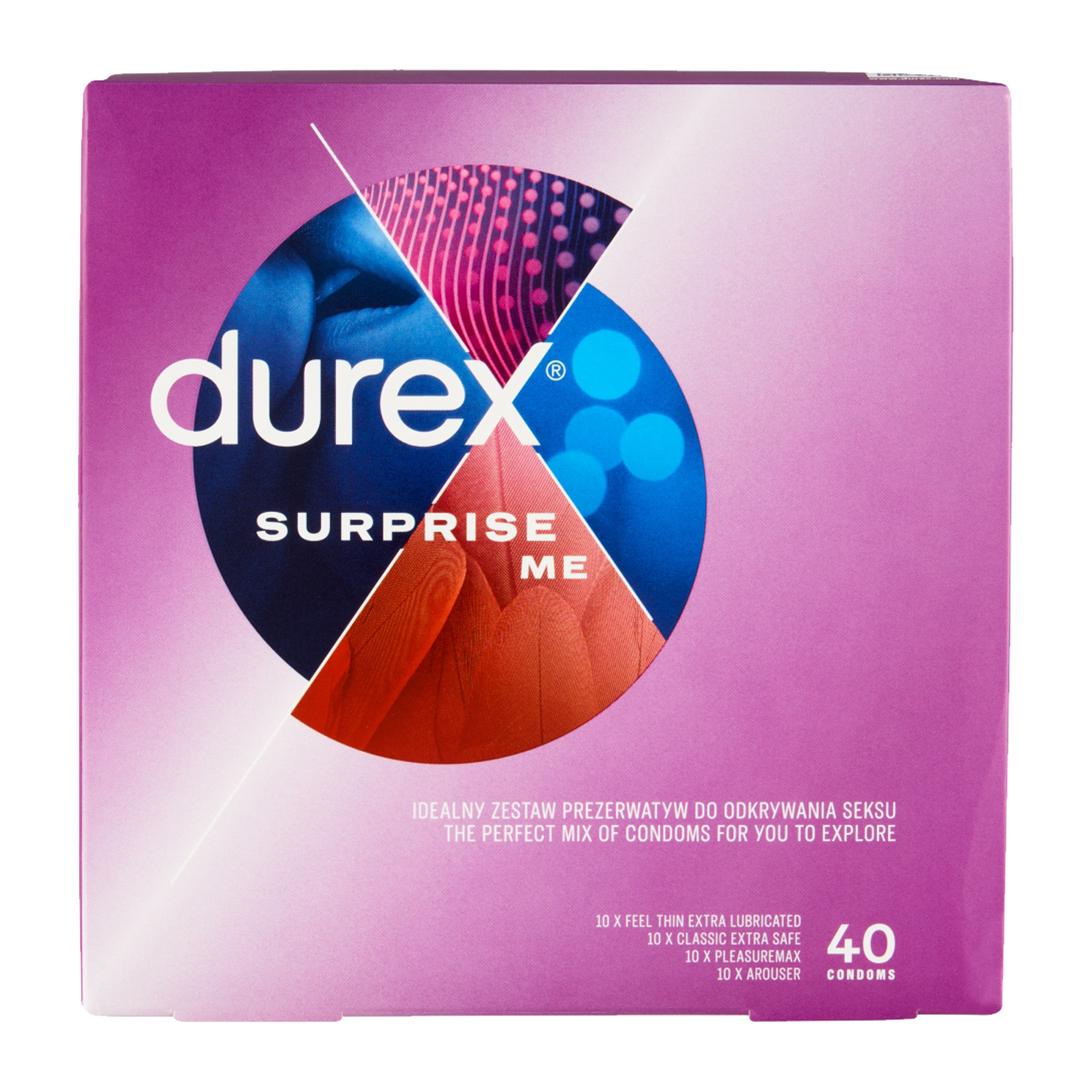 Durex Surprise Me je sada vybraných kondomů pro skvělou zábavu. Balení obsahuje kondomy různých velikostí a tvarů. Použijte kondom, o kterém víte, že je bezpečně nasazený s ohledem na velikost, která vám nejlépe padne.