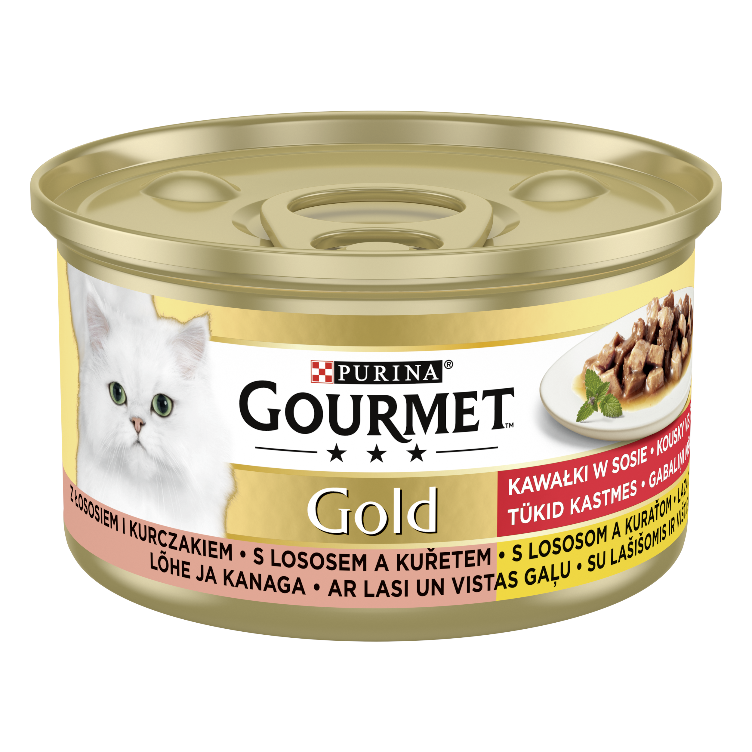 GOURMET Gold kousky ve šťávě jsou jemné kousky s hovězím, kuřecím, lososem a dalšími vynikajícími příchutěmi, jemně povařené k dokonalosti a obklopené lahodnou šťávou tak, aby vaší kočce nabídly potěšení z báječné a plné chuti. Všechna krmiva GOURMET Gold jsou vyrobena z vysoce kvalitních surovin a jsou bez přidaných barviv a umělých konzervantů.